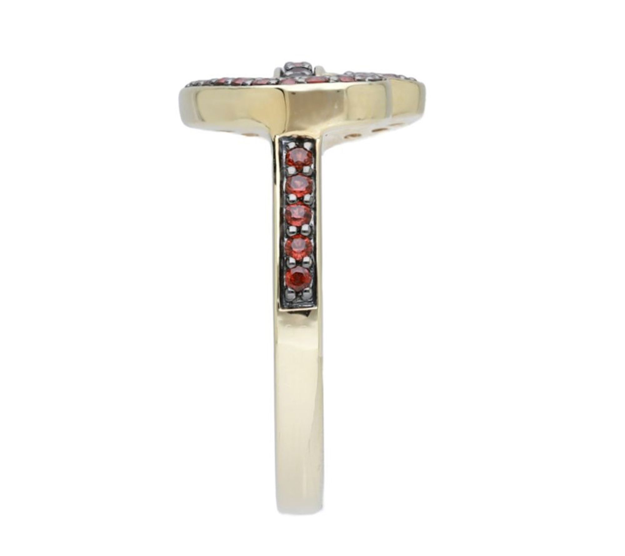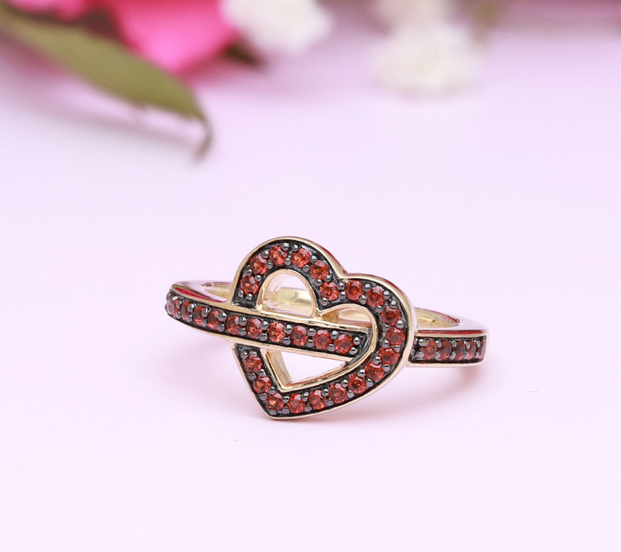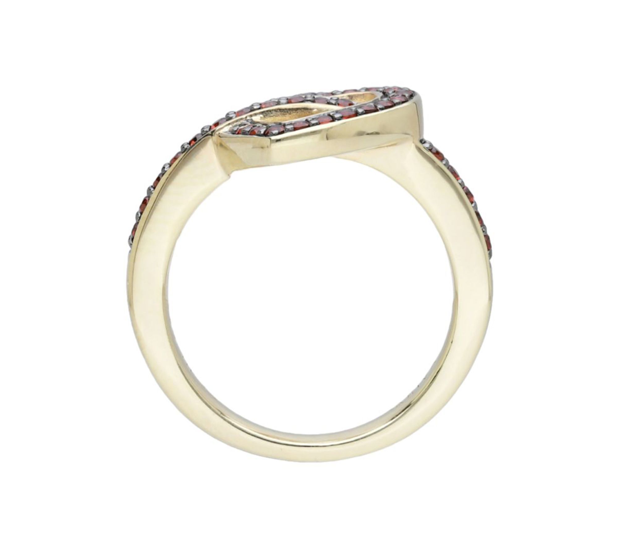 - Open-heart ring with round-cut pave-set garnets on heart and band; polished finish