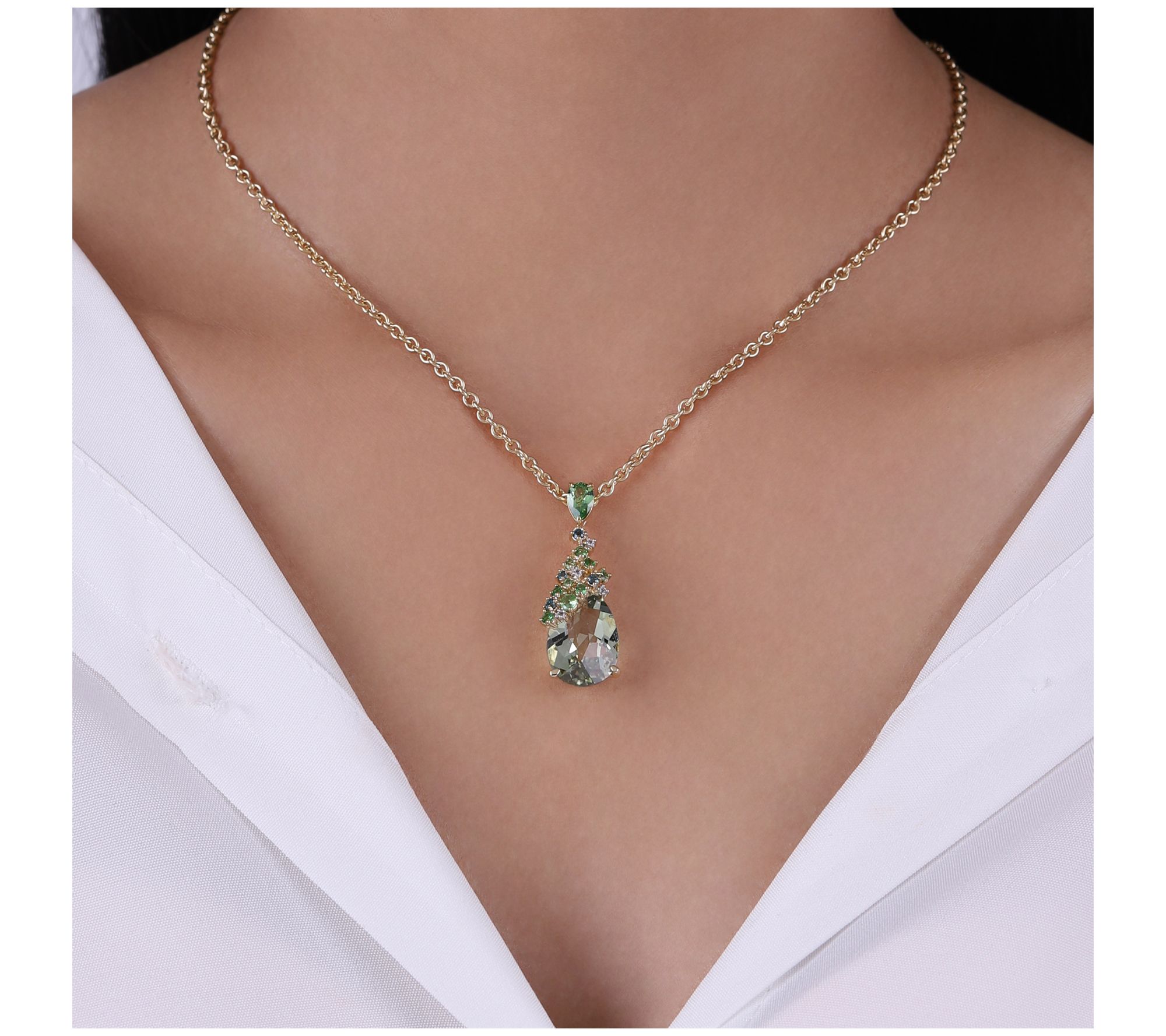 Add a pop of color to any ensemble with this stunning Ariva necklace. Featuring a radiant green mint quartz pendant framed by a mix of tsavorite, London blue topaz, and white topaz gemstones, it brings both elegance and sophistication to your look. From Ariva.