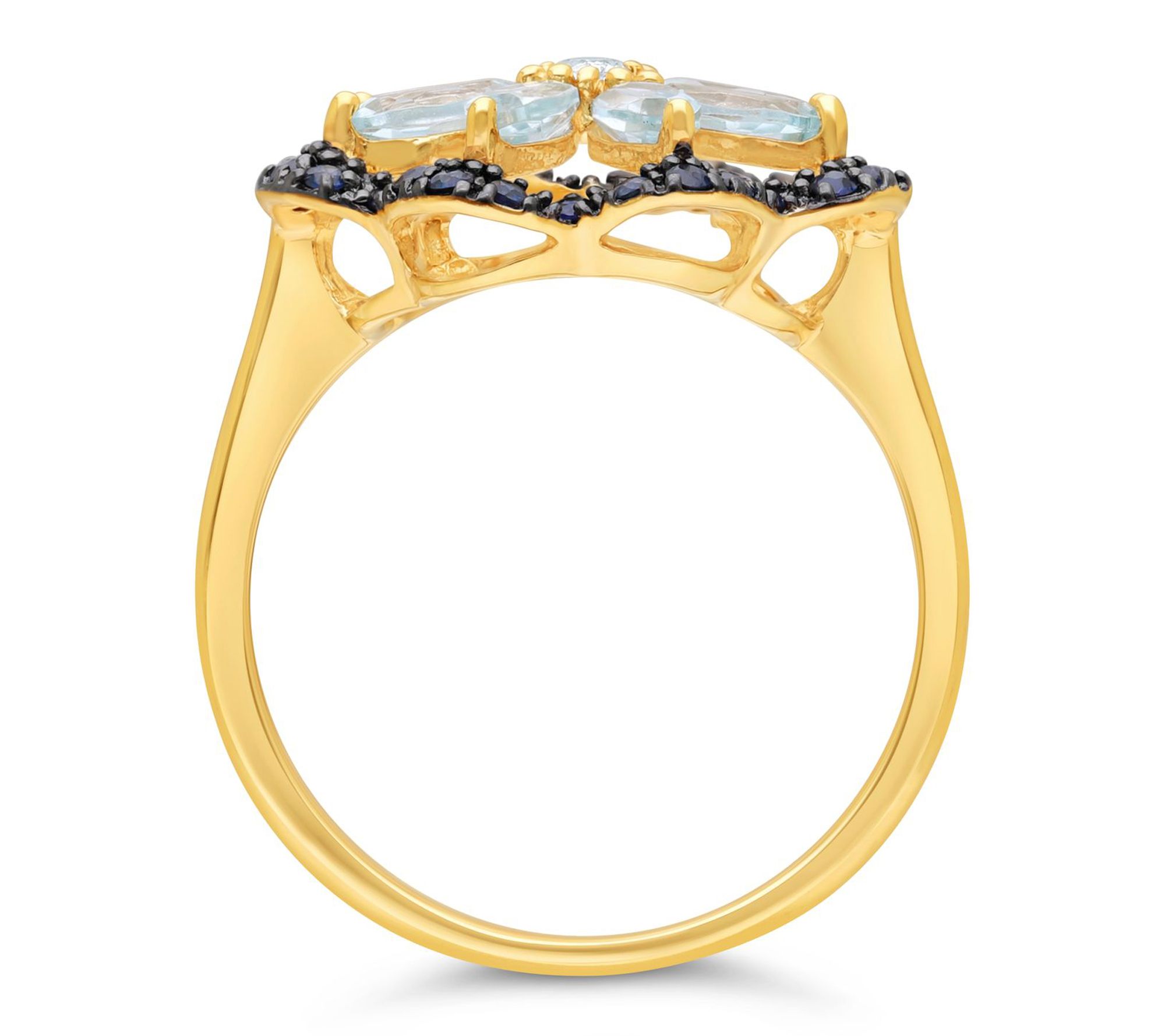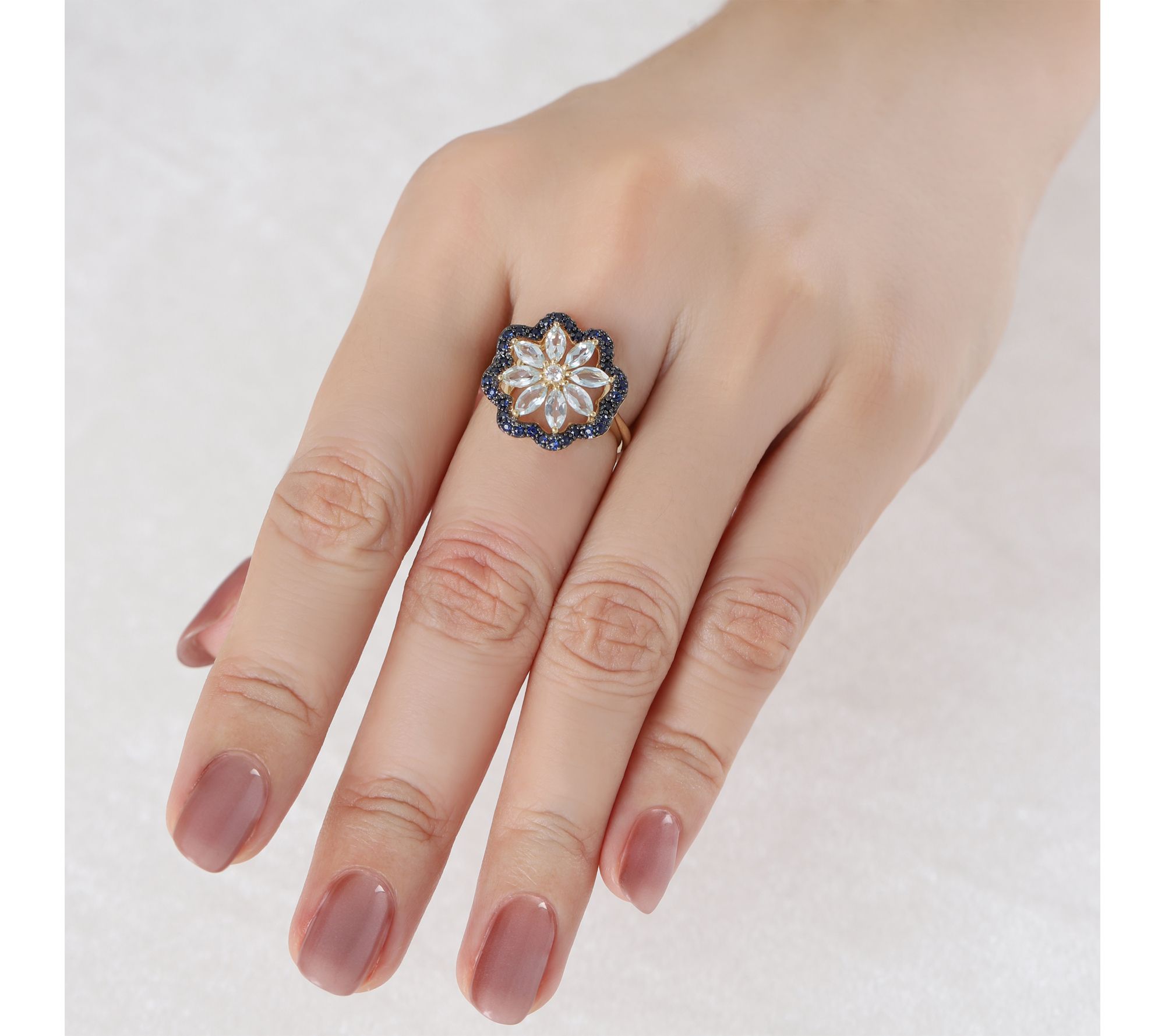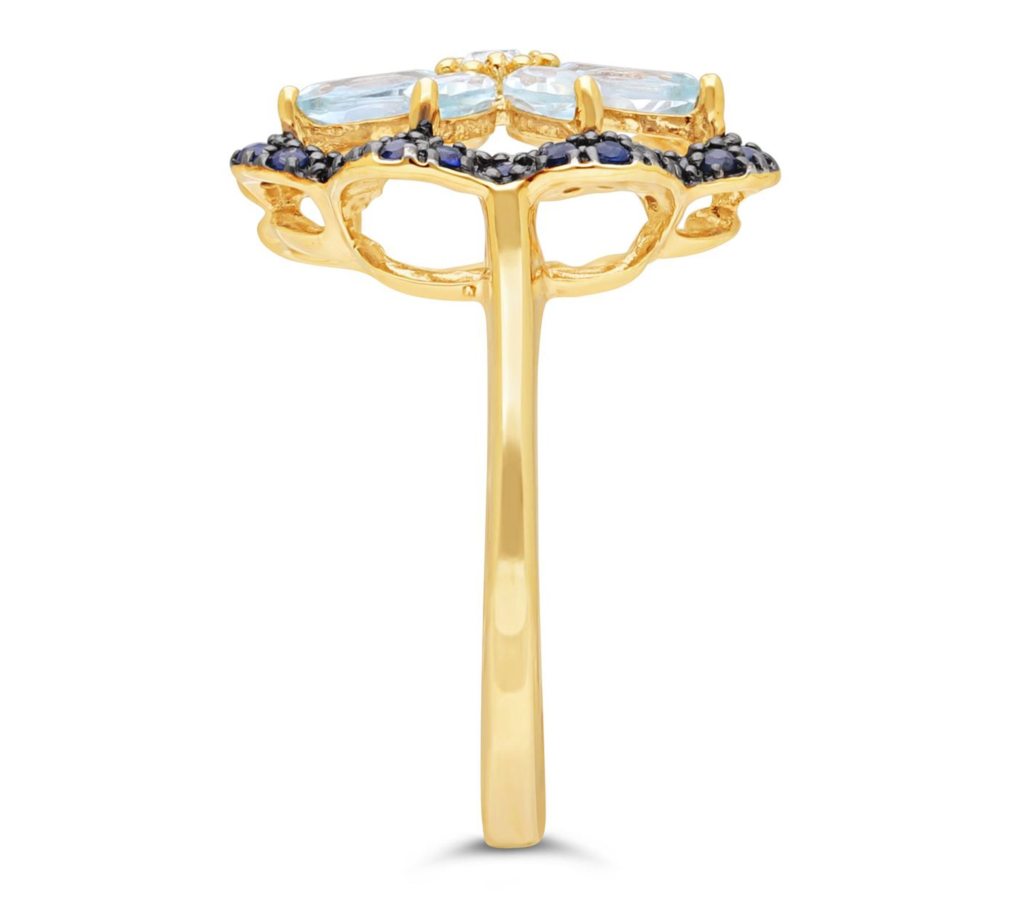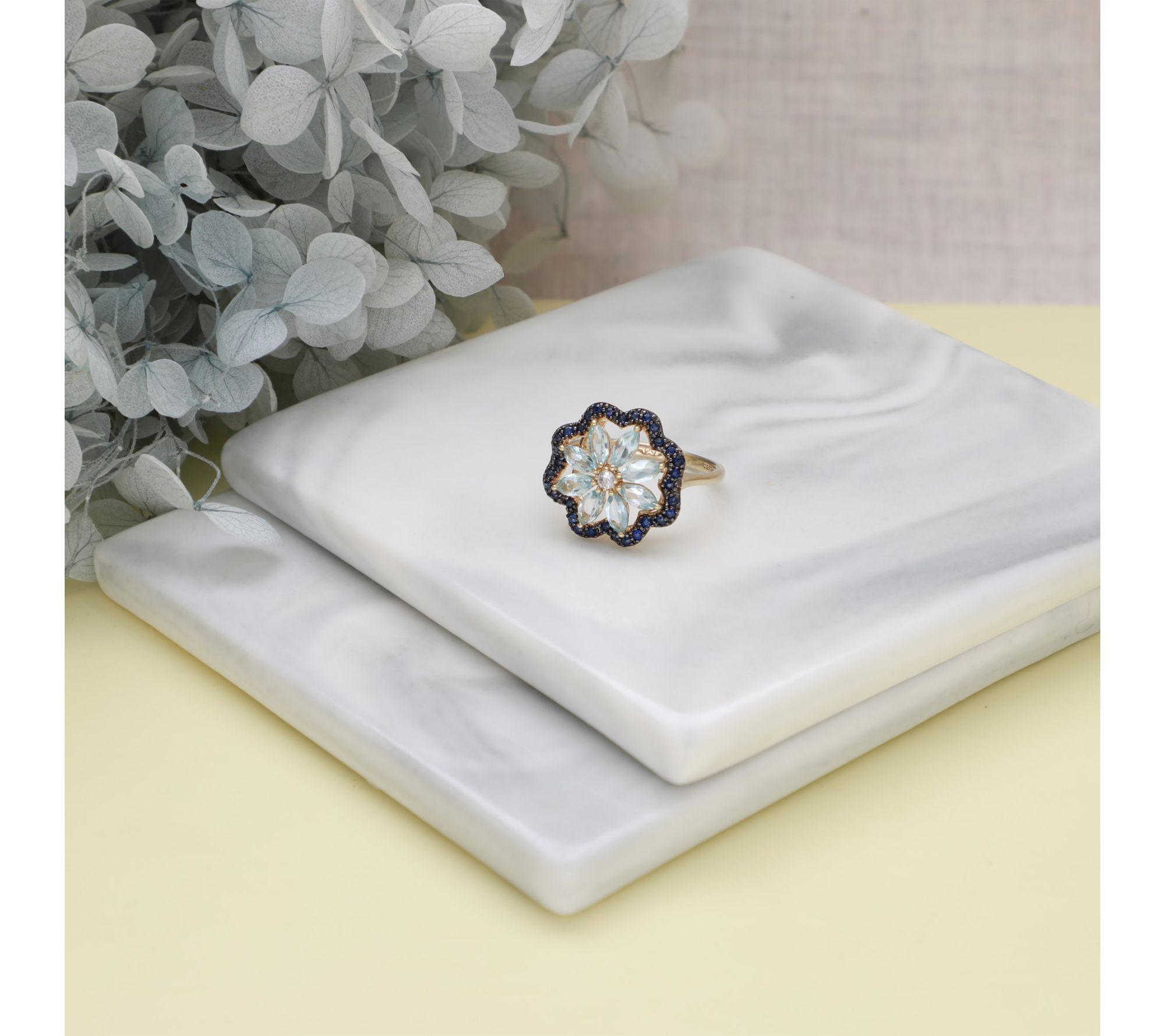 Let your style bloom with this vibrant ring, where marquise-cut sky blue topaz petals and a sparkling white topaz center capture the essence of a fresh garden. Pave-set blue sapphire stones create a graceful curved frame, making it a standout choice for cocktail parties or special evenings. From Ariva.