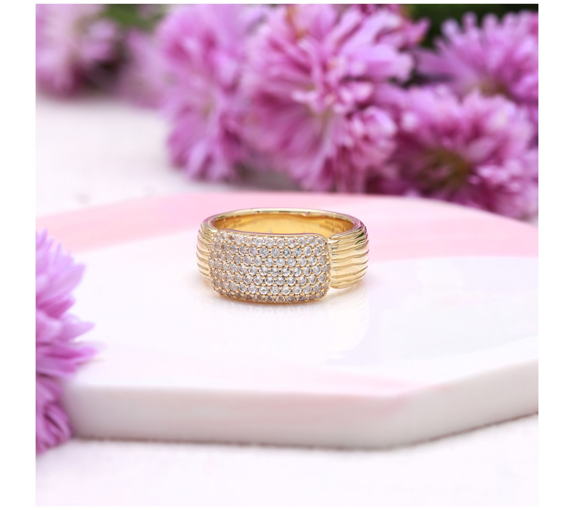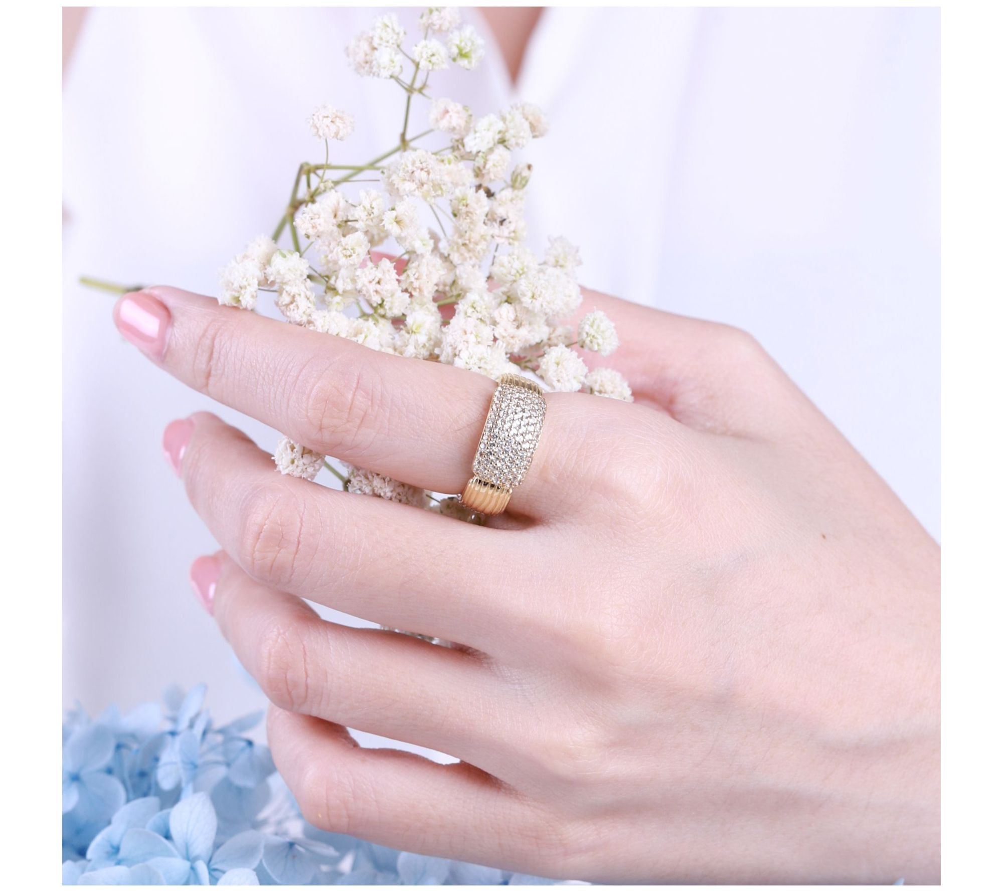 - Round pave-set white topaz; silk textured sides and shank