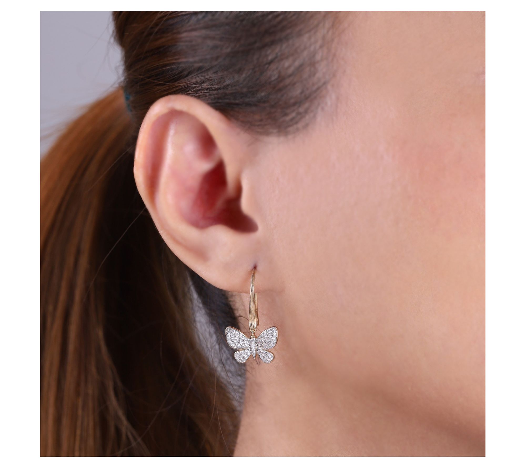 Add a touch of elegance to your look with the Ariva Silver 18K Clad Diamonique Butterfly Earrings. Featuring a silk-textured top and pave-set cubic zirconia Diamonique simulated diamonds in the butterfly wings and body, these earrings are perfect for any occasion. From Ariva.