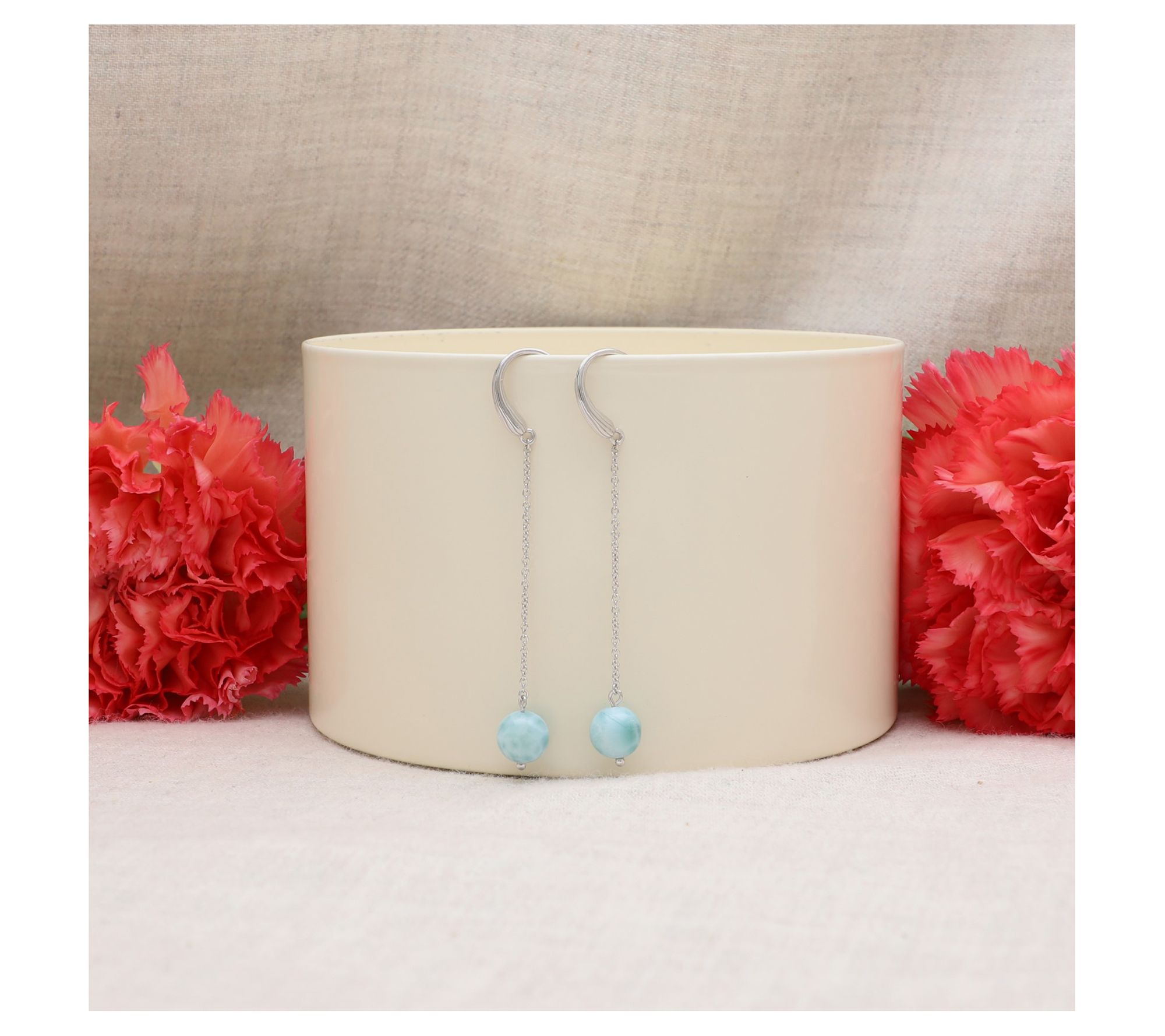 Elevate your style with these stunning drop earrings, featuring a silk-textured top and an larimar bead that gracefully dangles, offering a subtle yet captivating allure. These earrings are available in sterling silver or 18K gold-clad sterling silver, providing versatility to match any outfit. From Ariva.