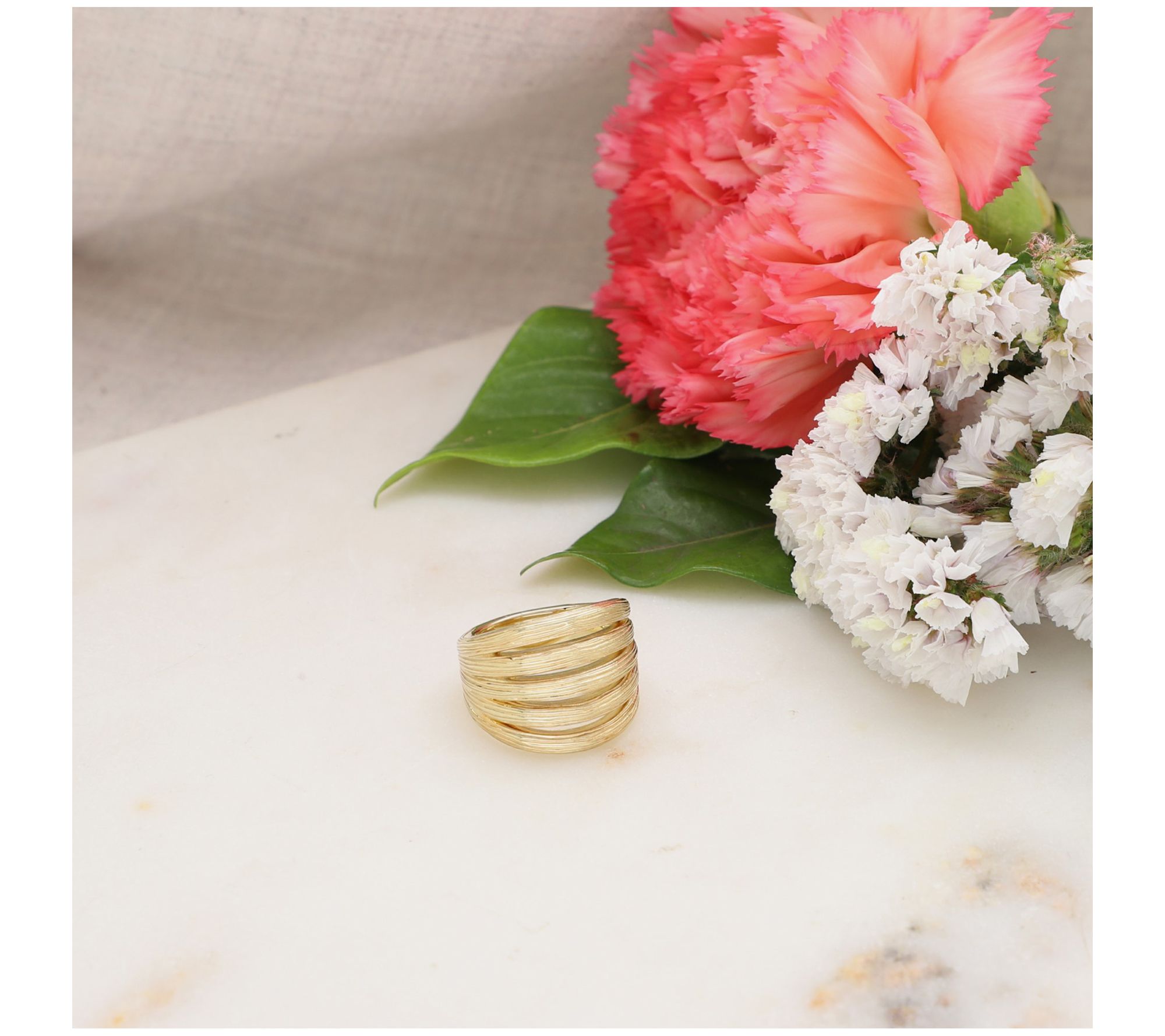 • Textured design with five open rows; silk texture on bands; textured shank