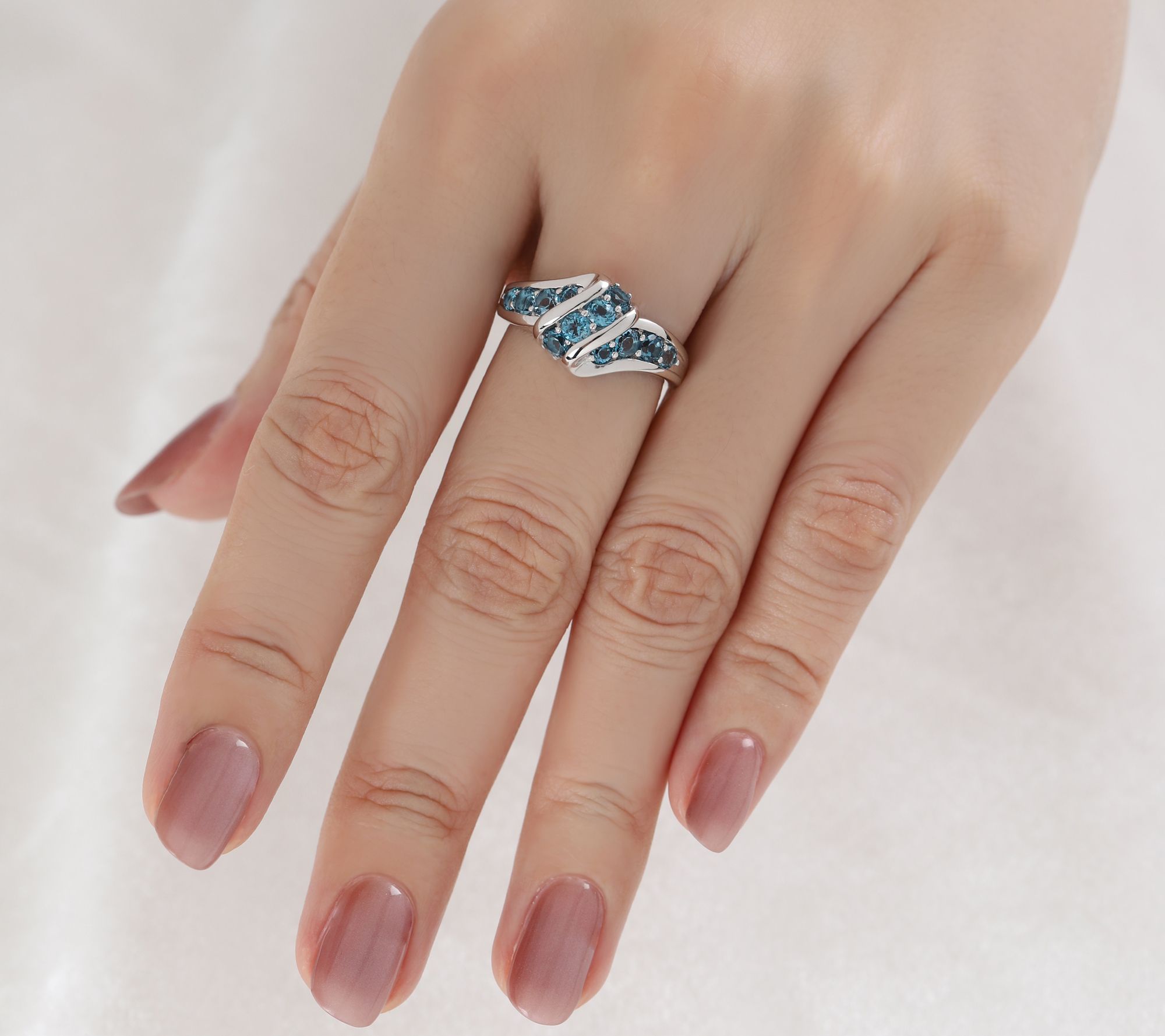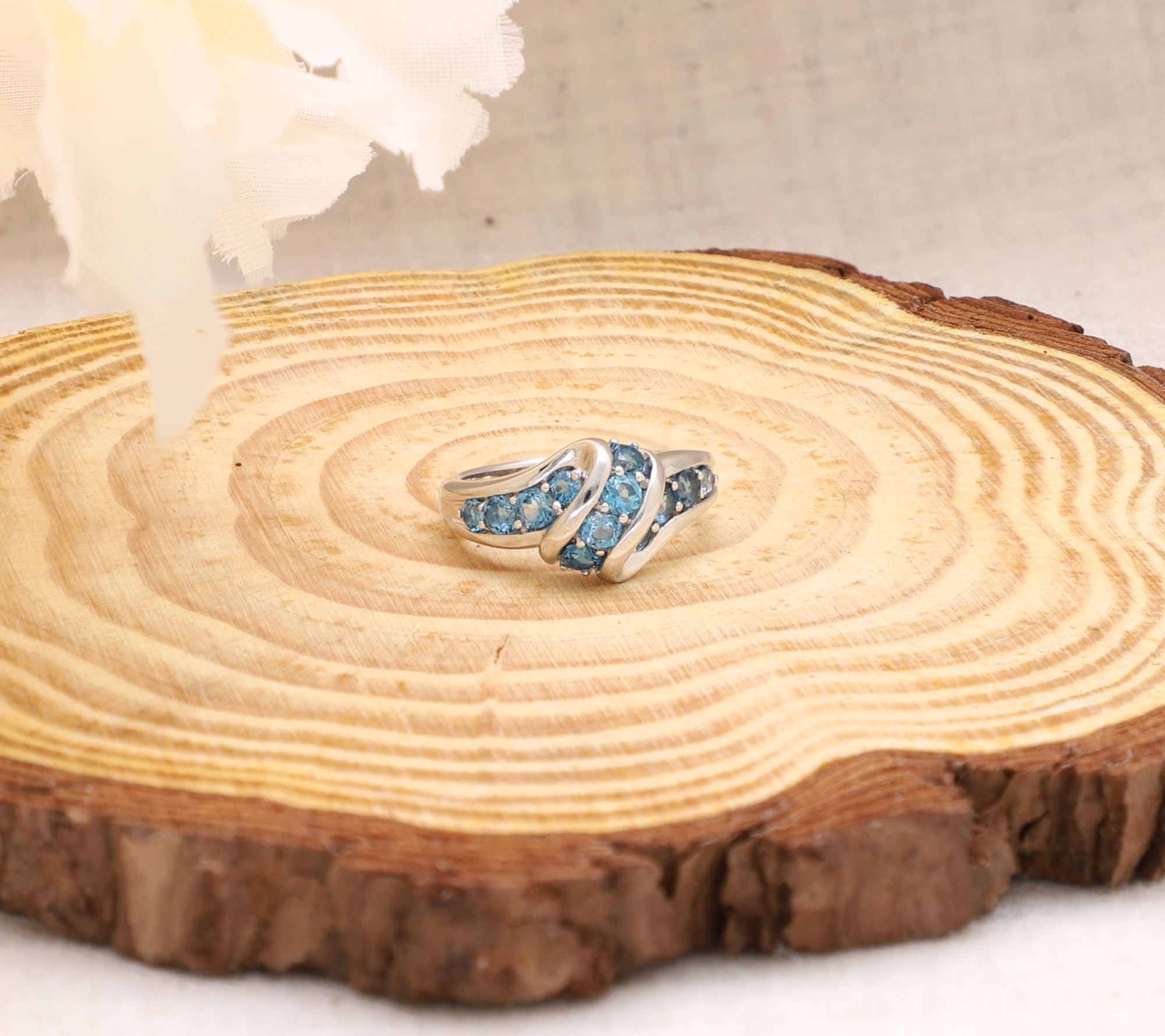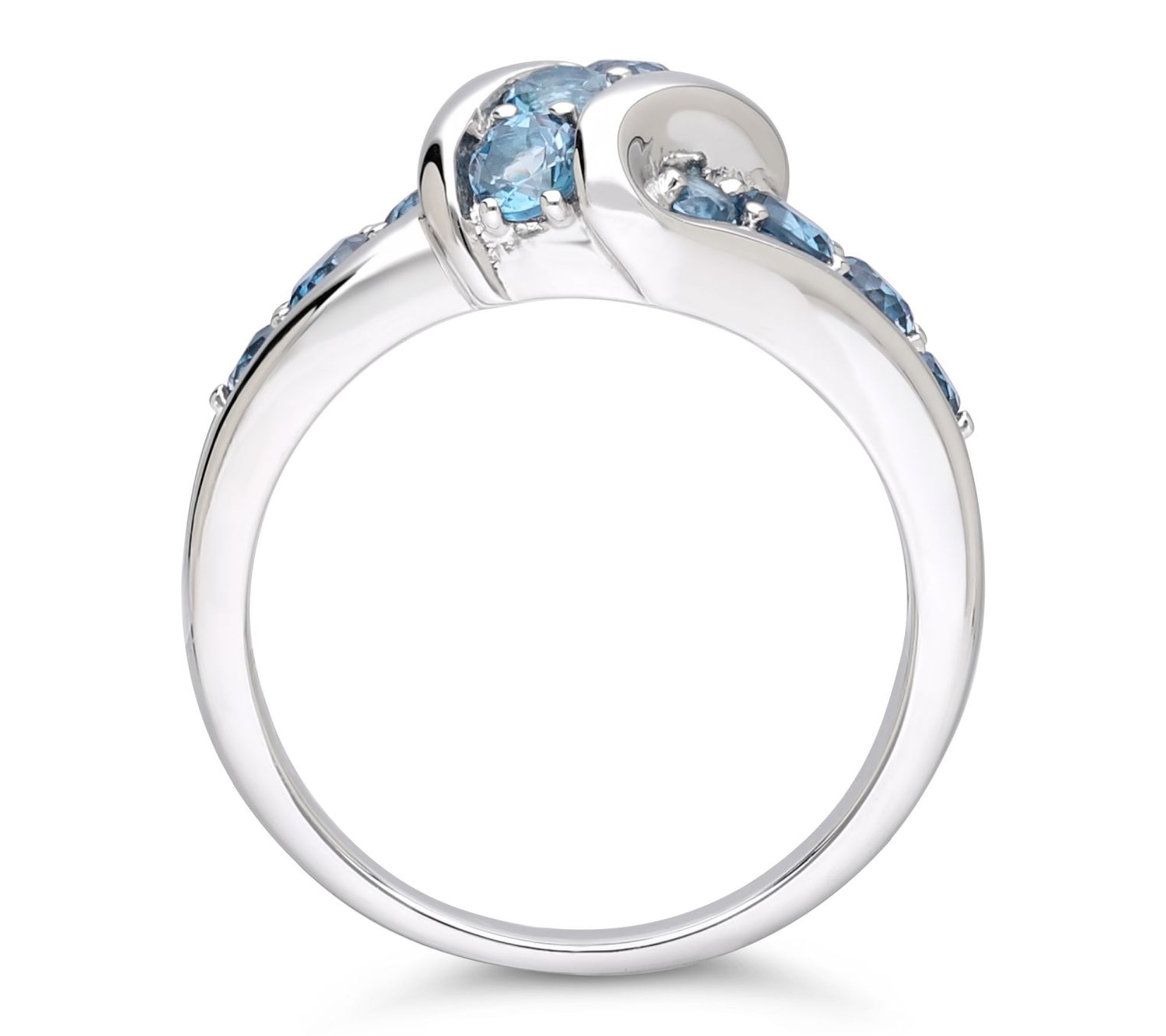 Swirl design; round, prong-set London blue topaz gemstones; polished