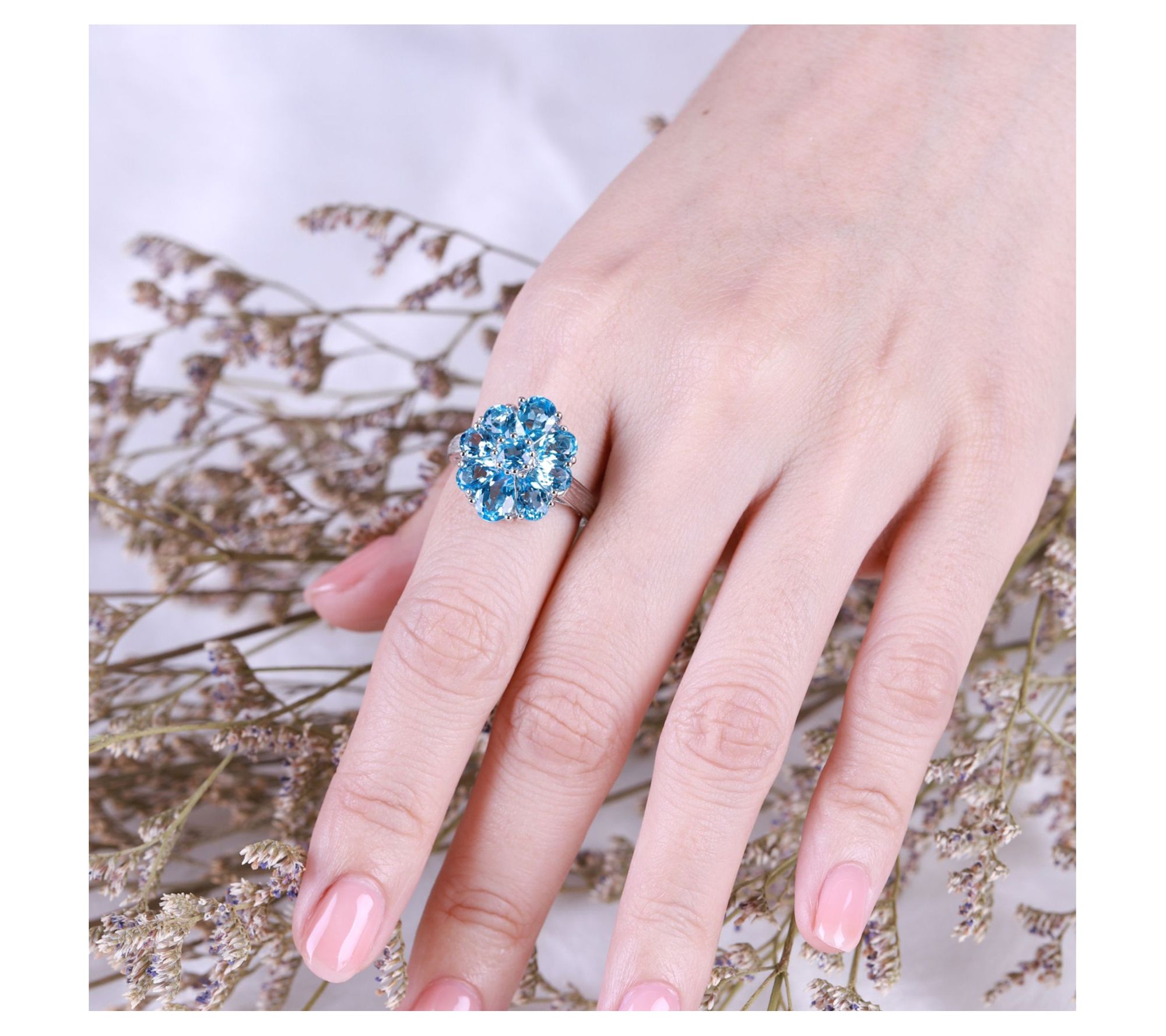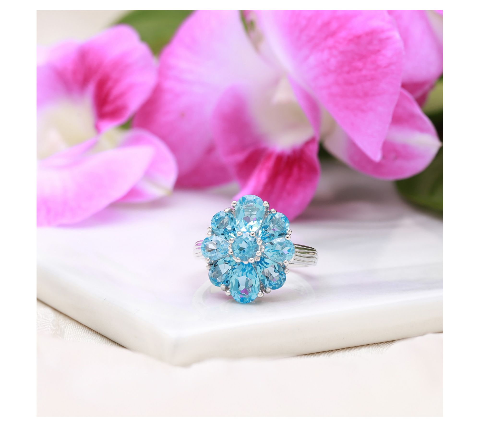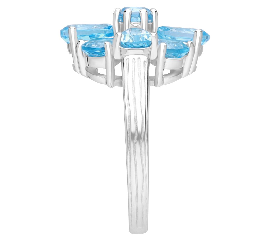 - Pear-shaped prong-set Swiss blue topaz stone petals; round prong-set Swiss blue topaz center; silk texture on shank