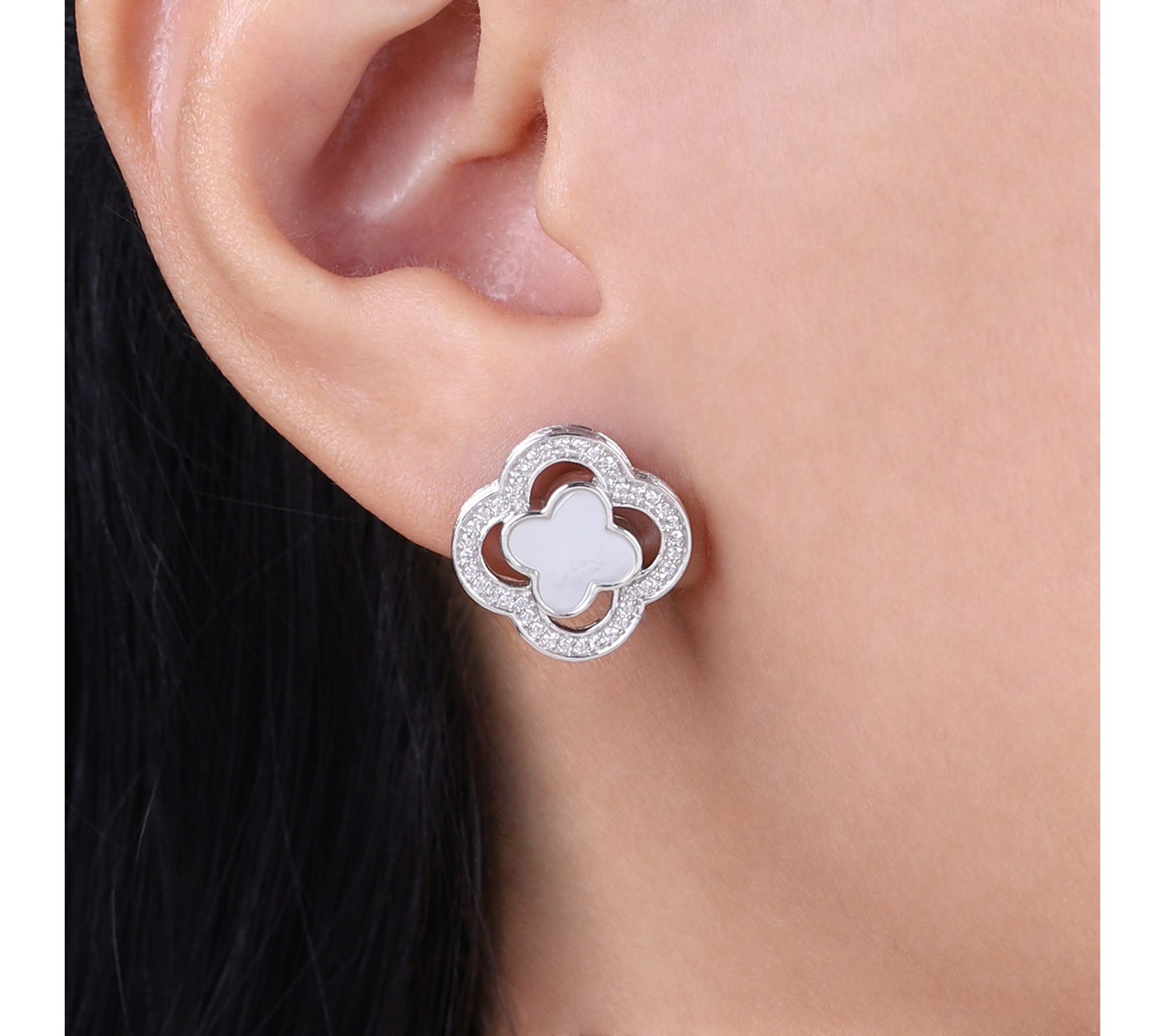 Mother of pearl or black onxy in center surrounded by a scallop-shaped Diamonique simulated diamond halo
