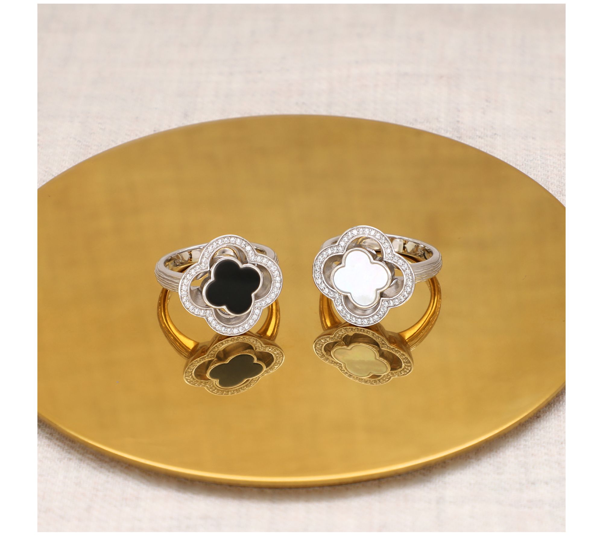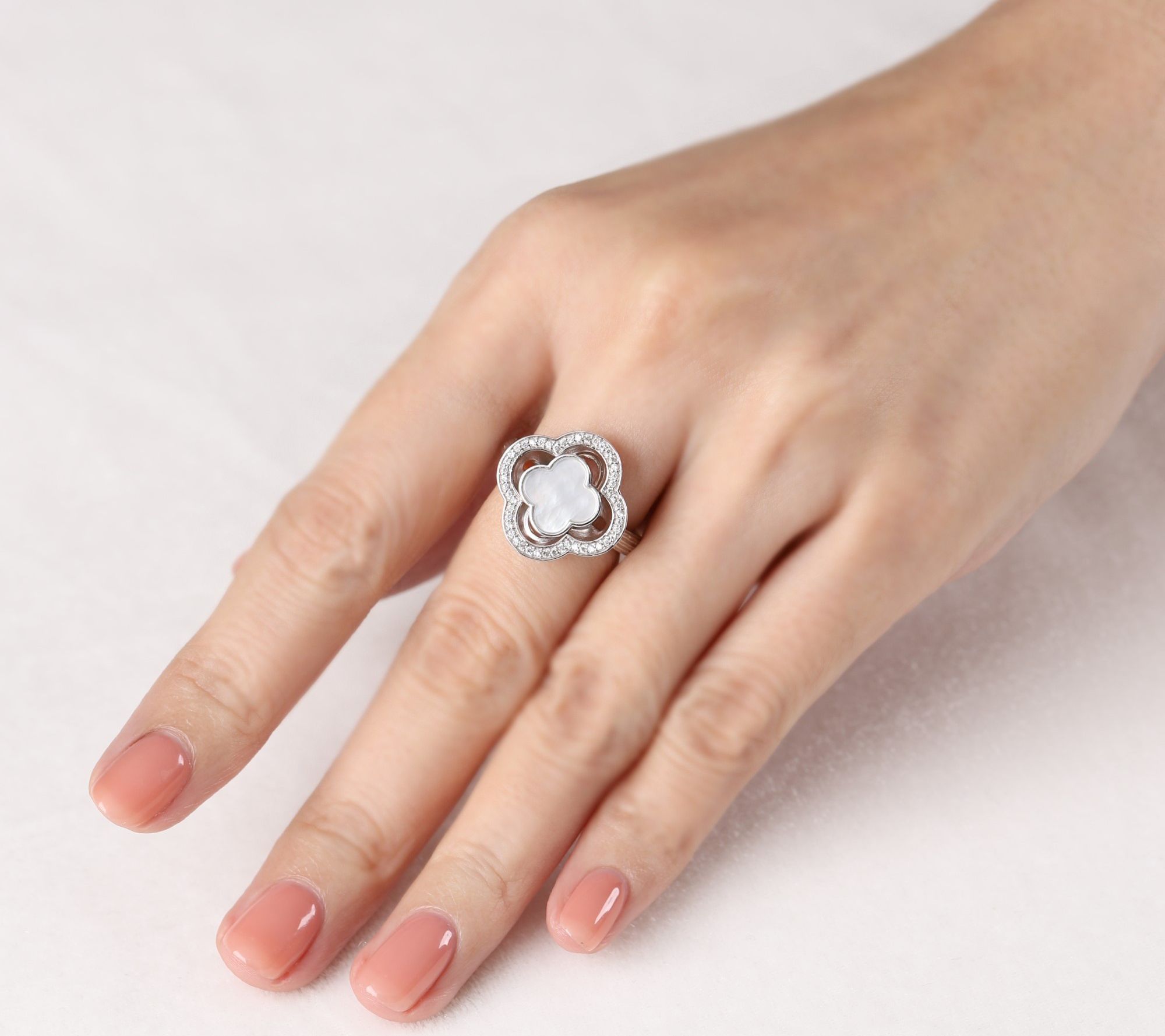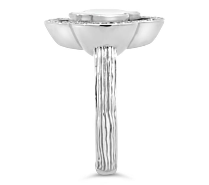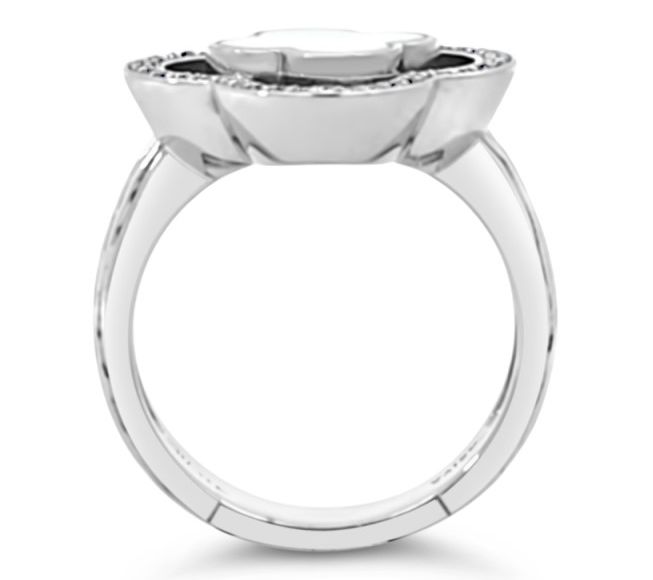 - Clover-cut opaque gemstone; scalloped Diamonique simulated diamond halo; silk-textured shank