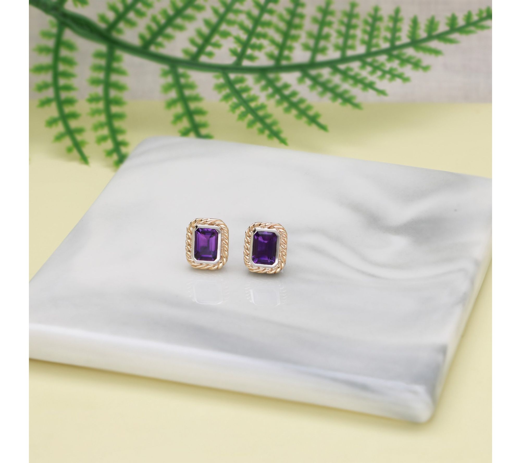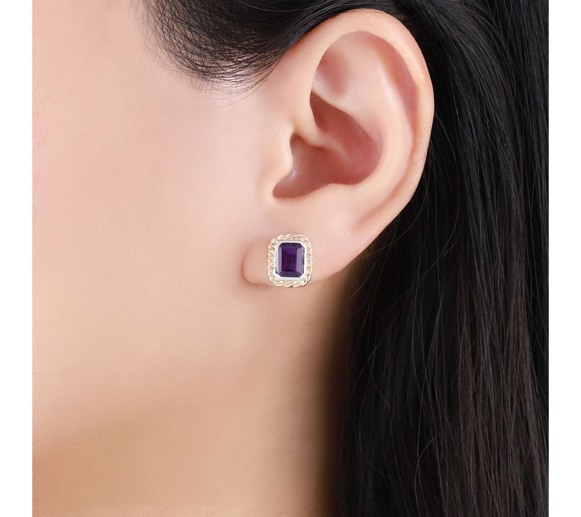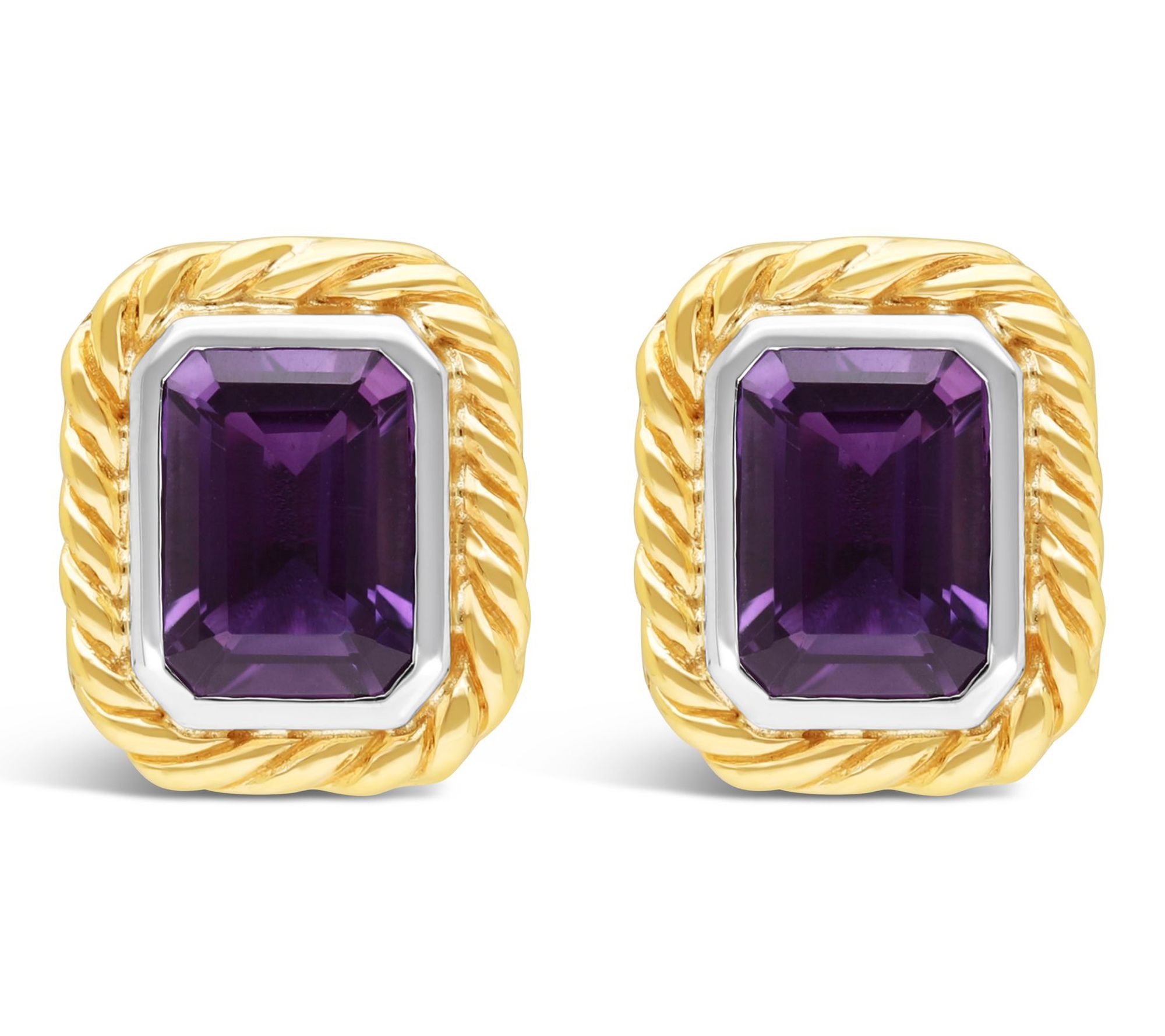Bring a pop of color and elegance to special occasions or everyday ensembles with these gemstone earrings. A glowing octagon-cut amethyst is bezel-set at the center, framed by a 14K yellow gold braided accent atop polished sterling silver, blending luxury and vibrant charm. From Ariva.