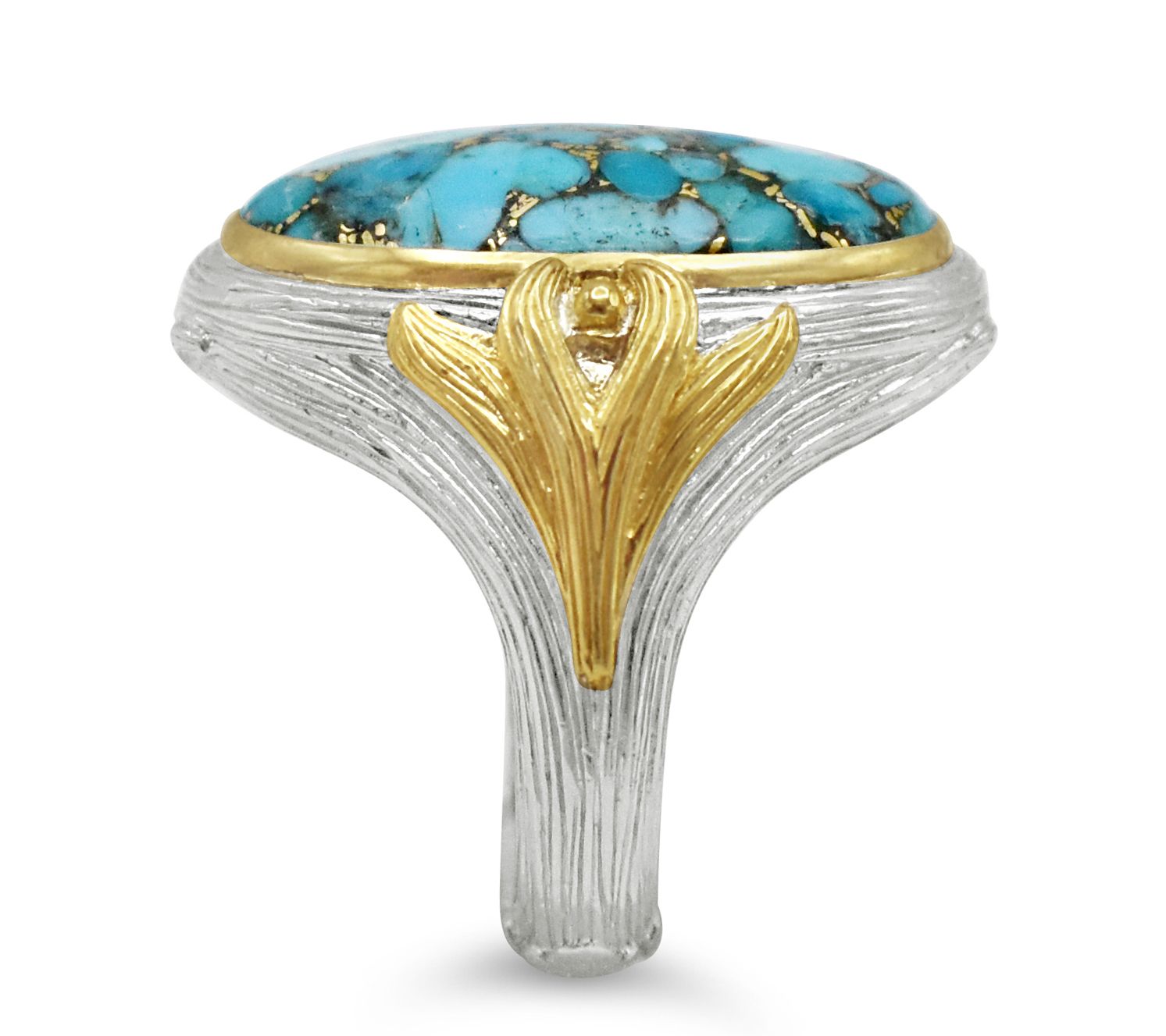 • Oval-cut, bezel-set turquoise gemstone in center; silk texture