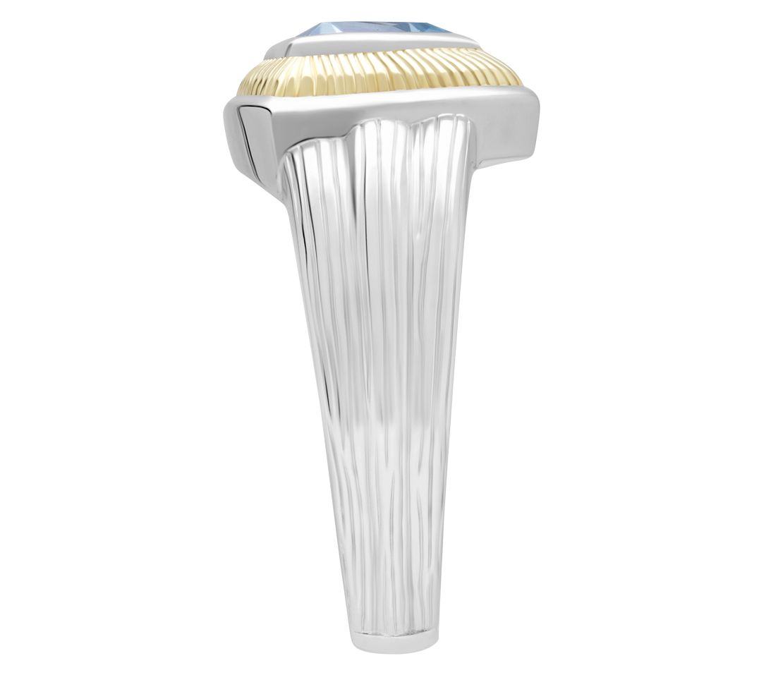 - High-polish bezel with 18K gold-plated textured frame around a trillion-cut sky blue topaz gem; silk-textured shank