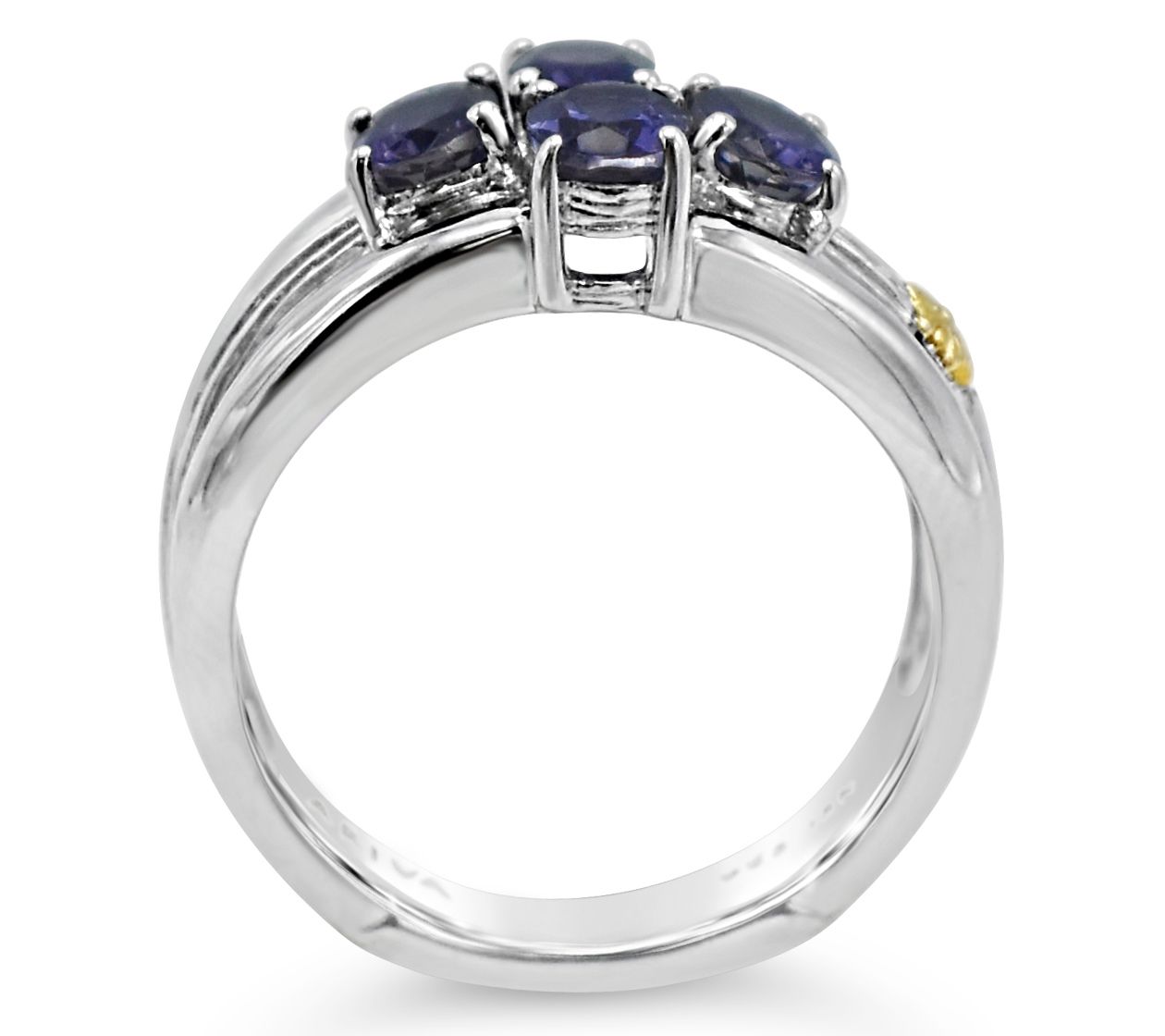 - Textured, tapered band with four prong-set, oval, cushion-cut iolite gemstones; 18K yellow gold acanthus