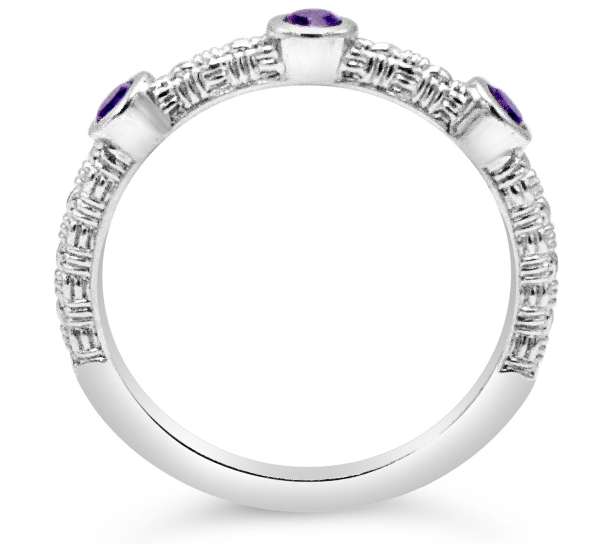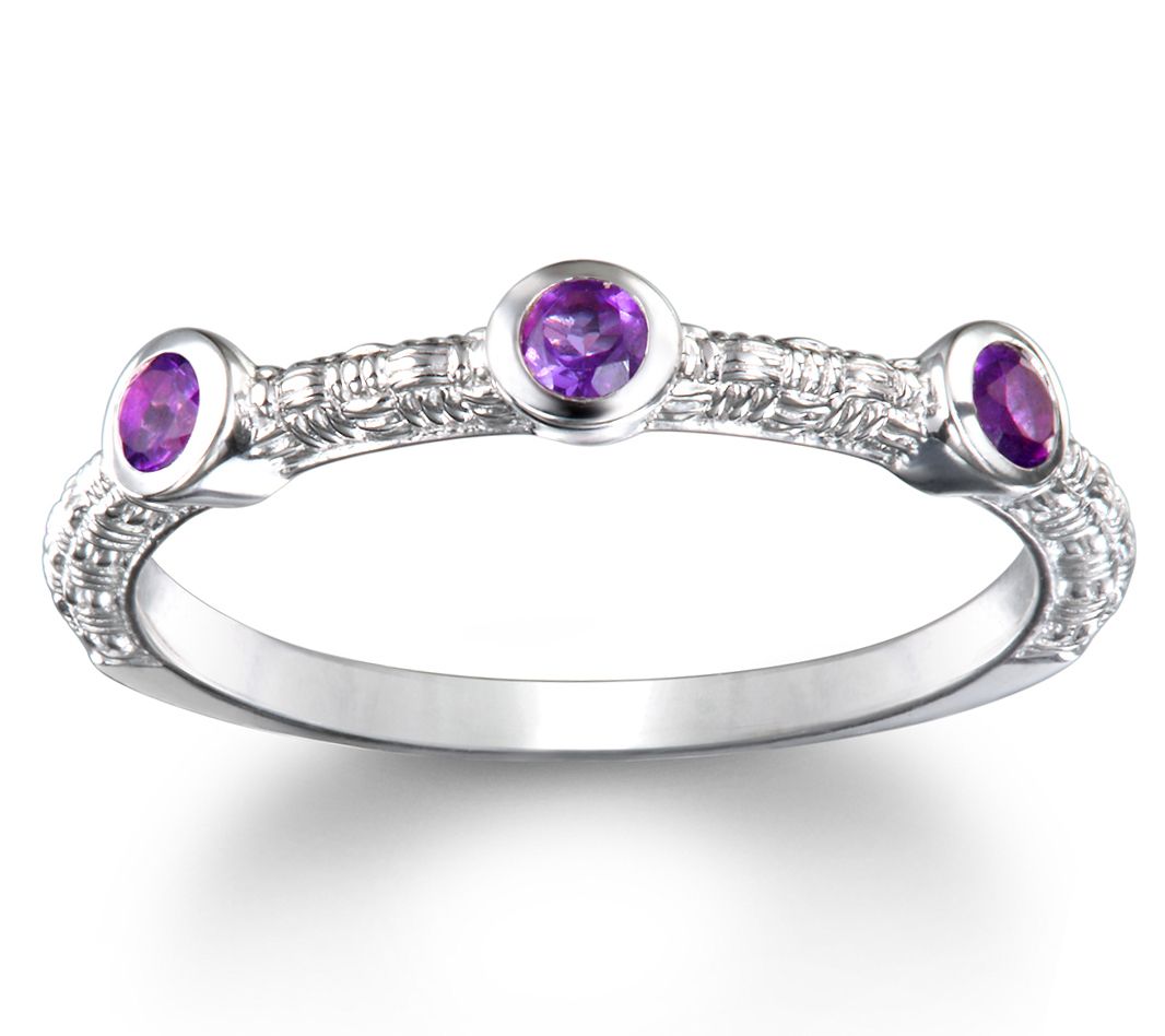 • Basket-weave design with three bezel-set round, amethyst gemstones in center