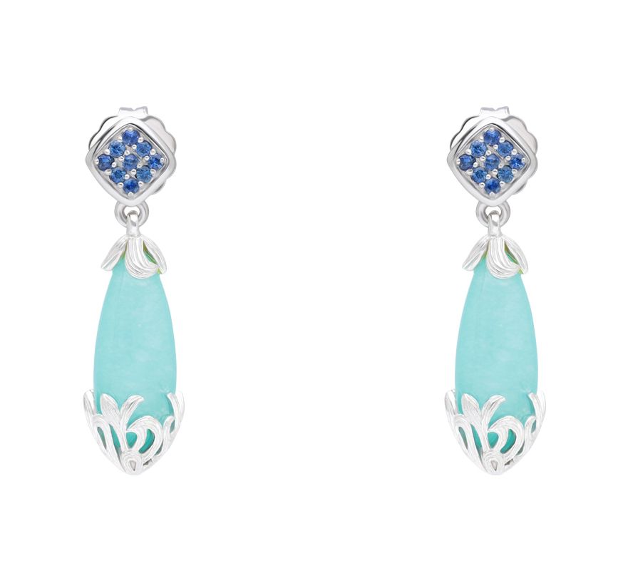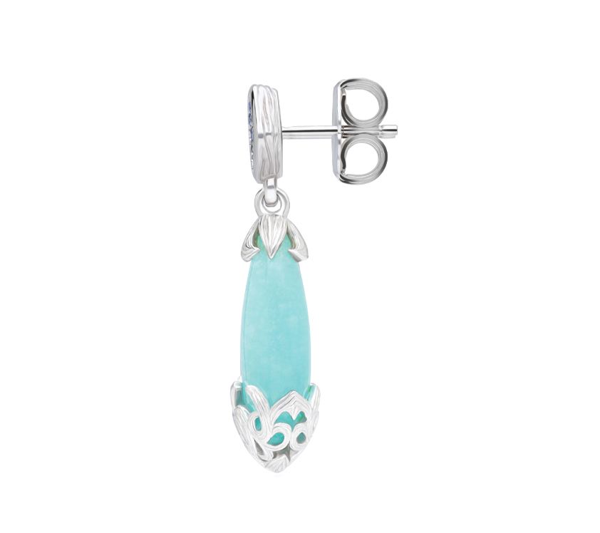 • Dangle earrings with pave sapphire tops; aquamarine quartzite drops with silk-textured scroll caps