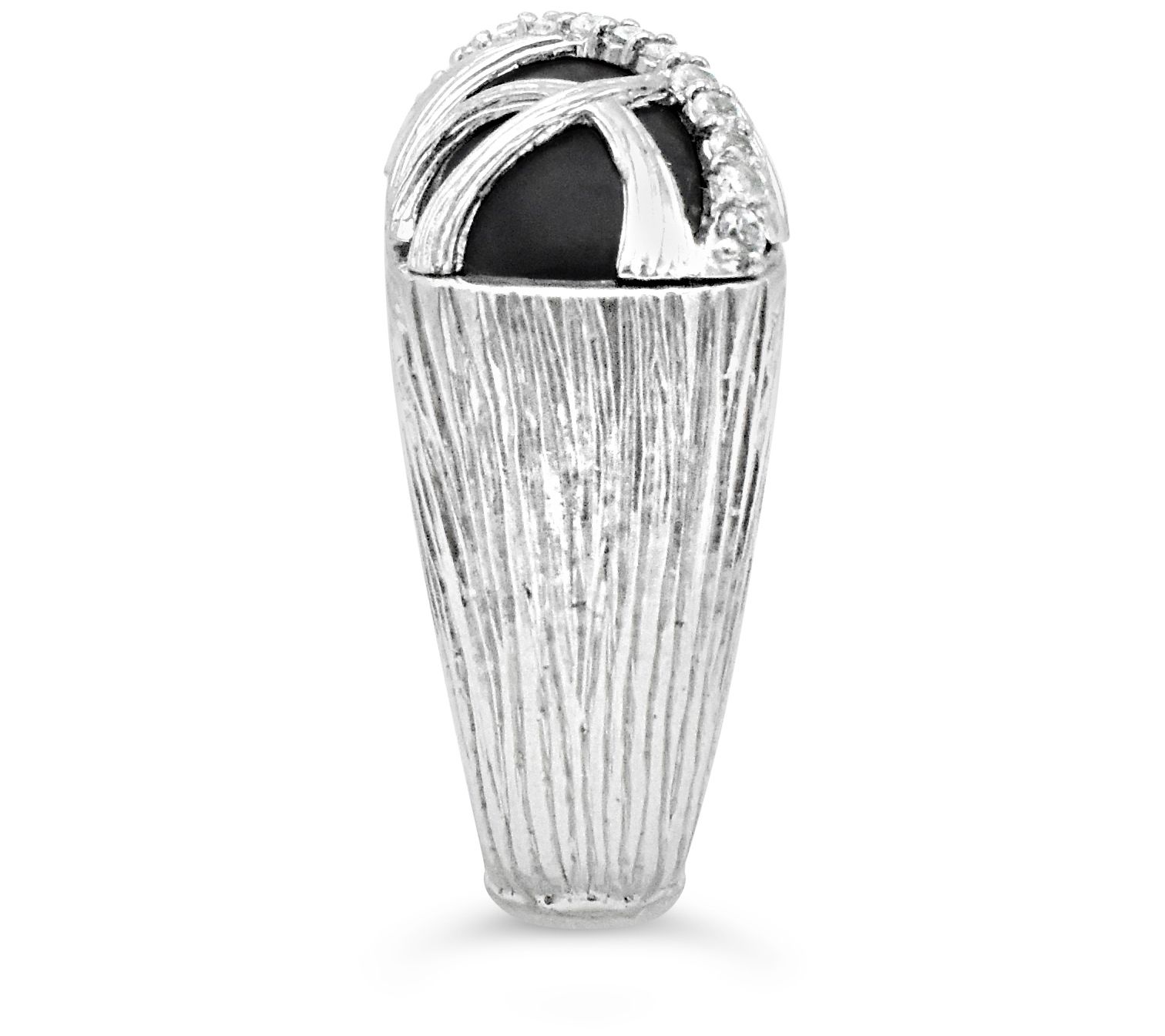 - Black onyx cabochon center; prong-set white sapphire; textured accents