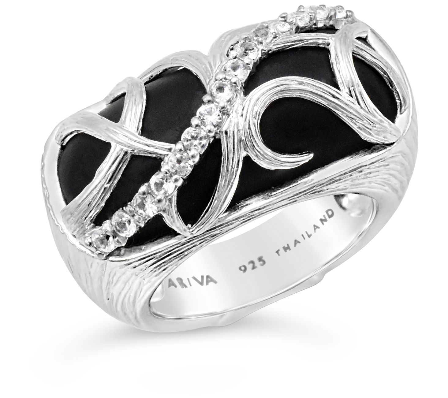 For a pop of pretty, opt for this sterling silver black onyx and white sapphire ring with textured accents to luxe up any look. From Ariva.