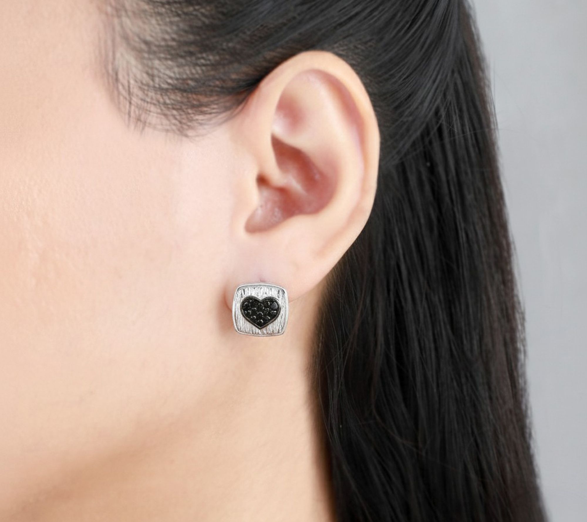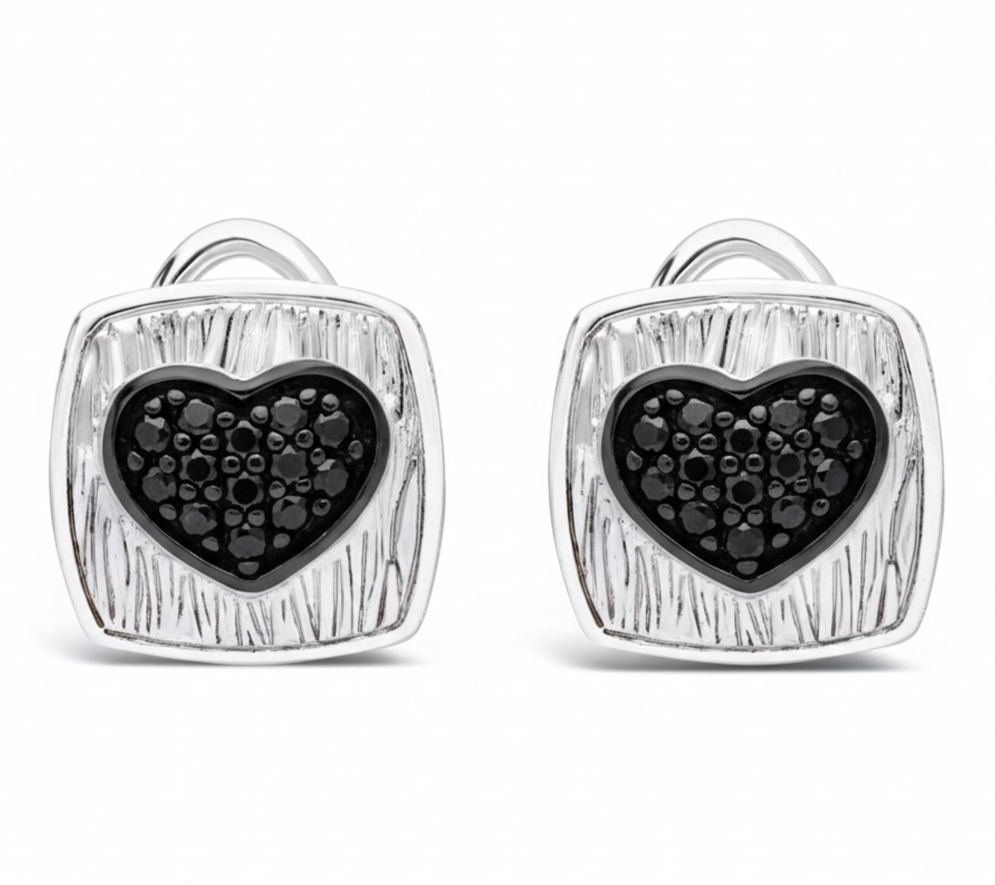 Celebrate heartfelt moments with these sterling silver button earrings featuring a dazzling black spinel heart embraced by a silk-textured frame. The pave-set gemstones add stylish sparkle, making these earrings a thoughtful accent for both romantic evenings and everyday elegance. From Ariva.