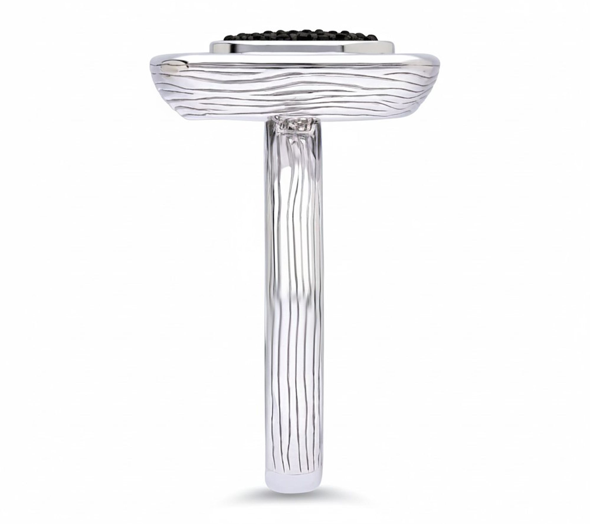 Let them know how much you care with a heart-shaped ring that radiates thoughtfulness. A tapestry of pave-set black spinel glimmers in the center, framed by an artfully silk-textured sterling silver band for a romantic touch with modern flair -- ideal for stacking or making a statement all on its own. From Ariva.