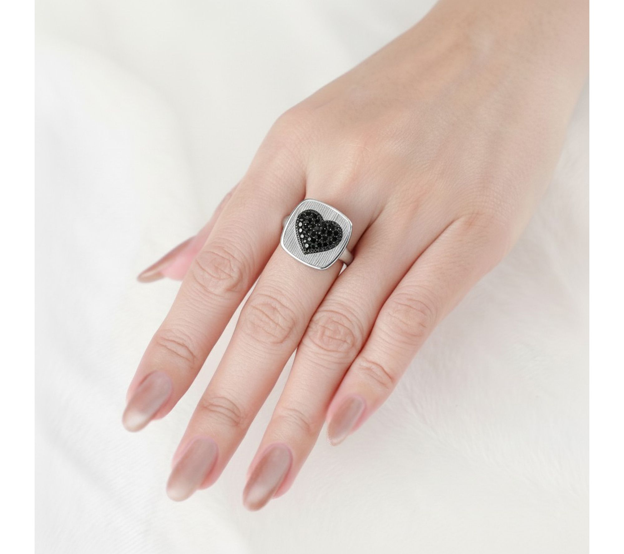 • Silk textured background and frame; center heart design with round, pave-set black spinel gemstones; silk textured shank