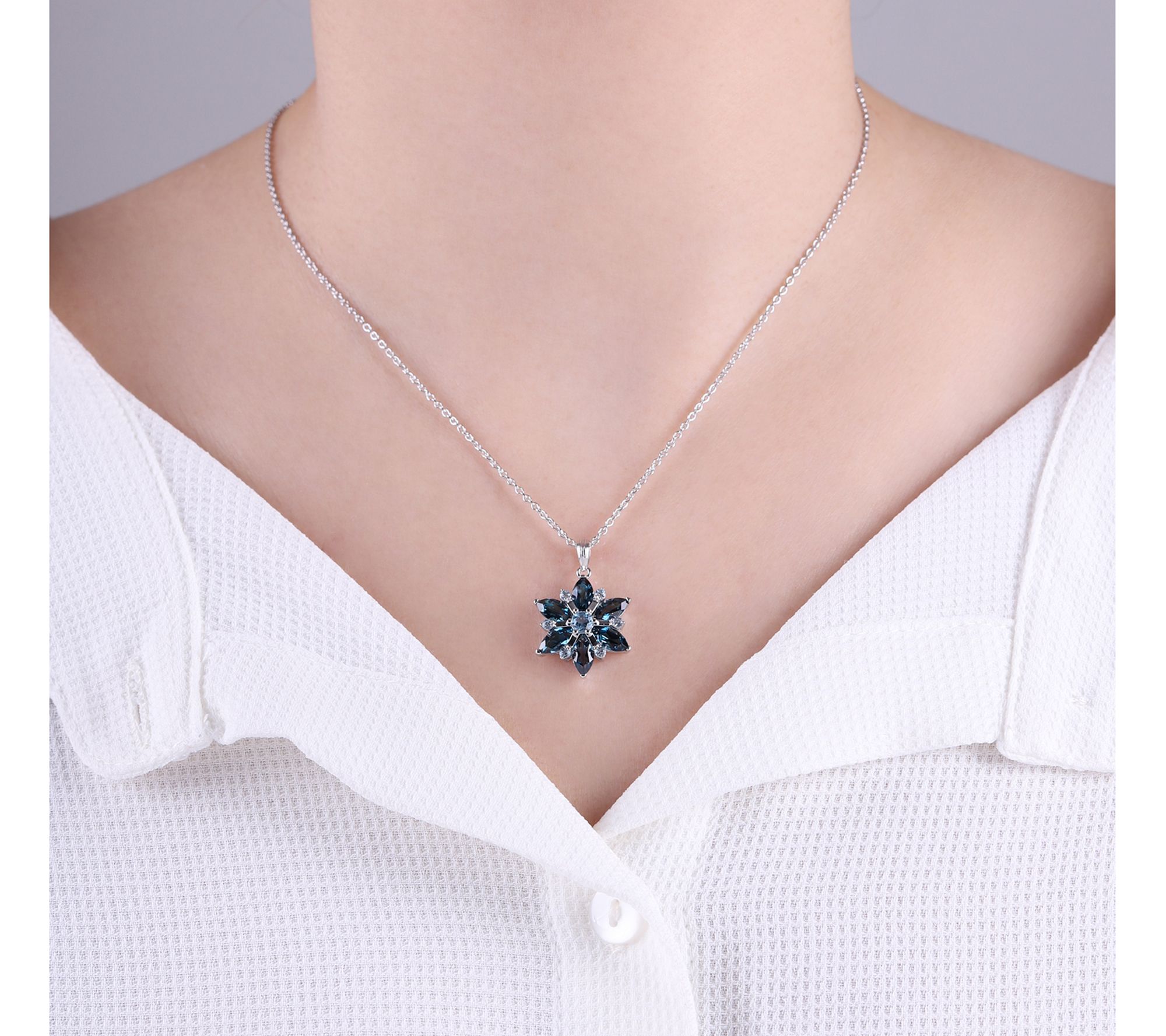 - Flower design; marquise-cut, prong-set London blue topaz petals; round Swiss blue topaz center and accents; rolo link chain