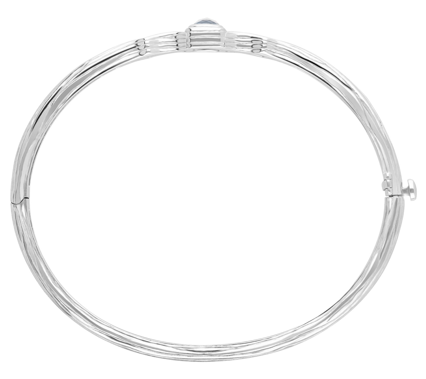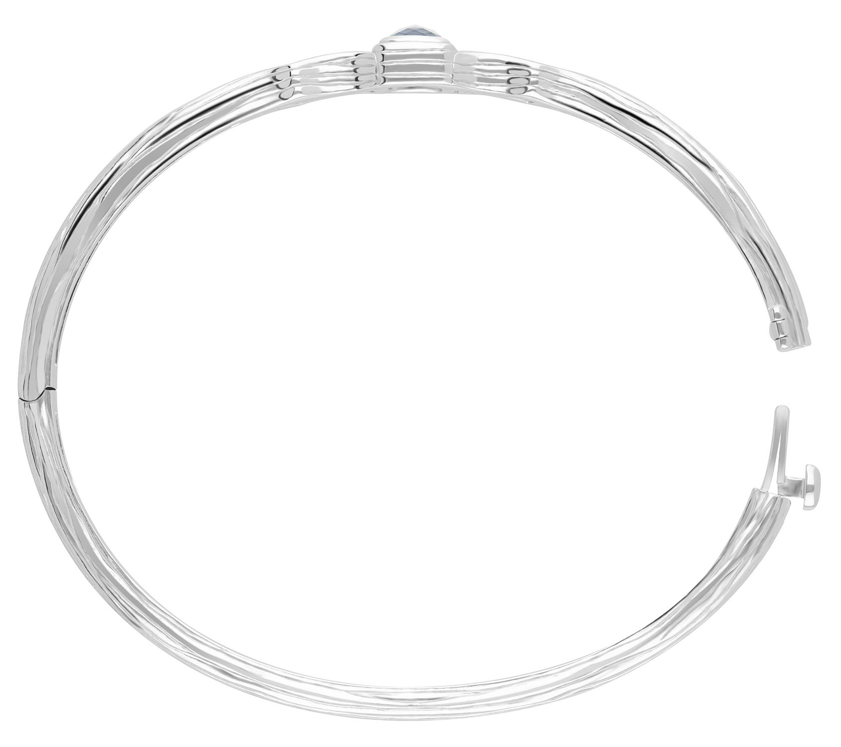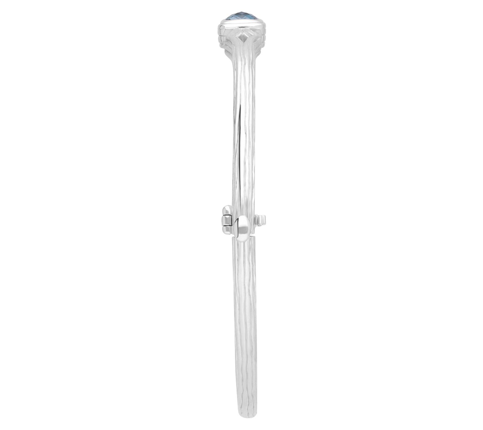 - Oval shaped bangle with square-cut bezel-set topaz at center; silk textured cutouts; hinged