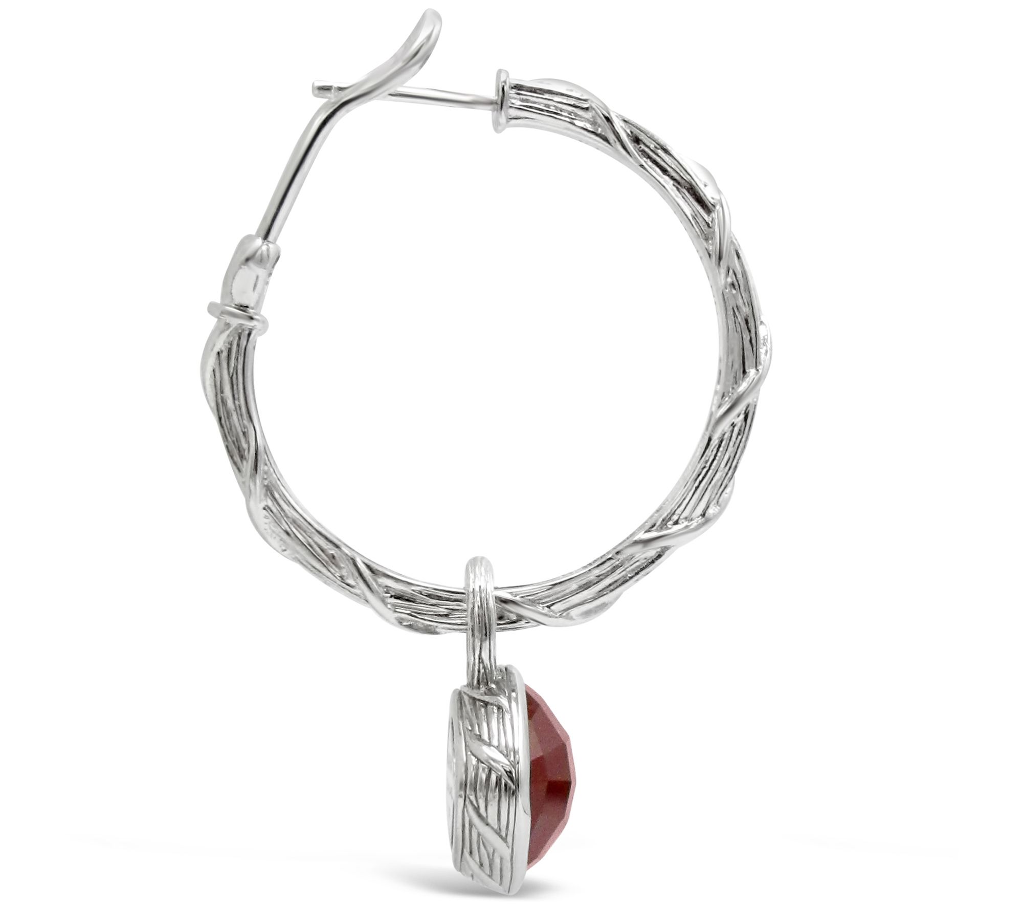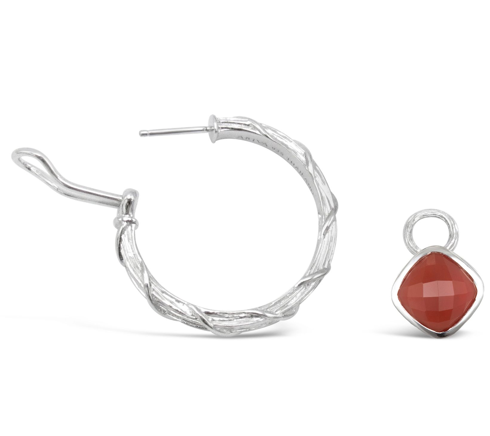 Change up your look by wearing these gorgeous, convertible red carnelian gemstone earrings either as hoops alone or hoops with the charms. Textured with vine detailing, these sterling silver earrings feature a removable, bezel-set carnelian gemstone charm. From Ariva.