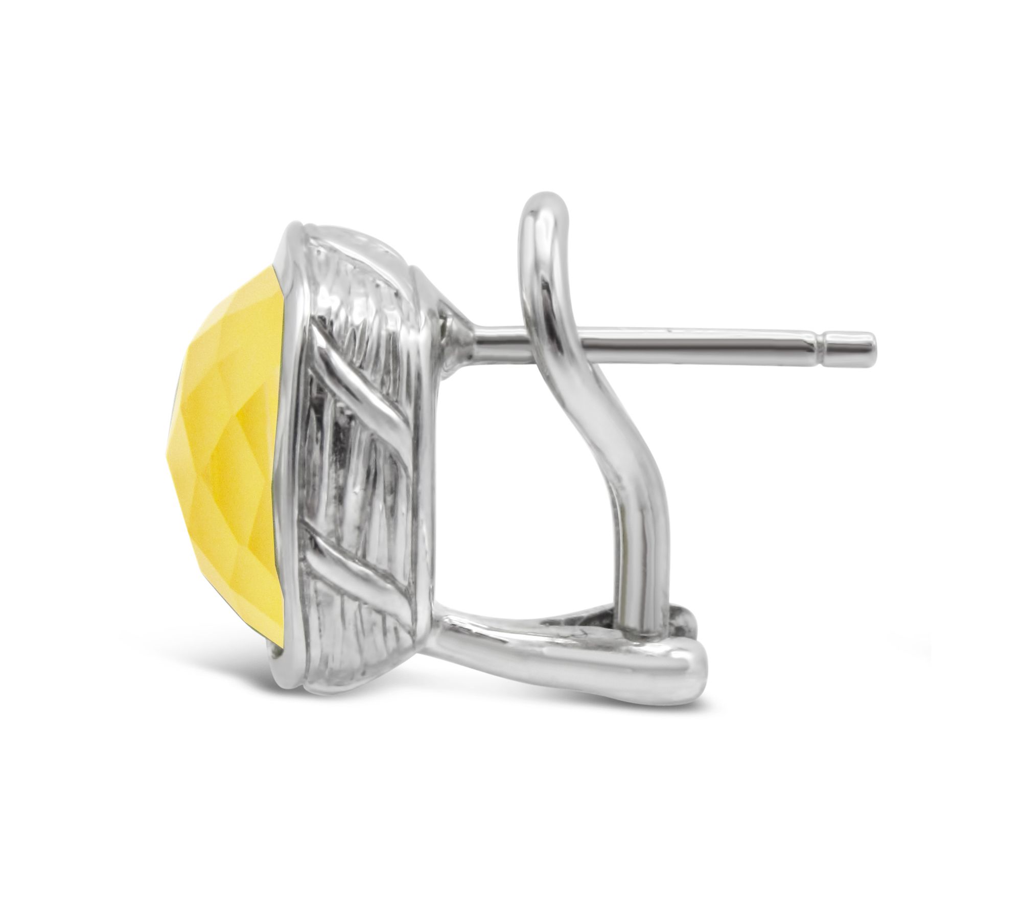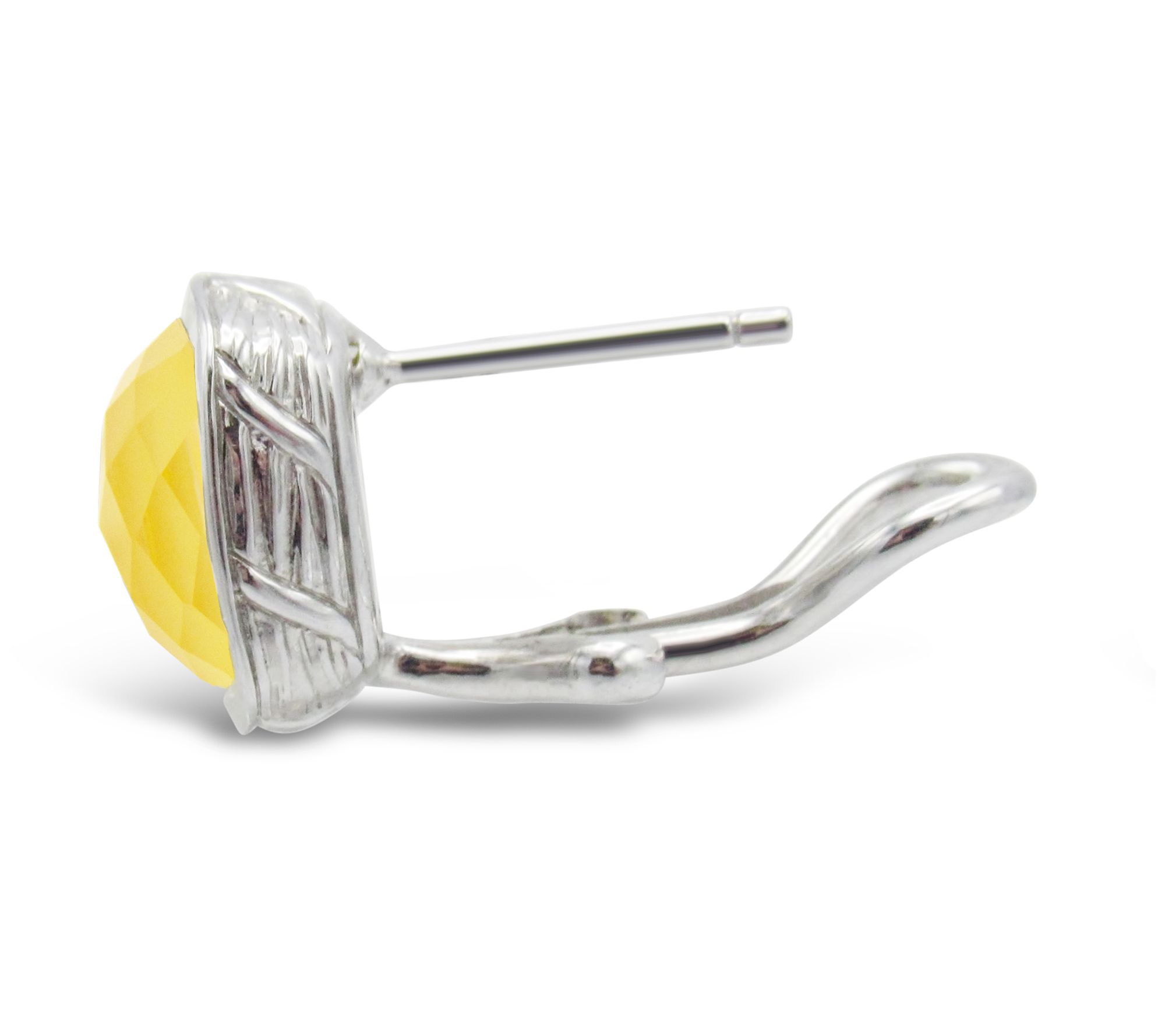 • Textured metal work; cushion-cut, square dyed yellow chalcedony and pineapple-cut rock crystal doublet center