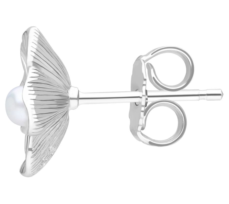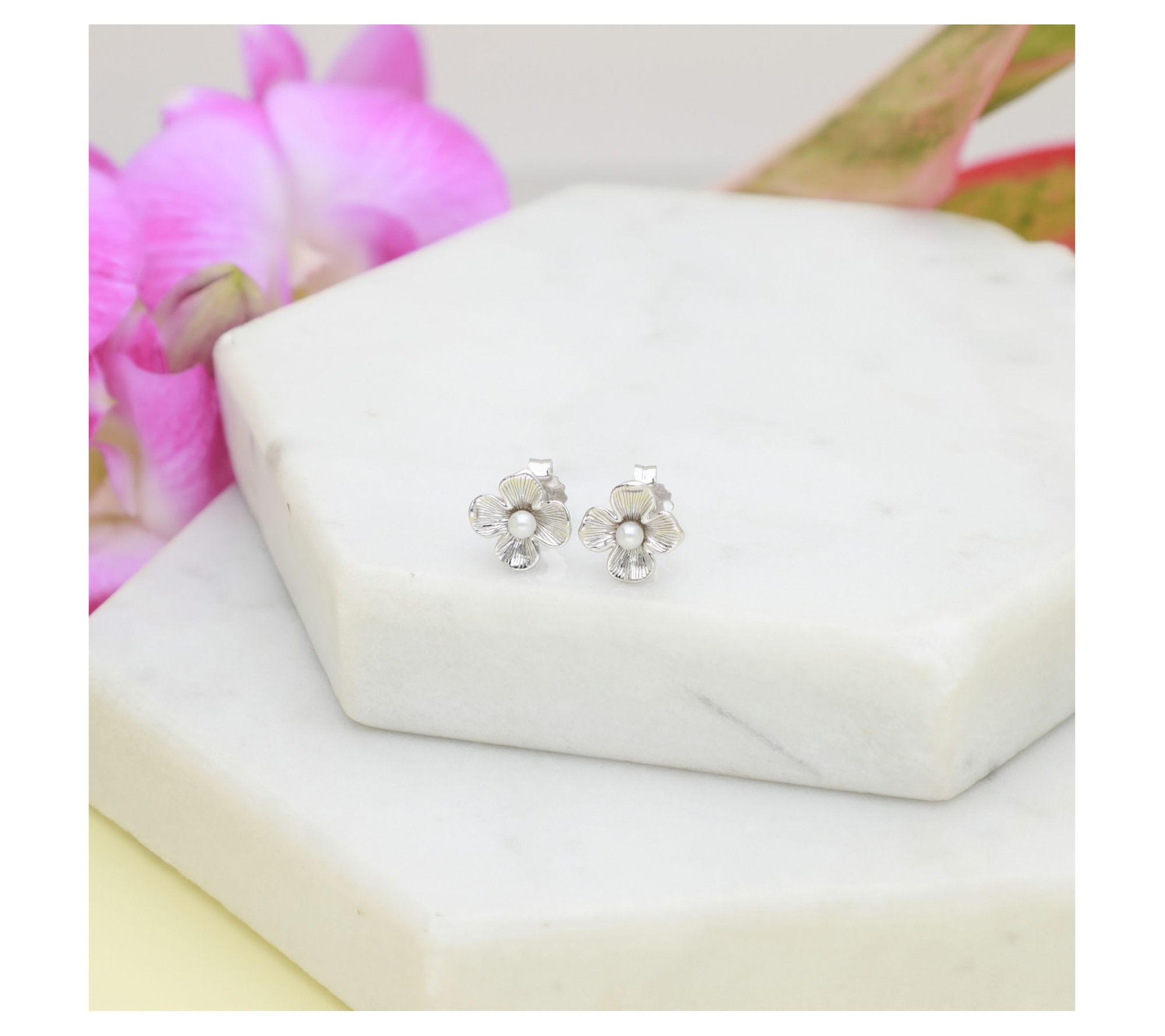 - Flower stud earrings with silk-textured petals and round cultured pearl centers