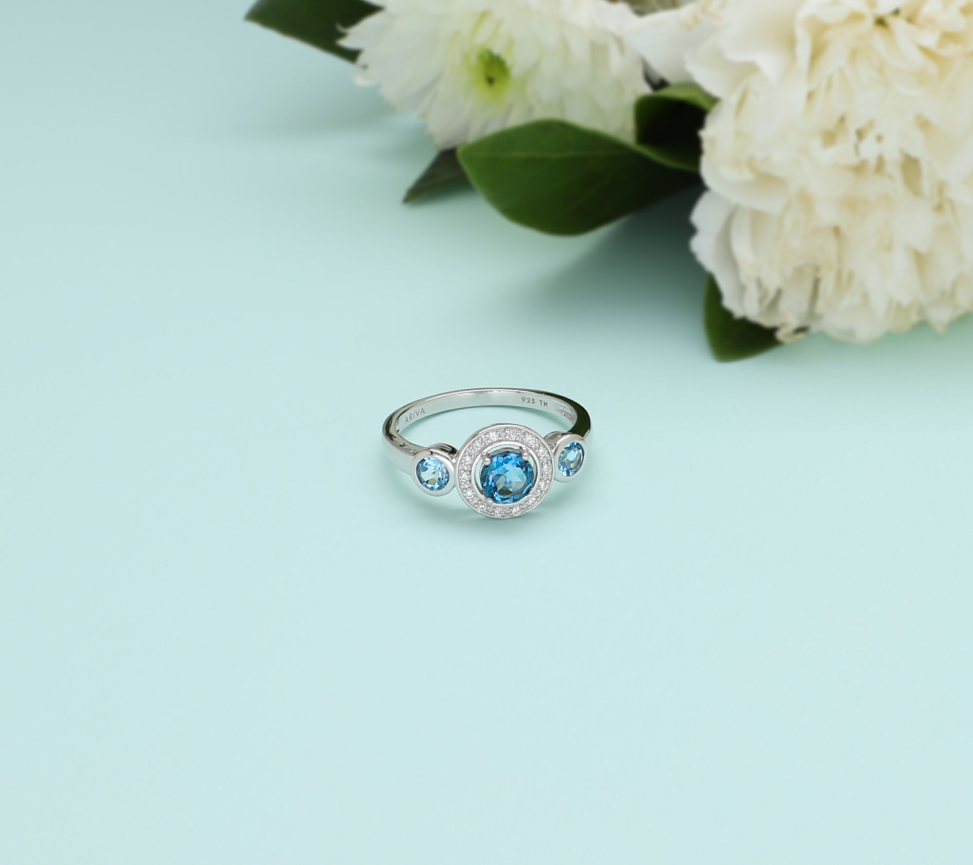 True blue. A London blue topaz gemstone flanked by two Swiss blue topaz gemstones gives this Bristol ring a cool cohesive feel. From Ariva.