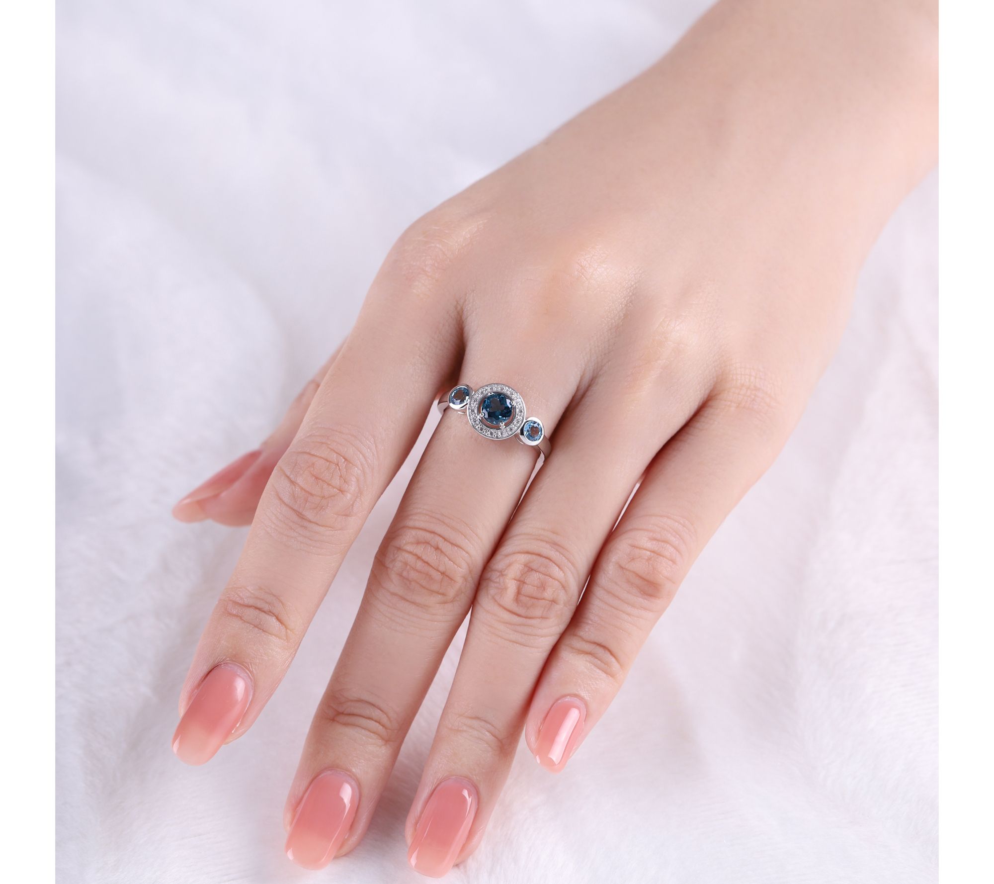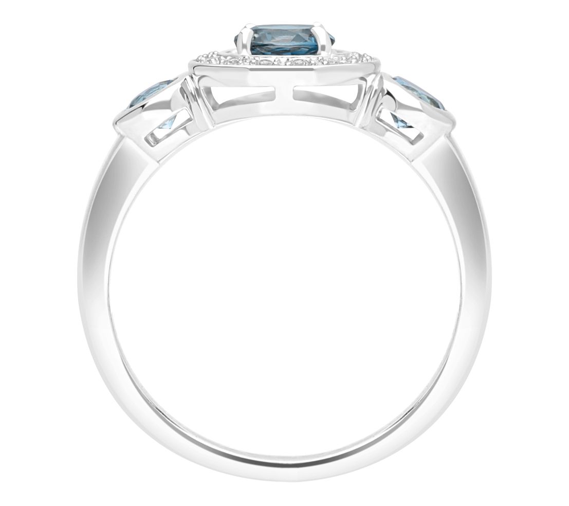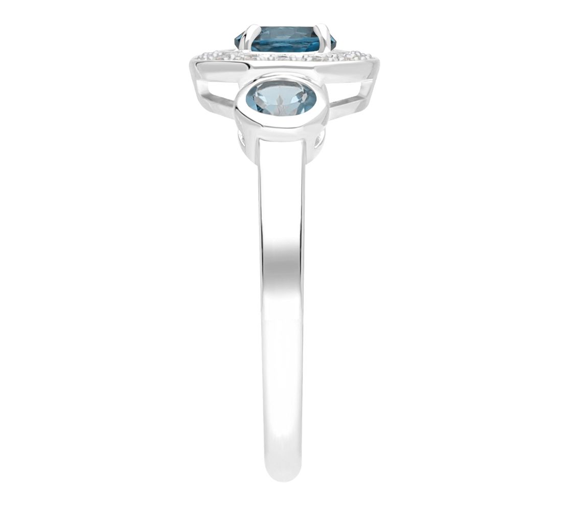 - Prong-set London blue topaz at center; Diamonique simulated diamond halo; bezel-set Swiss blue topaz gemstones on either side