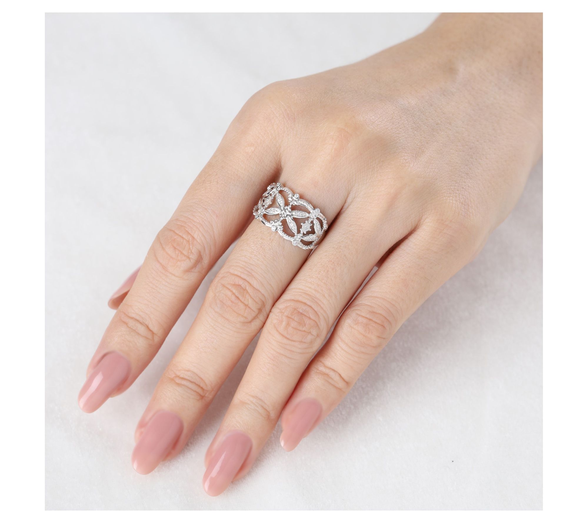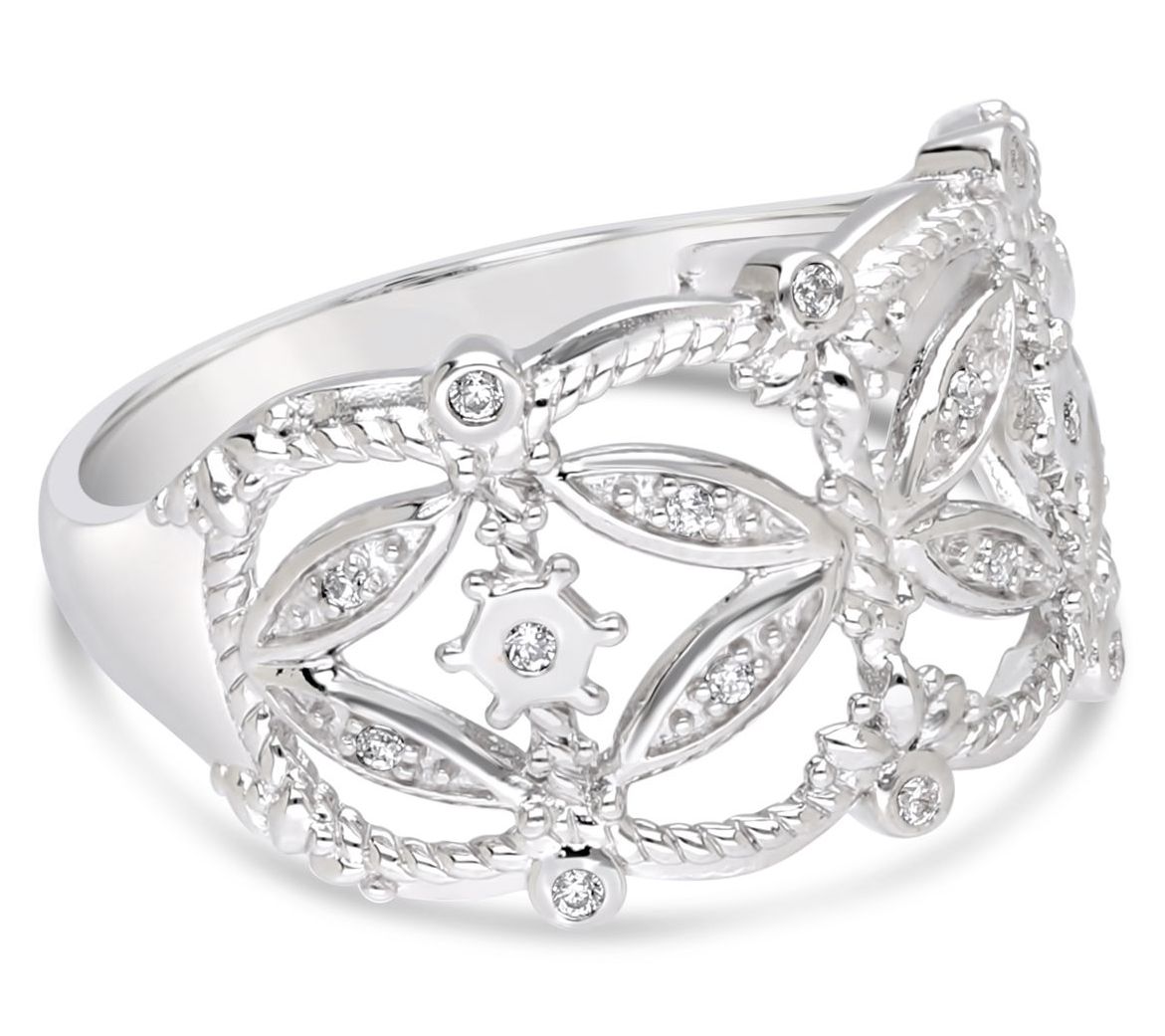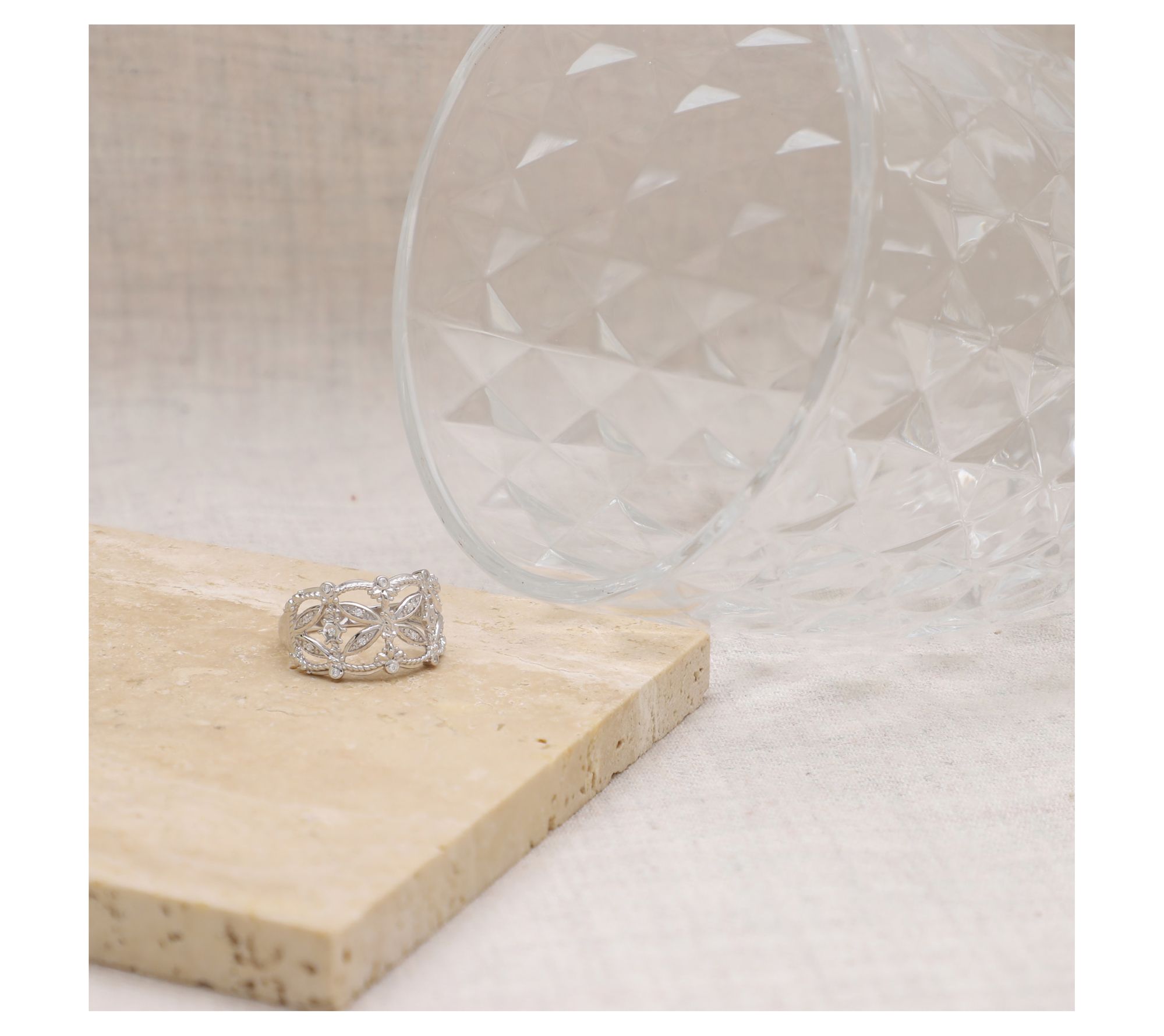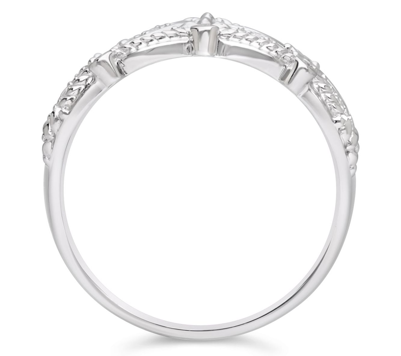 • Open band design; pave-set and bezel-set Diamonique simulated diamond accents; fine rope edges