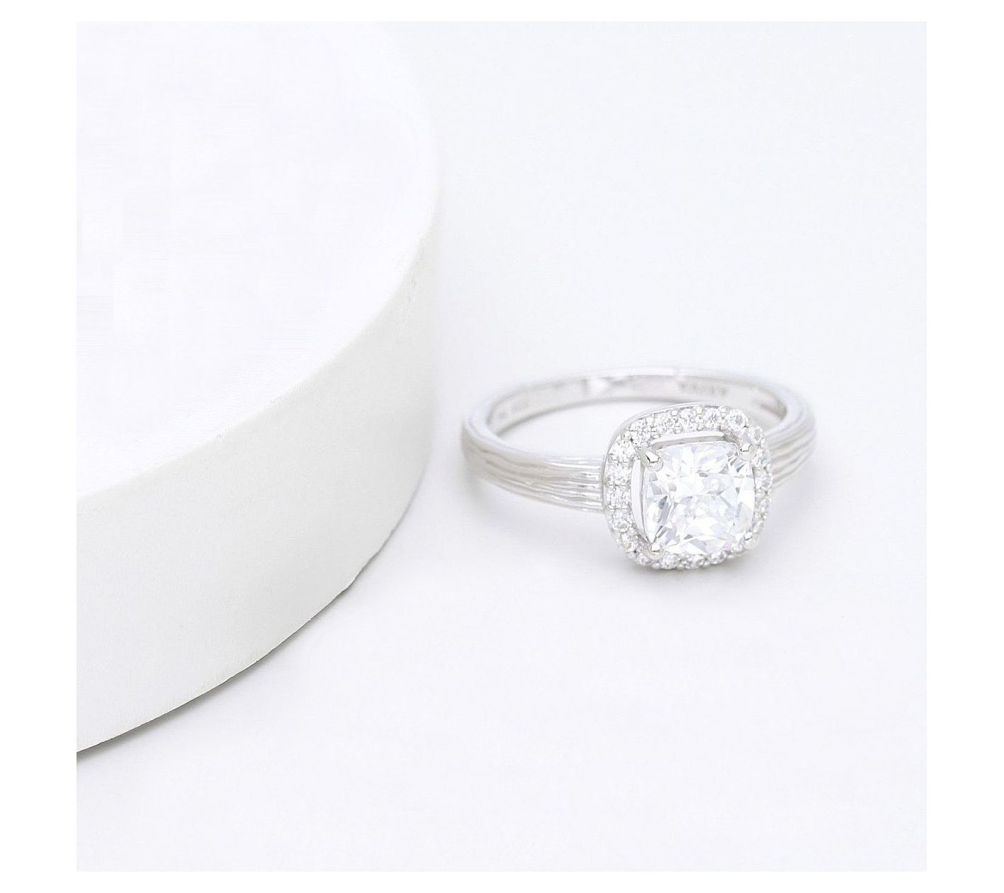 • Cushion-cut simulated diamond center stone with pave-set halo; silk-textured sides and shank