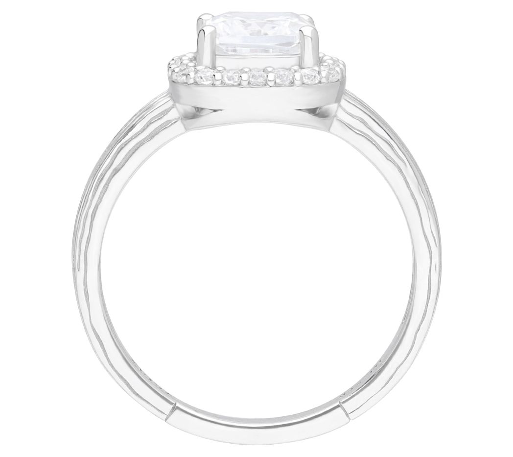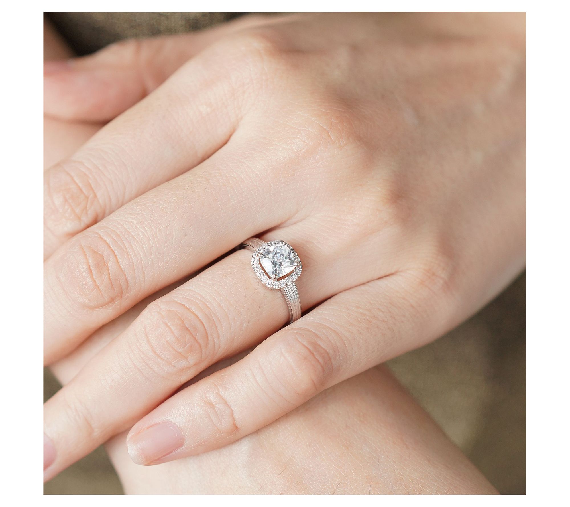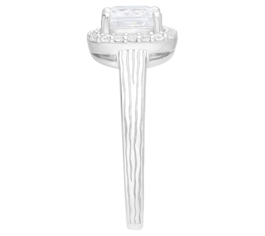 Commemorate the beginning of your new life together with the breathtaking beauty of this sterling silver ring. It showcases a stunning cushion-cut, cubic zirconia Diamonique simulated diamond, surrounded by a halo of additional simulated diamonds for radiance that just won't stop. From Ariva.