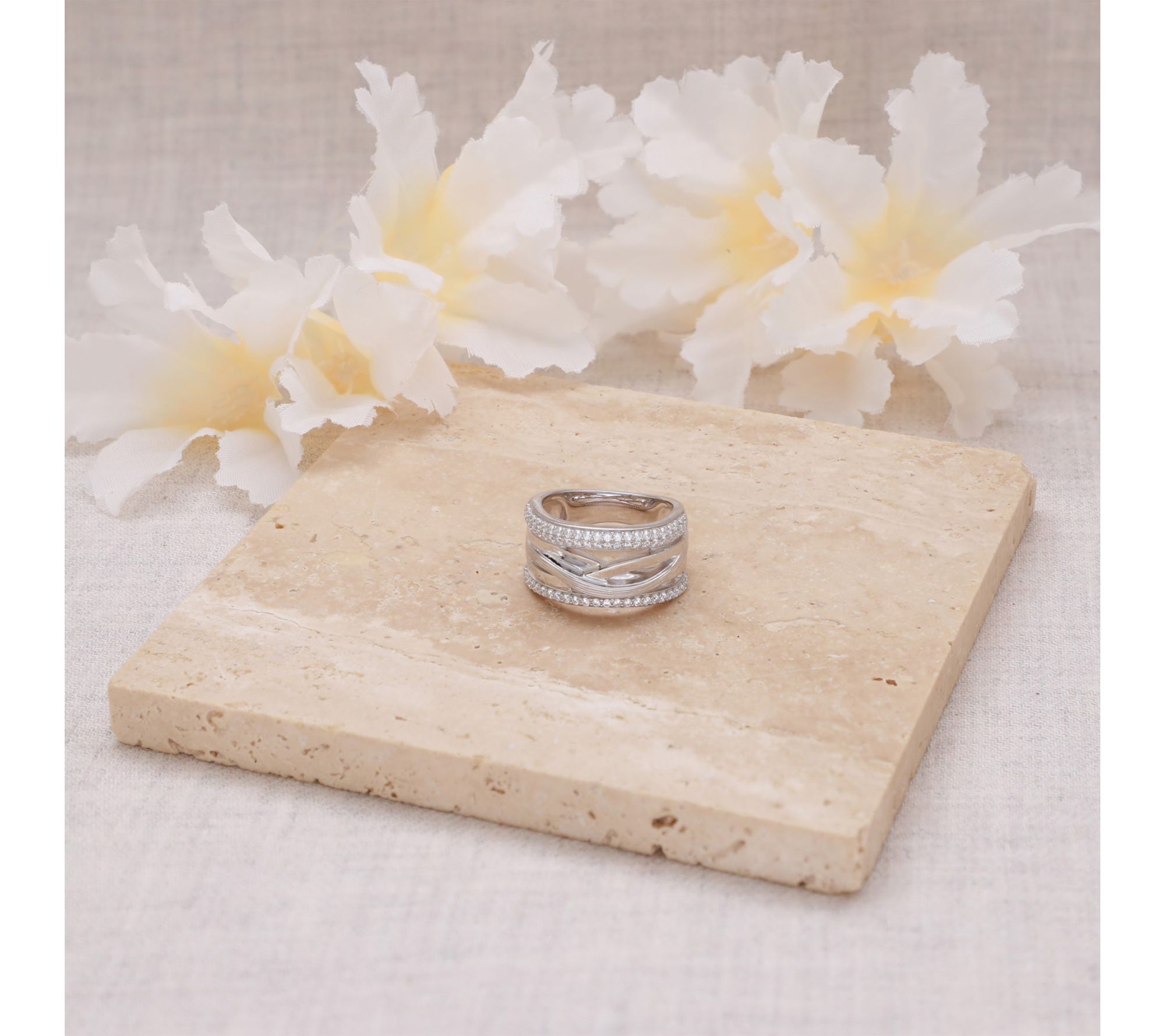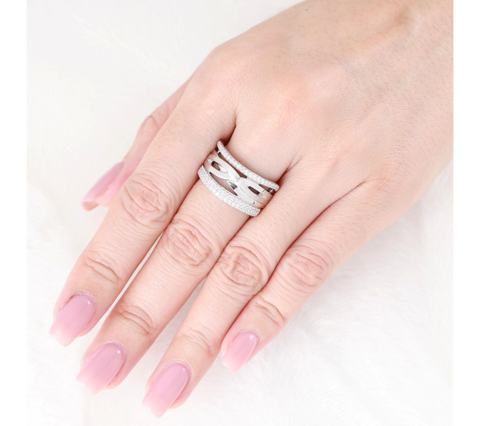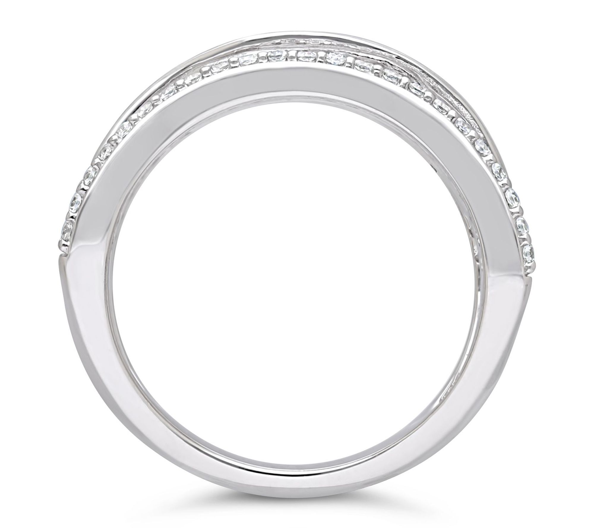 • Intertwining open highway-style band; clear Diamonique simulated diamonds; polished finish