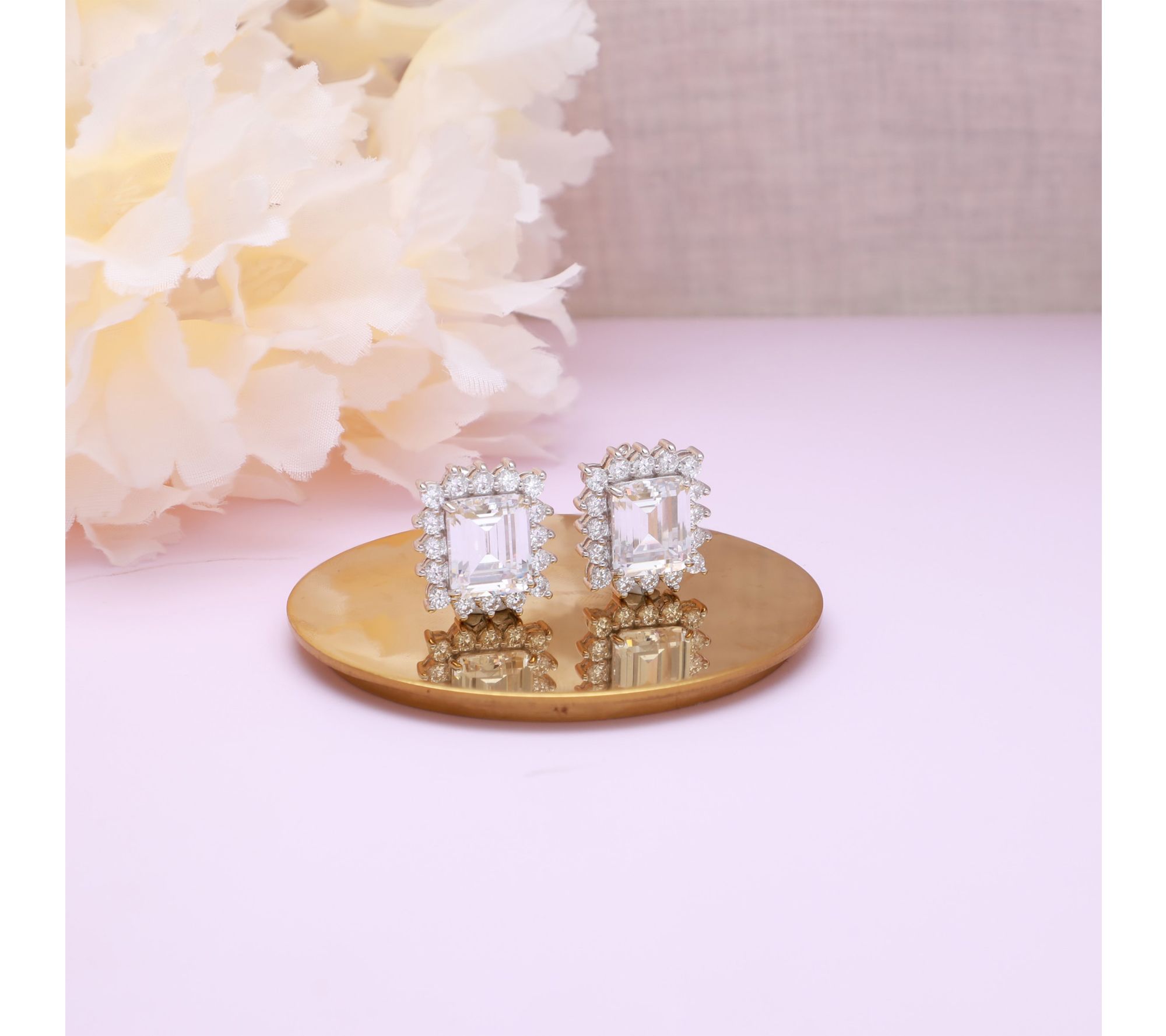 • Octagon-cut Diamonique simulated diamond center framed by round-cut Diamonique simulated diamonds; prong settings