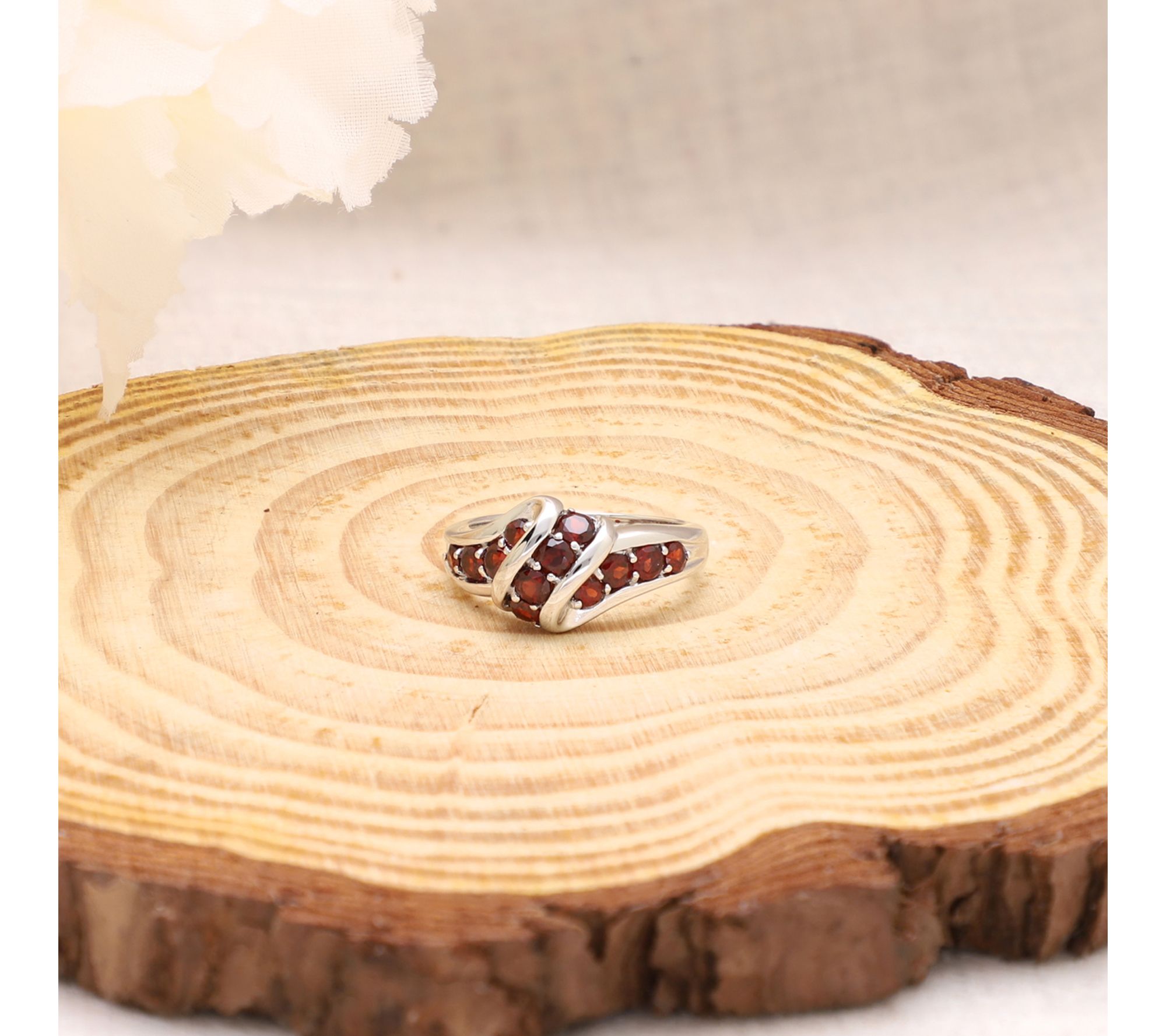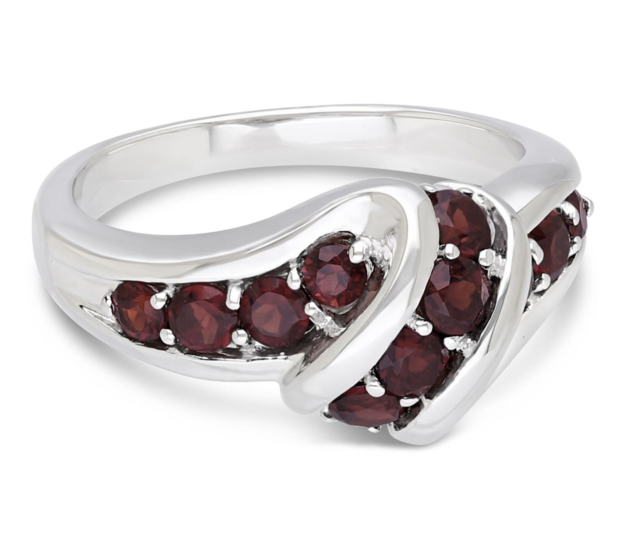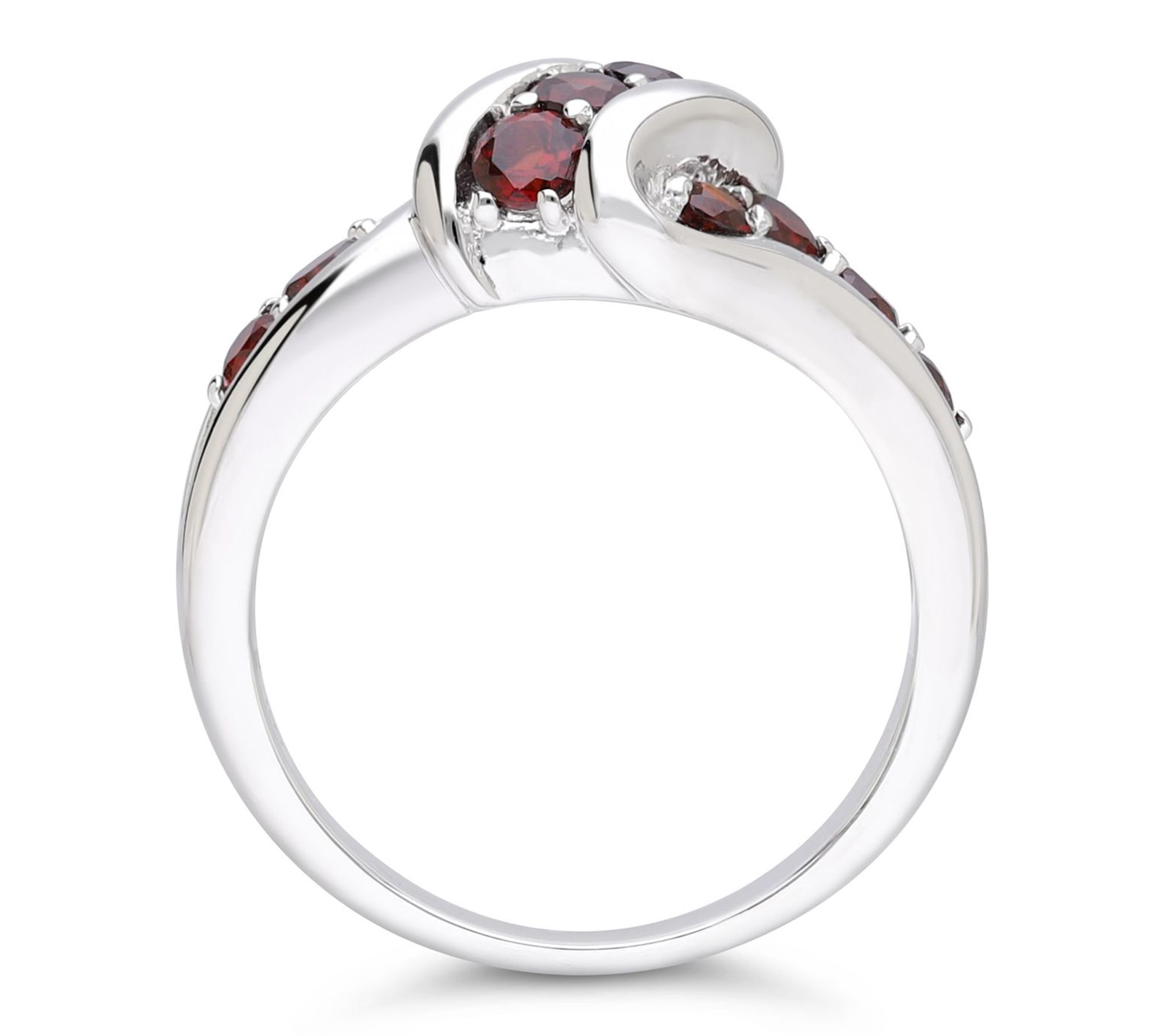 Turn special evenings or celebratory gatherings into standout moments with this cocktail ring, where luminous sterling silver swirls around a vibrant display of round garnet gemstones. The striking red gemstones catch the light beautifully, lending a sophisticated accent to any ensemble. From Ariva.