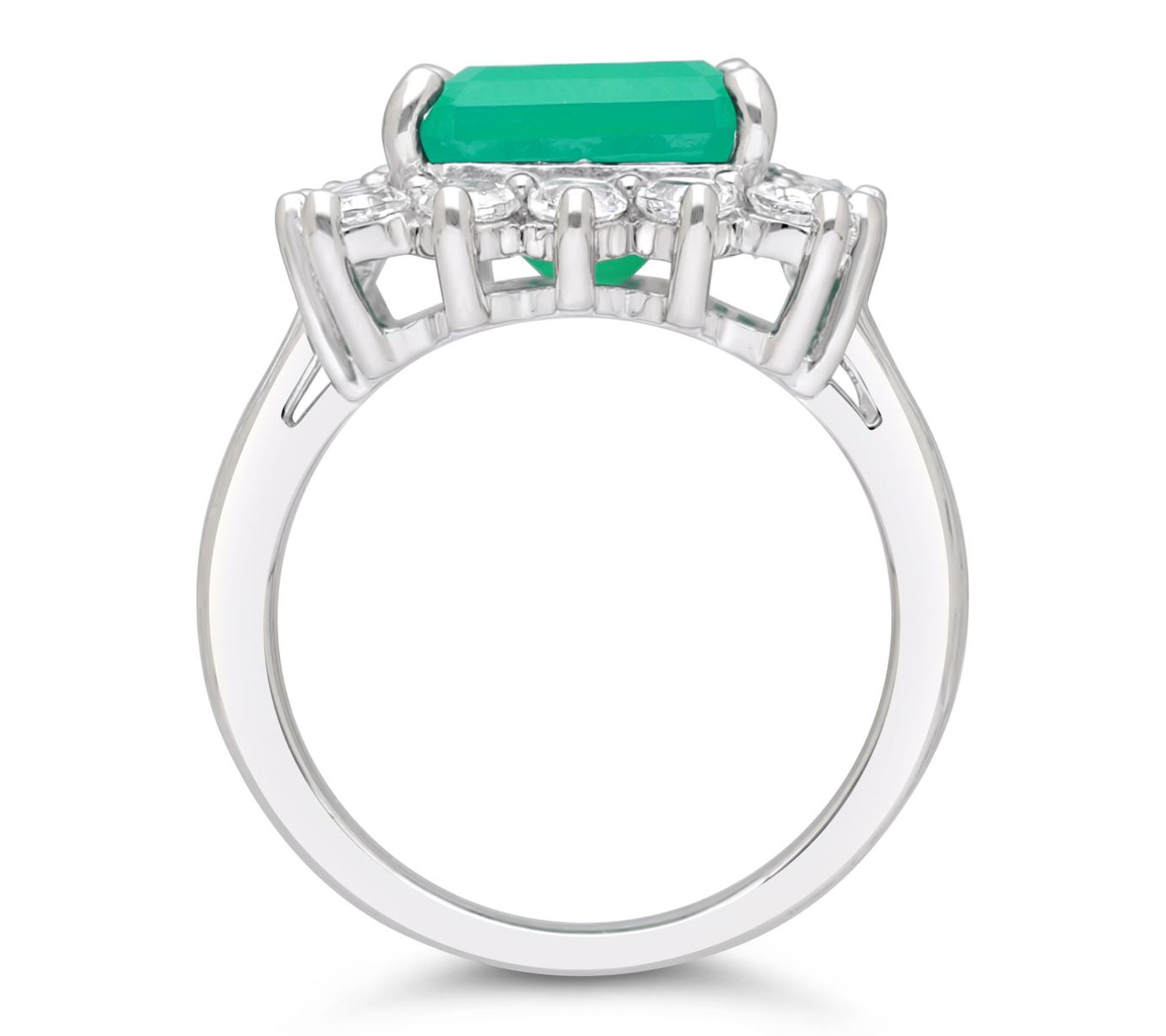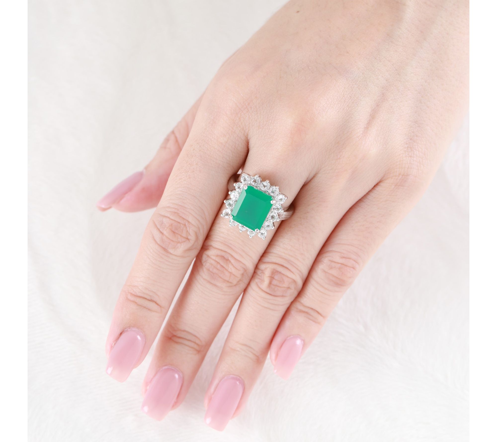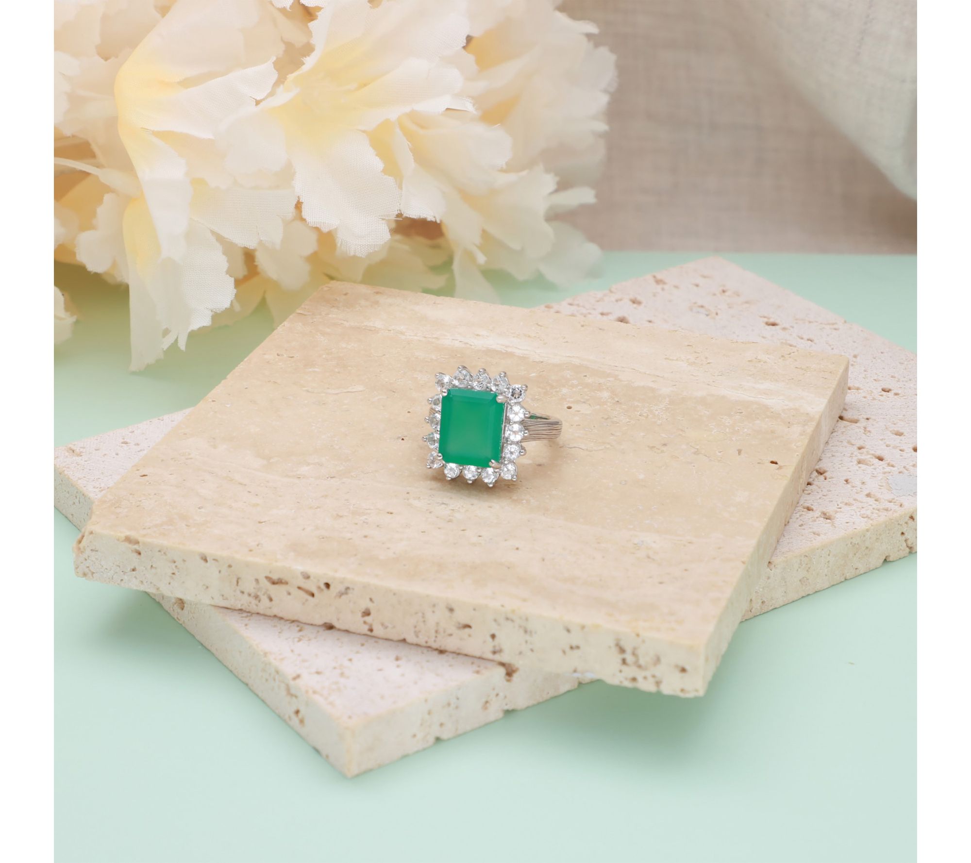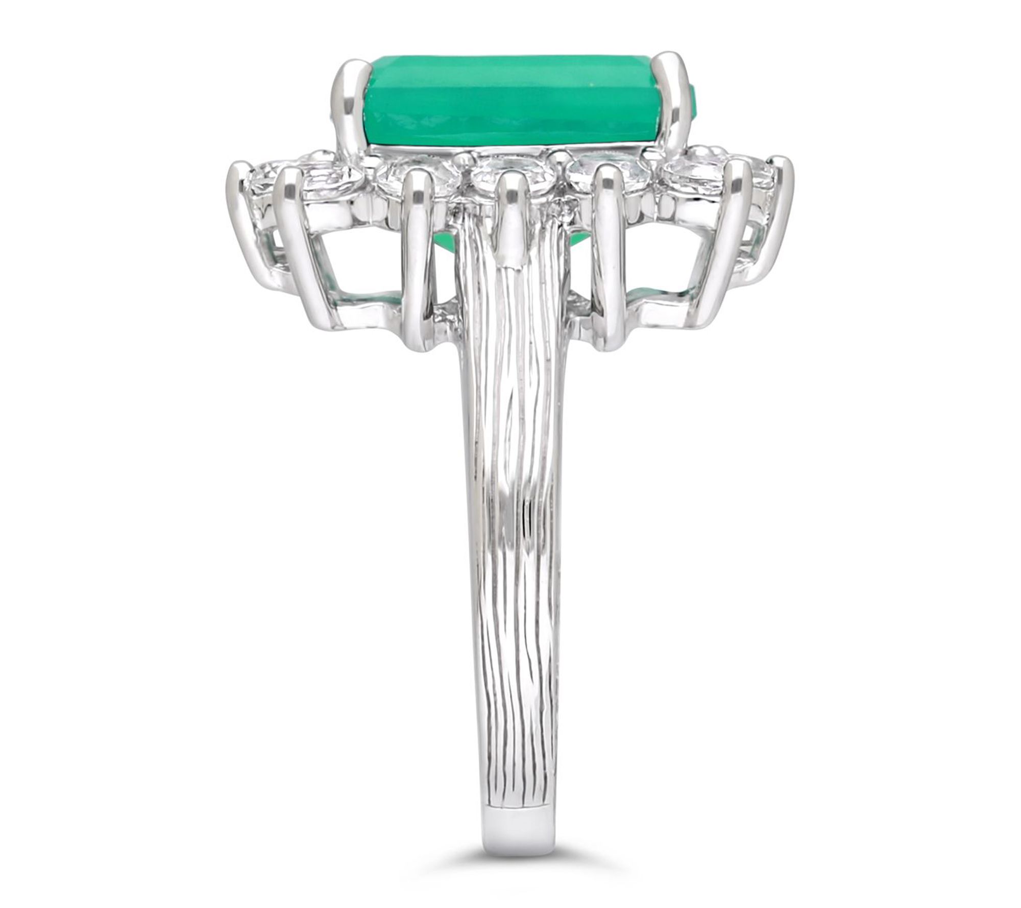 Octagon-cut green chalcedony center; frame of round white topaz stones; silk-textured shank