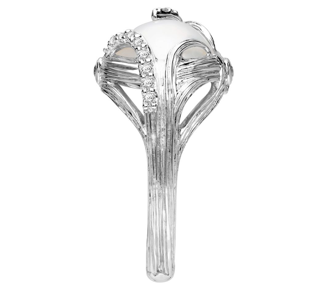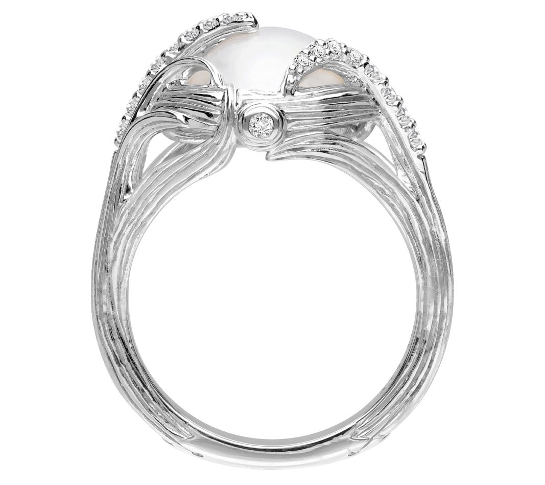 - Ring with round, prong-set cultured freshwater mabe pearl and round-cut, prong-set white topaz; silk texture wrap