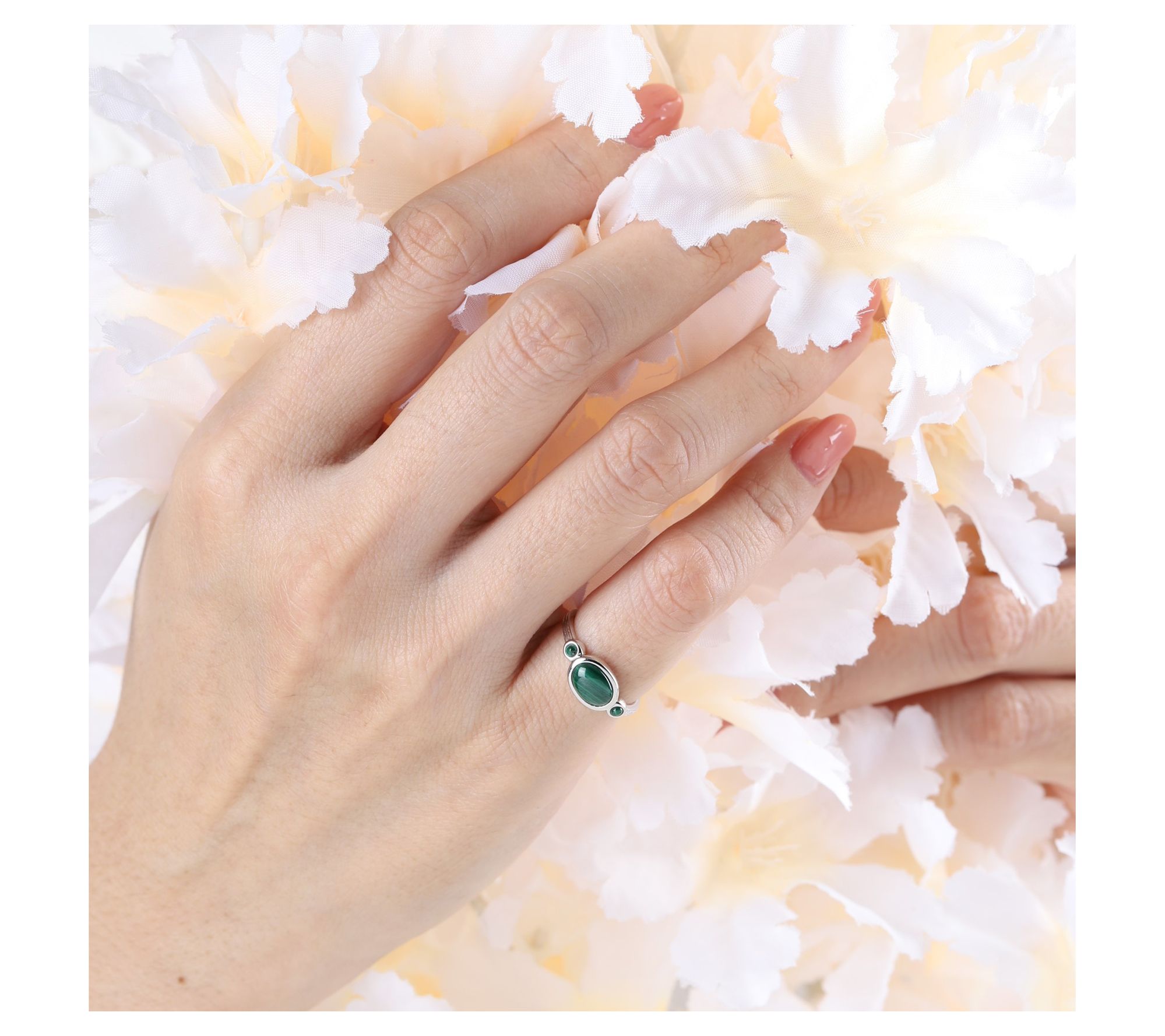 Chic, stylish, and right for any occasion, the Capri ring features the captivating green of malachite stones. The petite silk-textured band is crafted from sterling silver, creating a dreamy, timeless look. (Perfect for that pink finger!) From Ariva.
