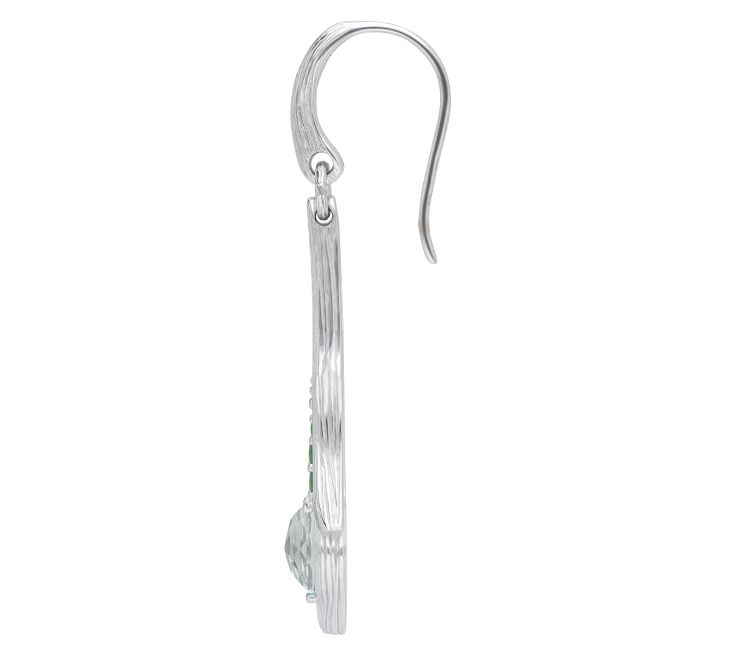 • Linear drop earring; silk texture with oval prong-set mint green quartz stone at bottom; three round pave-set white tsavorite stones