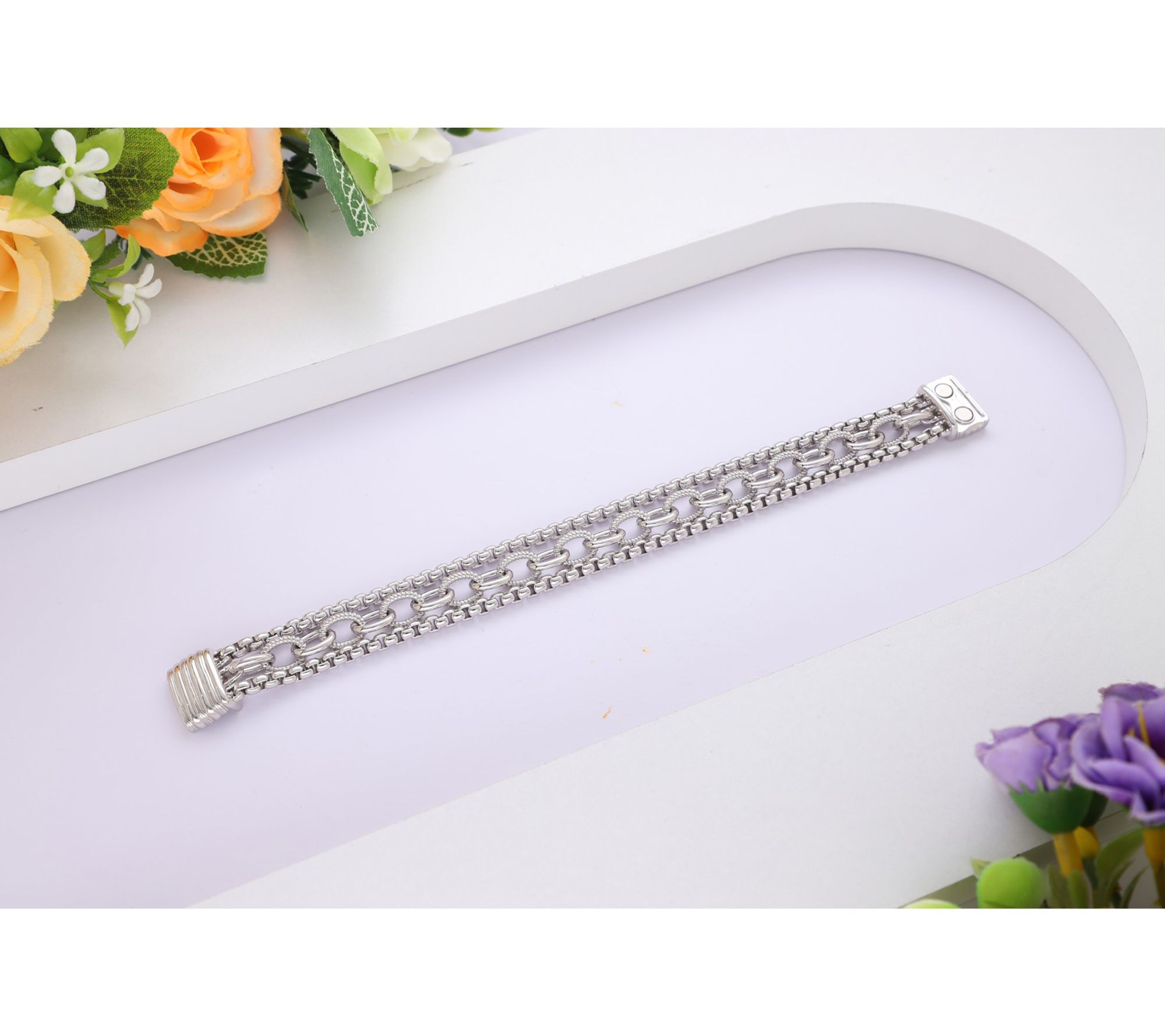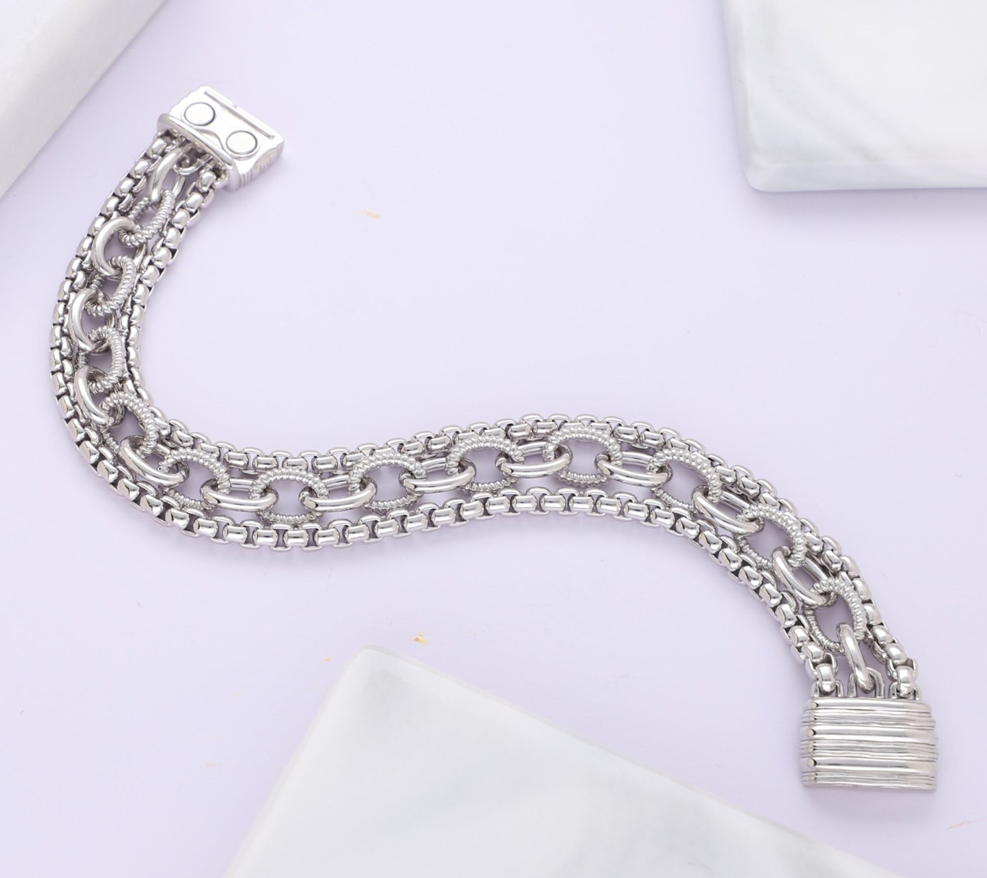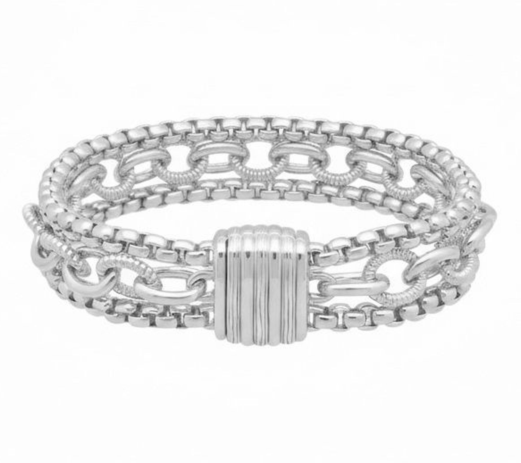 • Features two box chains with chunky textured oval-link chain in center; magnetic clasp for security and ease of wear