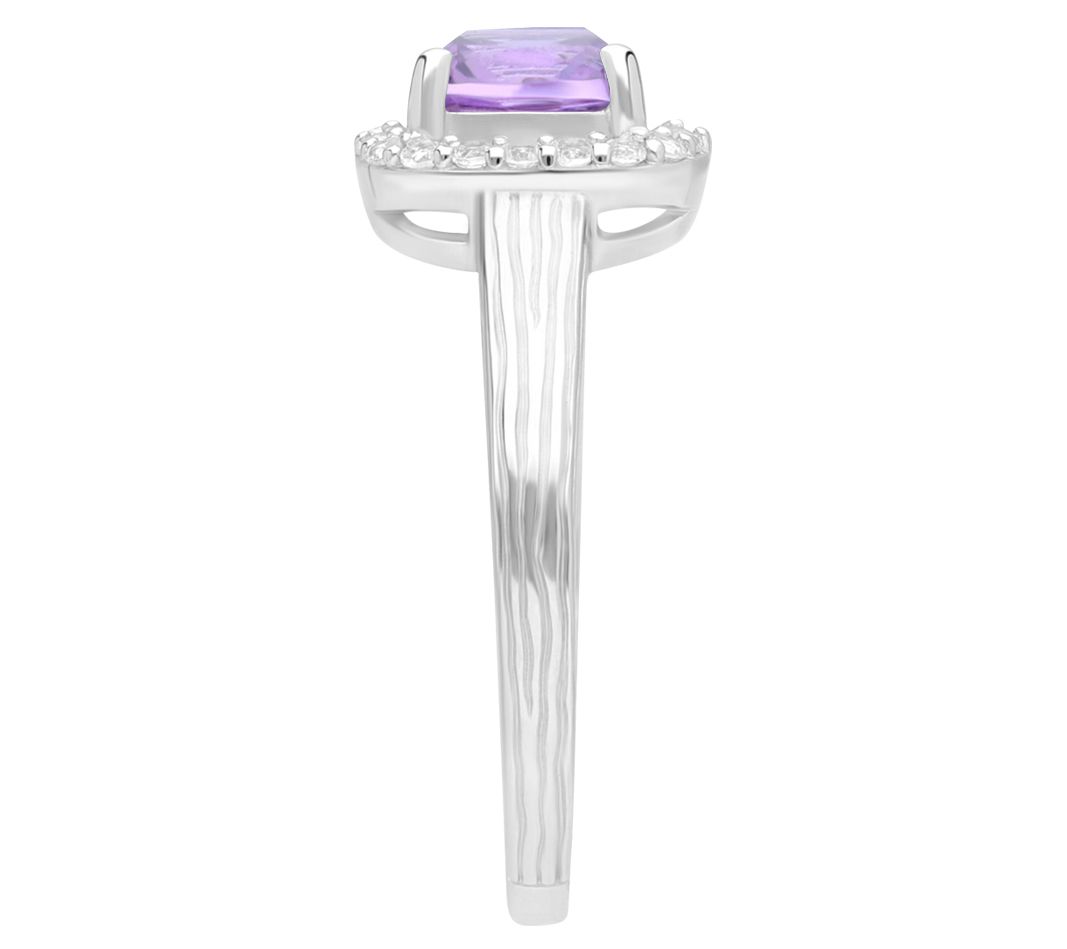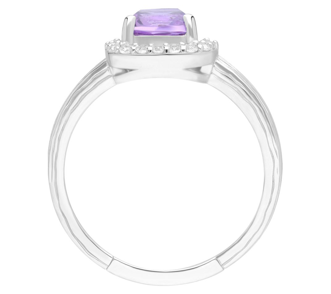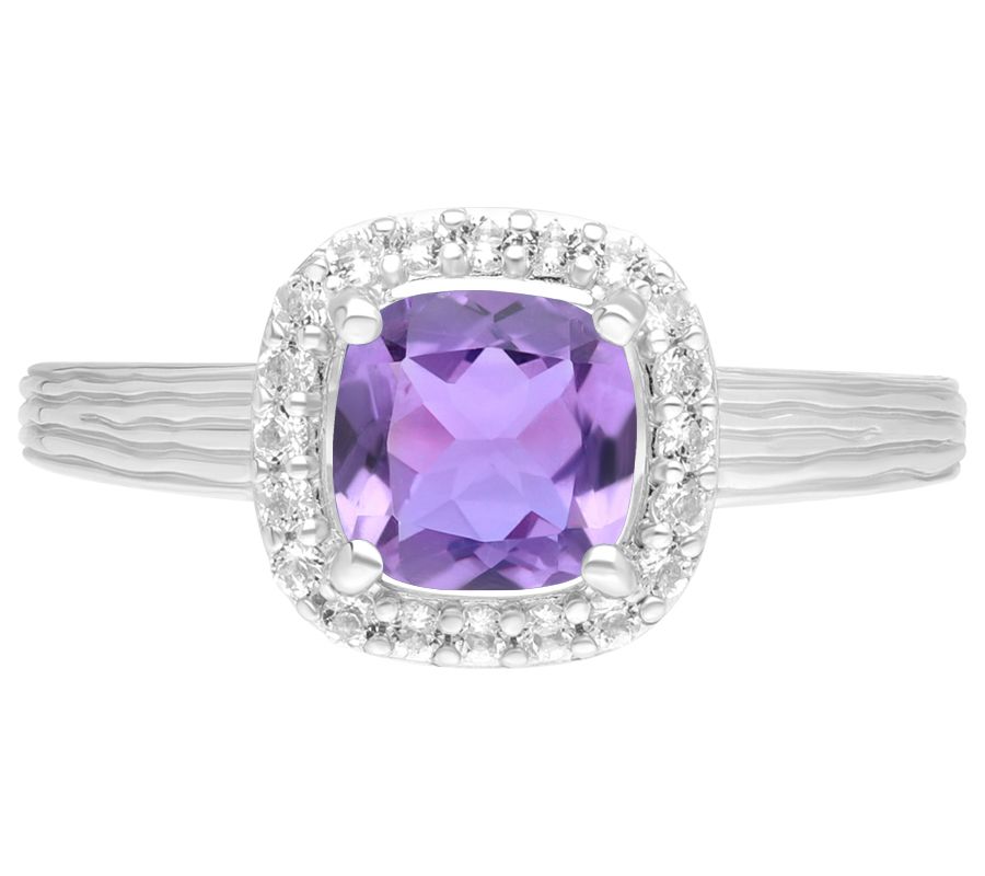 • Prong-set, cushion-cut gemstone surrounded by pave-set white topaz halo; silk-textured sides and shank
