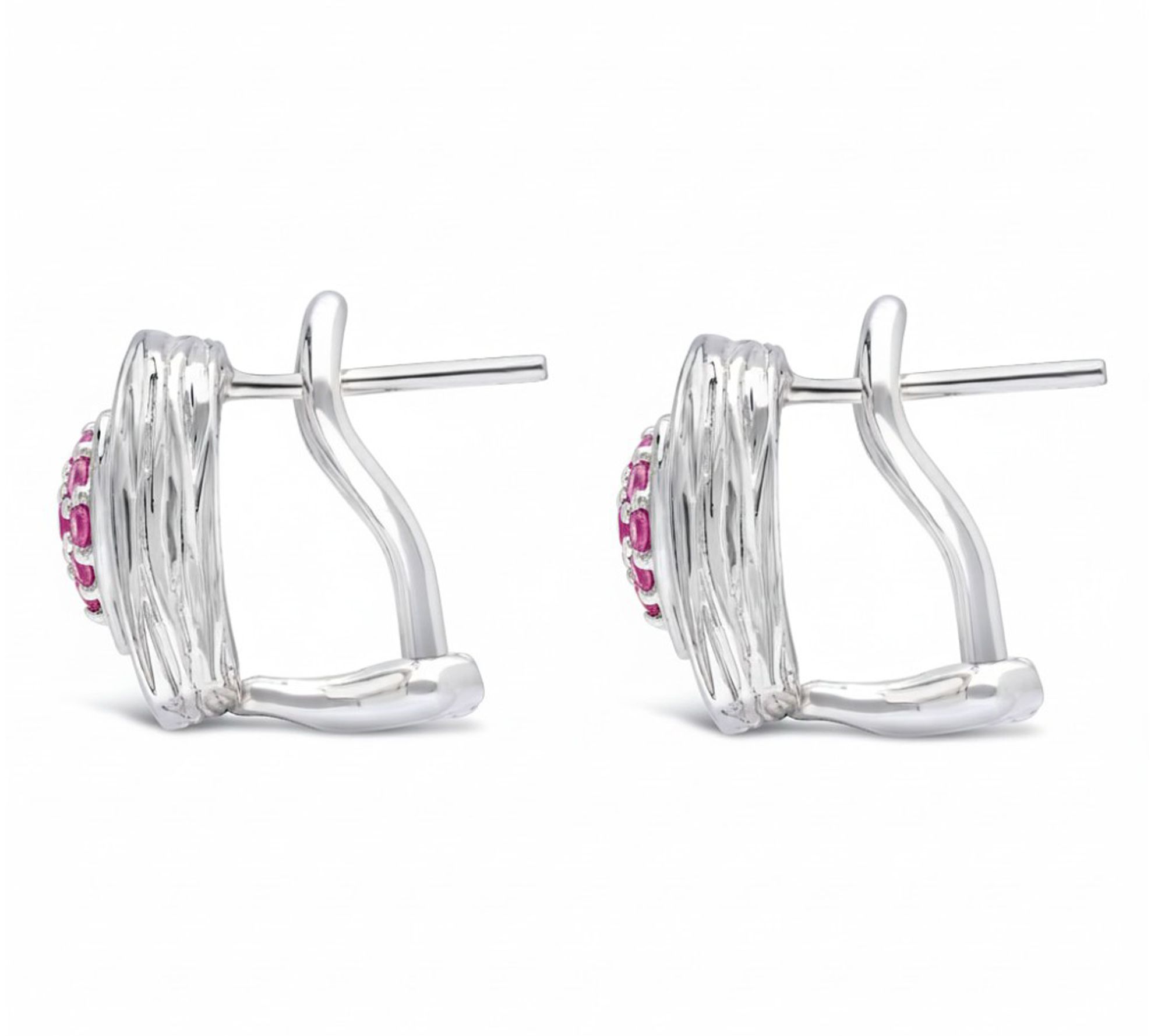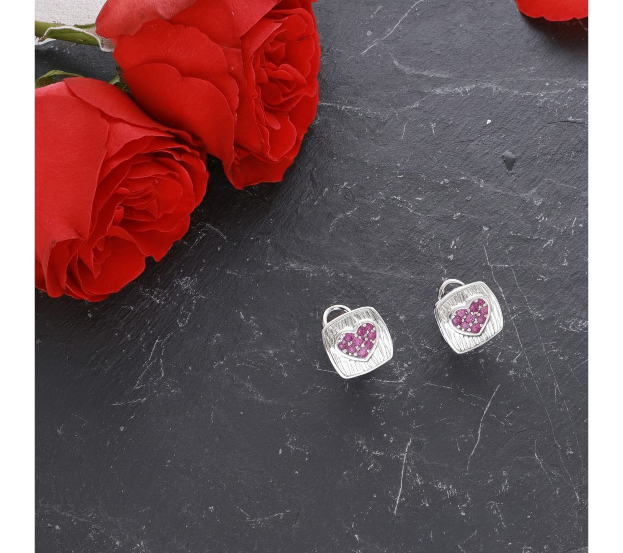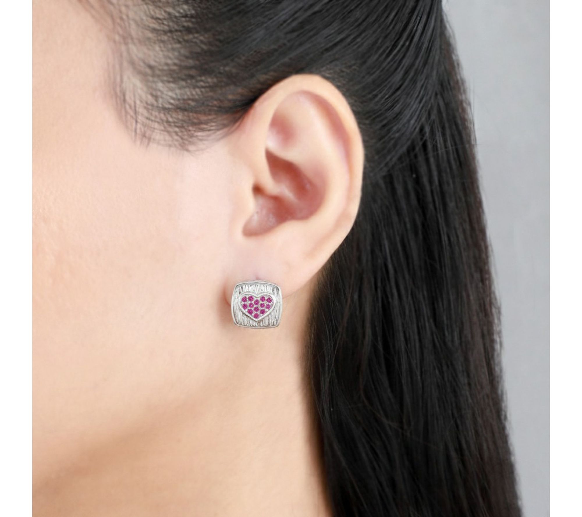 Whether it's a romantic dinner or a sweet everyday moment, these sterling silver earrings add a loving touch to any look. A silk-textured heart beautifully frames sparkling pave-set pink sapphires, making each button style shimmer with charm. From Ariva.