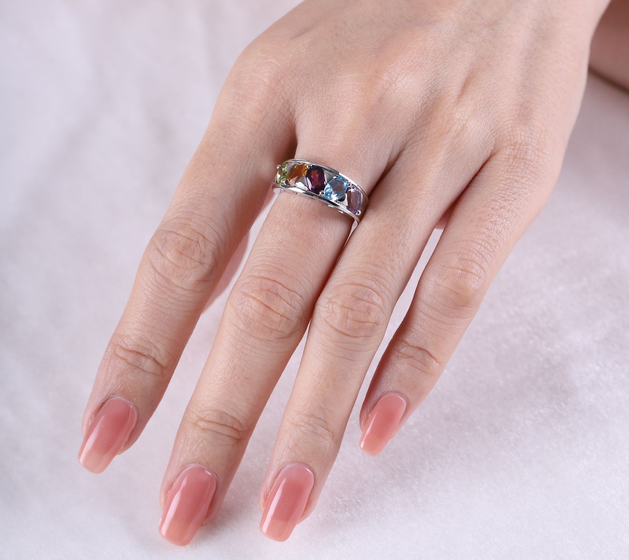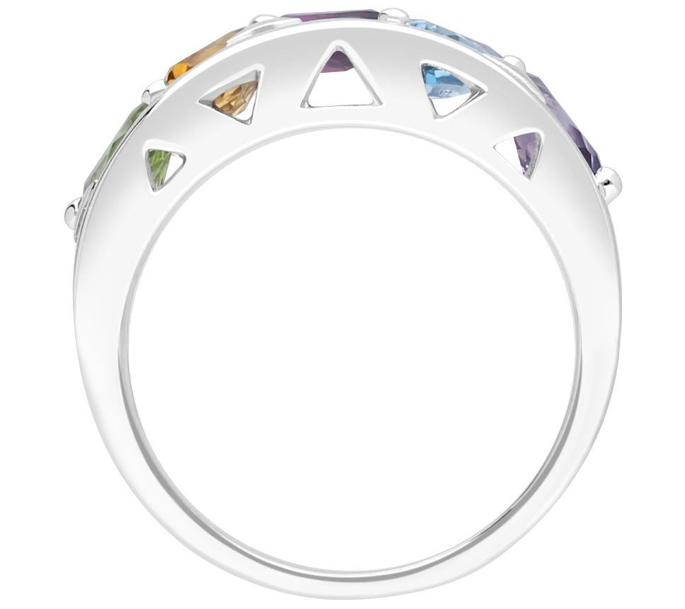Adorn your finger with the vibrant hues of the Ariva sterling silver rainbow gemstone ring. This stunning band features a mix of oval faceted gemstones including peridot, citrine, rhodolite, Swiss blue topaz, and amethyst, creating a rainbow of color that will brighten any outfit. From Ariva.