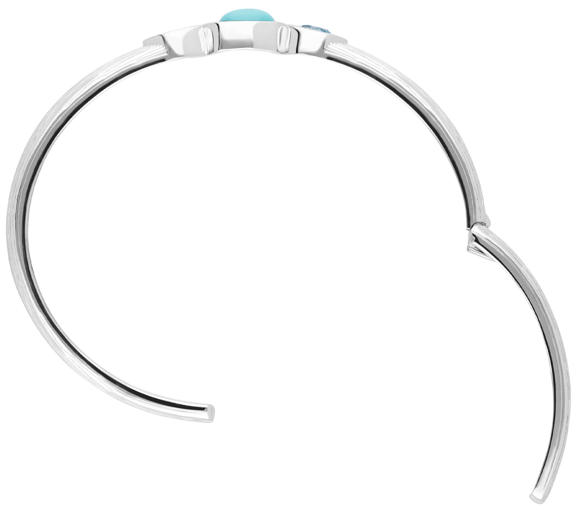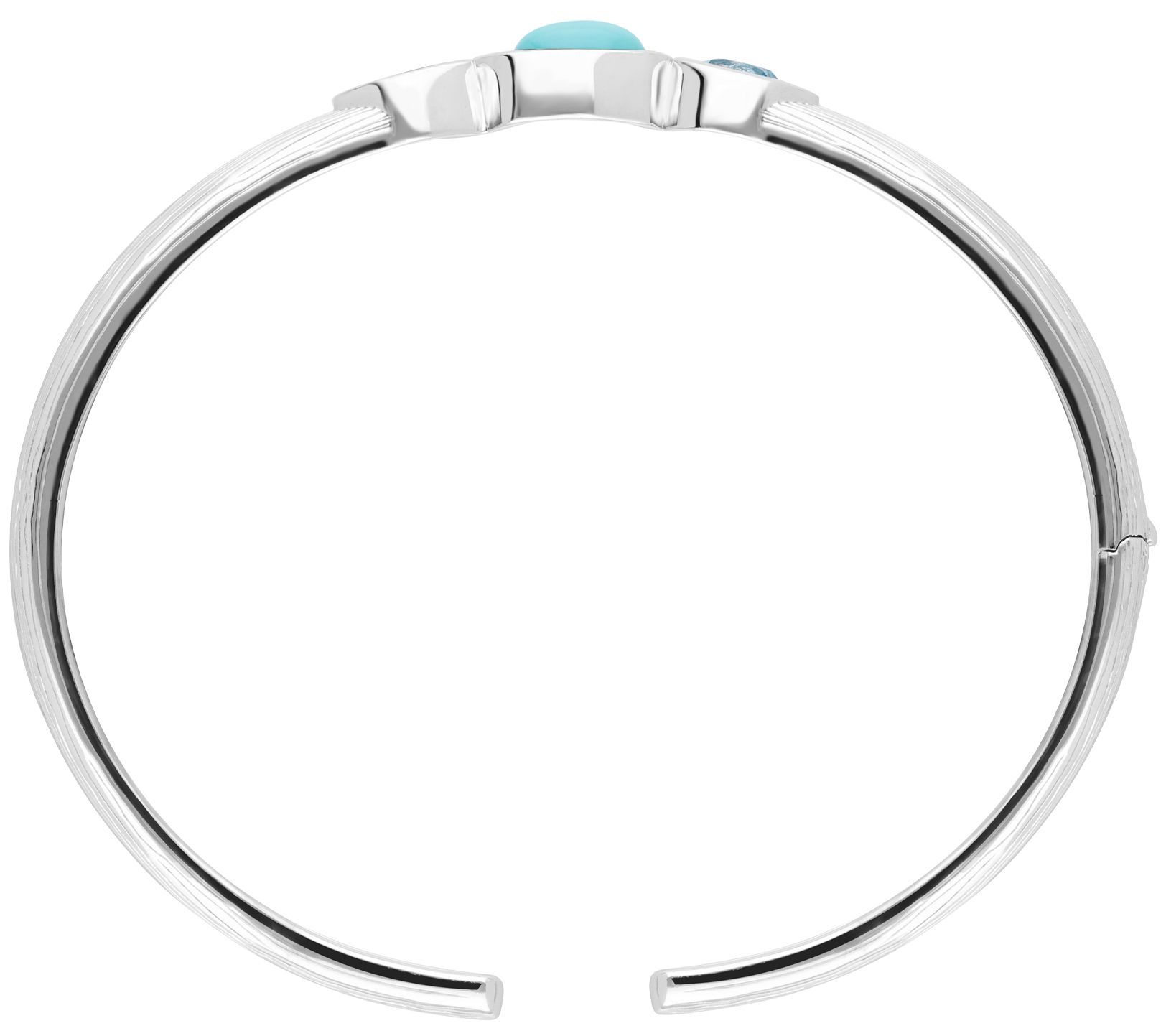• Oval, bezel-set turquoise with round, bezel-set blue sapphire, and Swiss blue topaz on either side; polished finish
