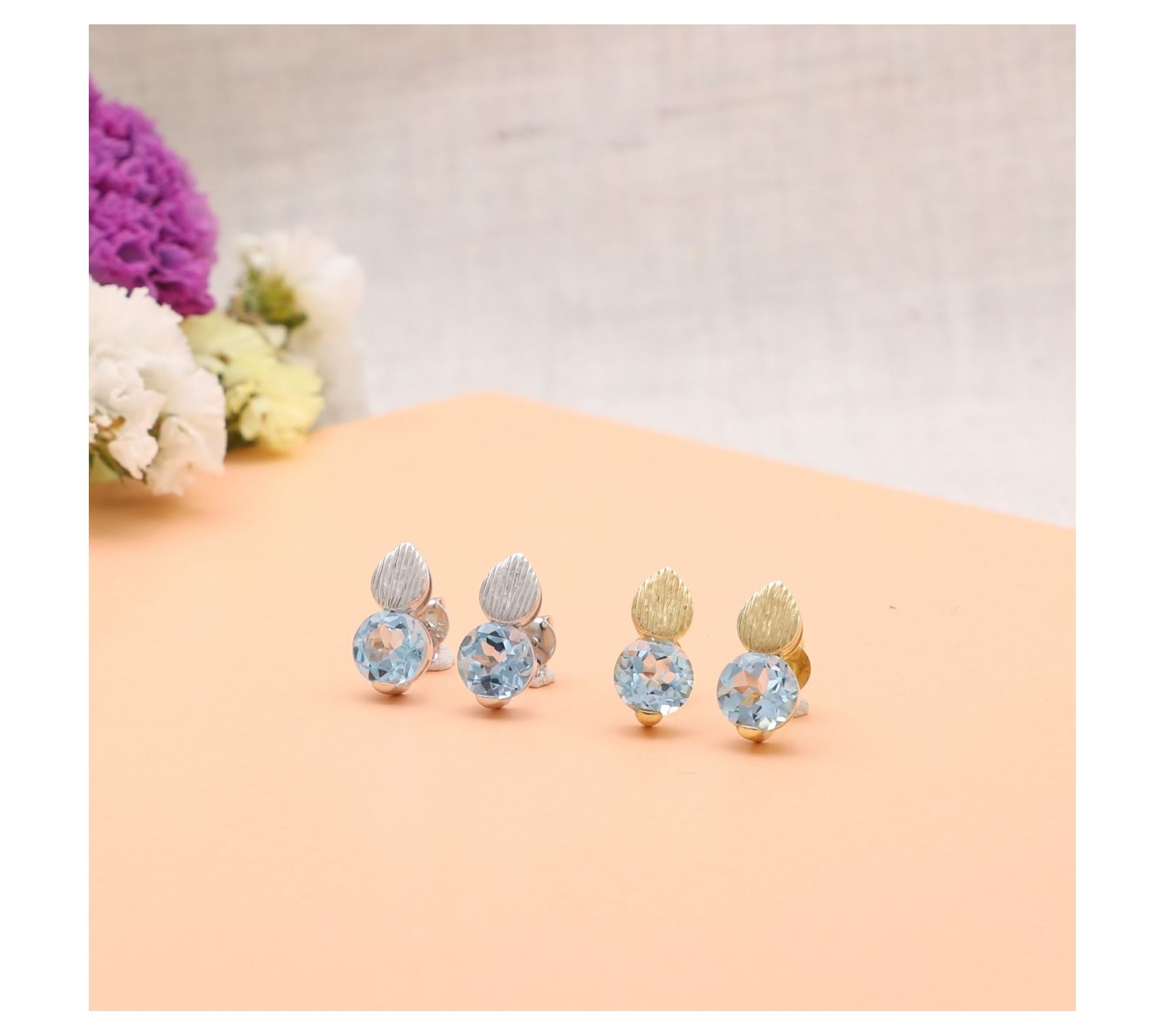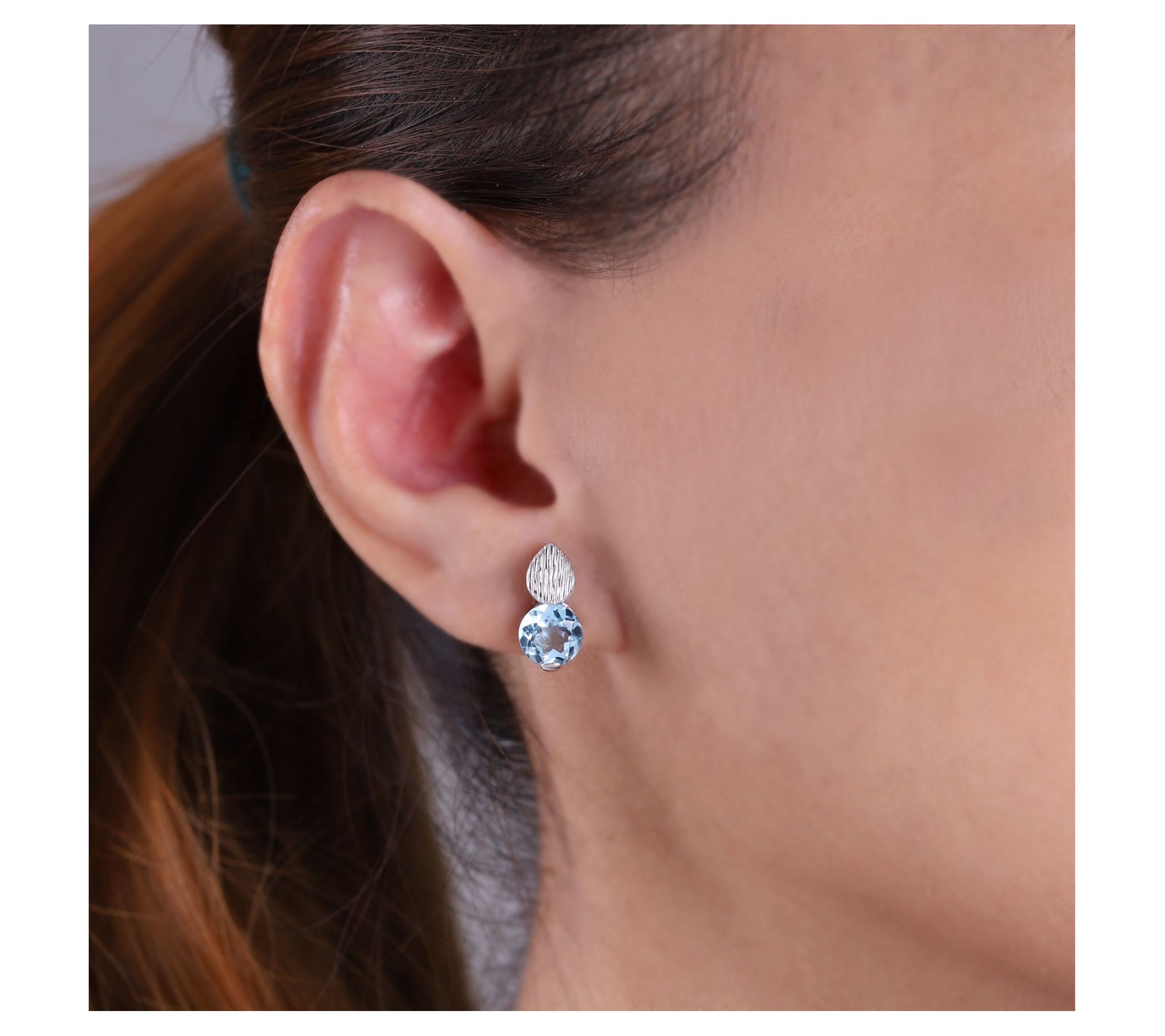 Silk textured teardrop top and sides; 7mm round Swiss blue topaz solitaire bottom