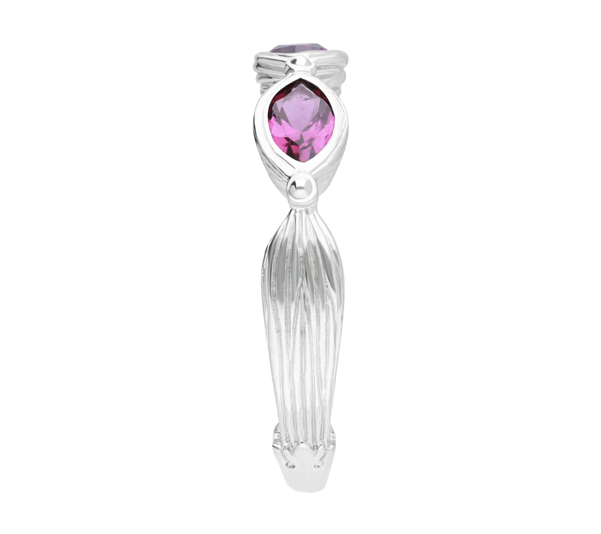 - Three marquise-cut rhodolite gemstones set in polished bezels; silk textured sides and shank