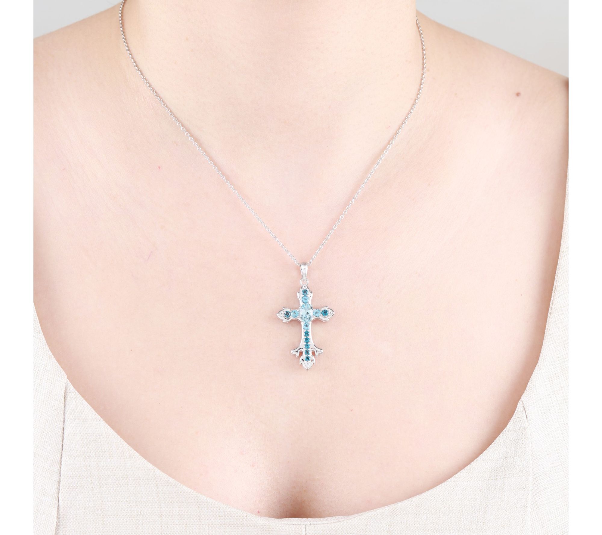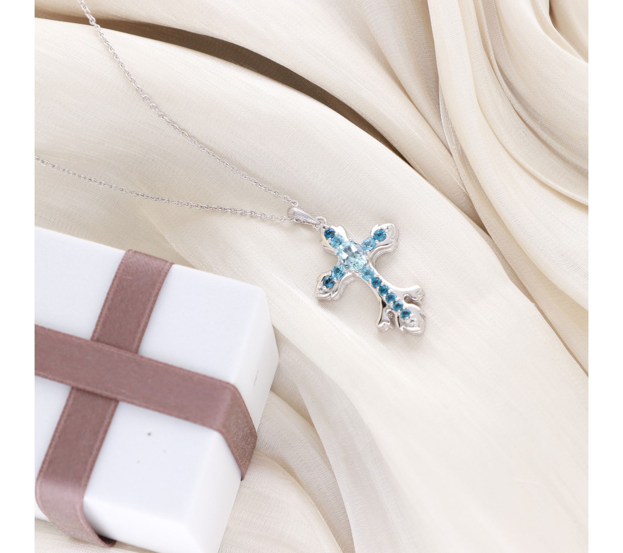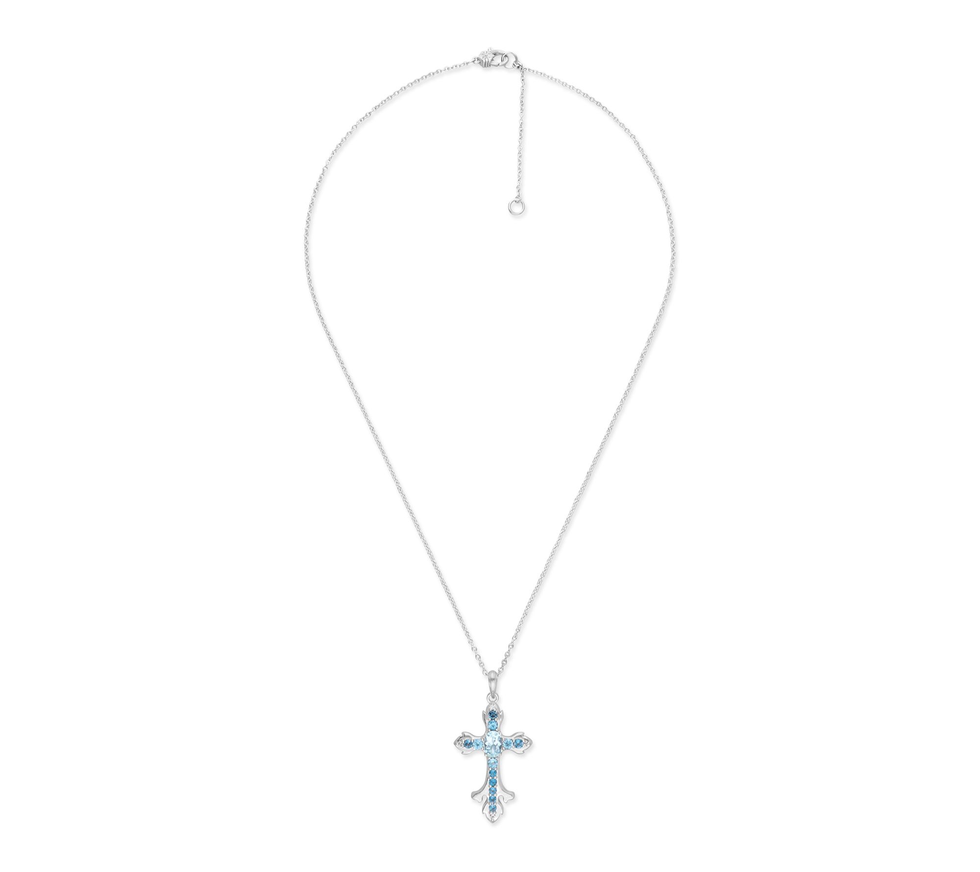 A contemporary twist on a classic symbol, this sterling silver cross pendant adds a vibrant touch to your everyday style. Shimmering with a blend of blue and white topaz gemstones, the pendant catches the light beautifully whether paired with a crisp blouse or your favorite dress. The adjustable chain lets you find just the right fit for any occasion. From Ariva.