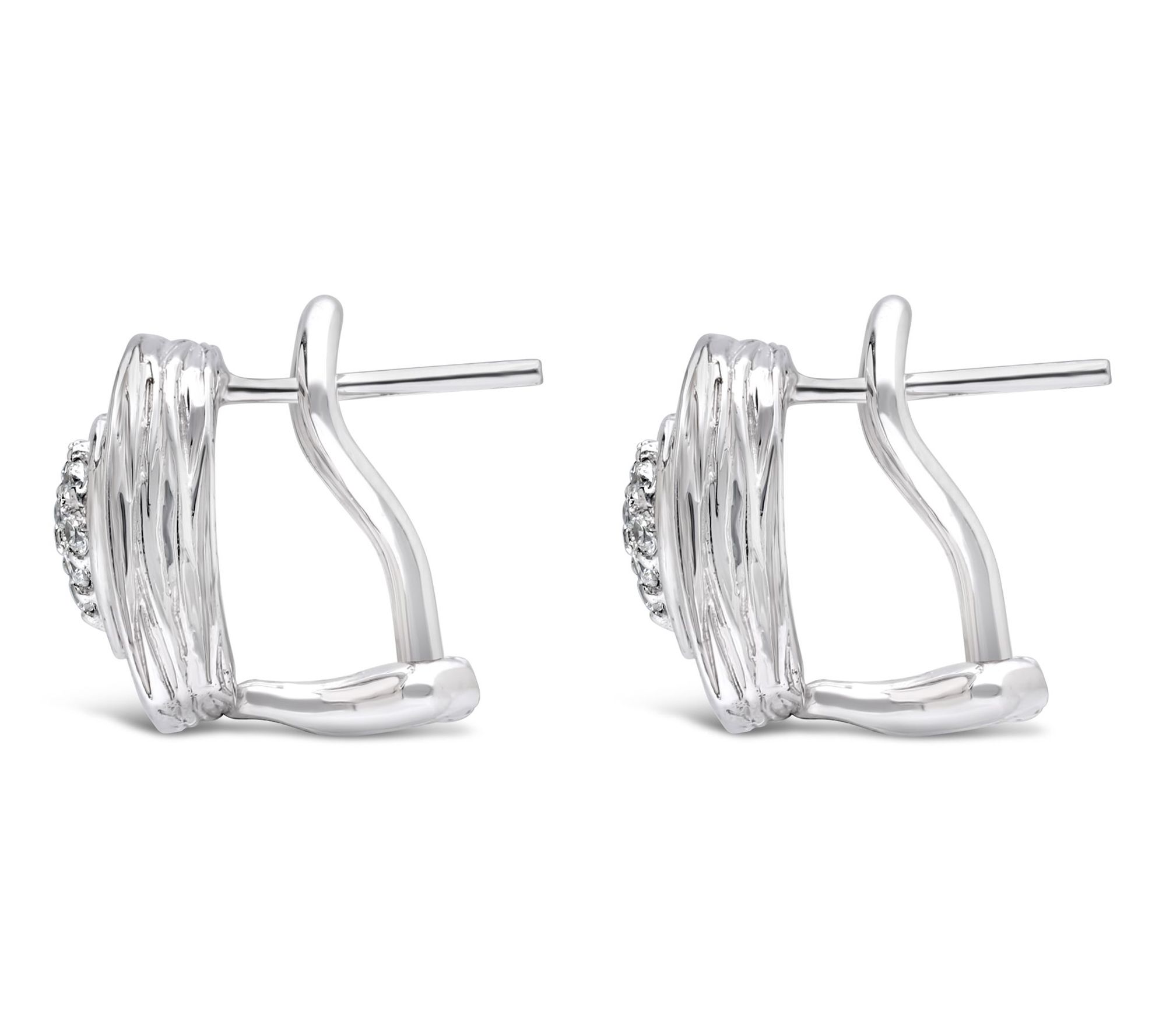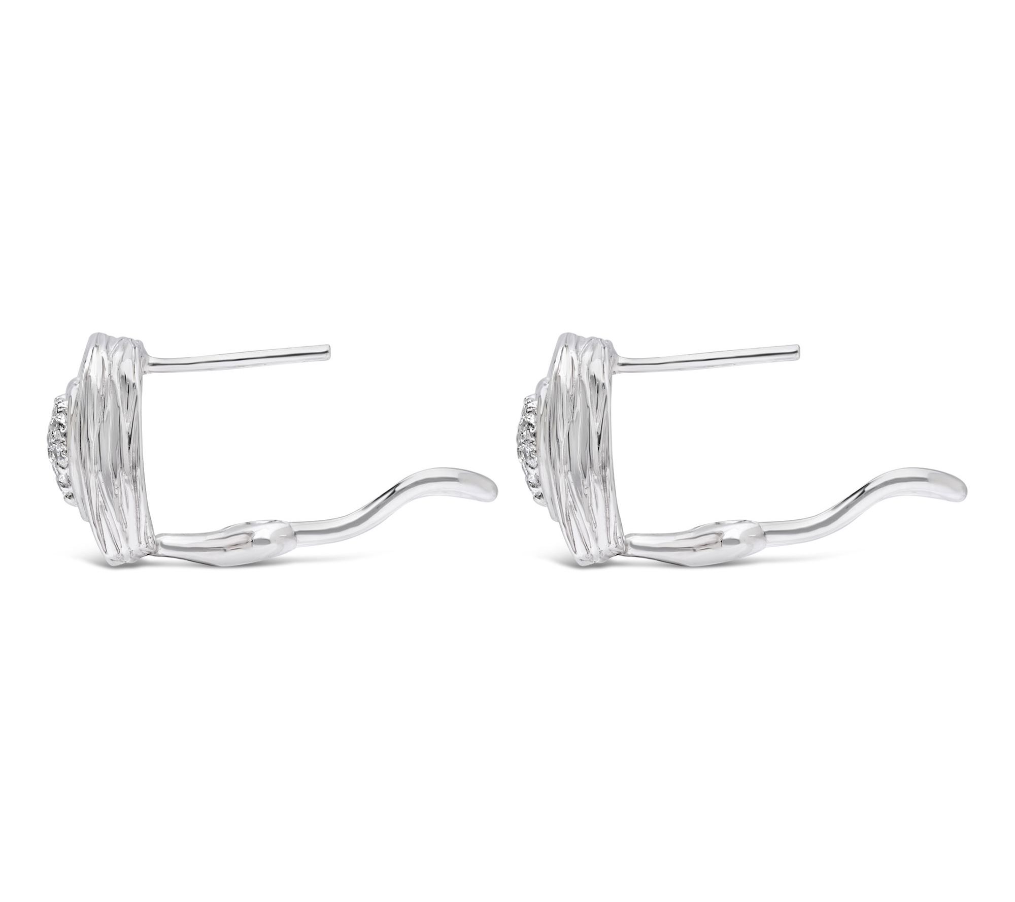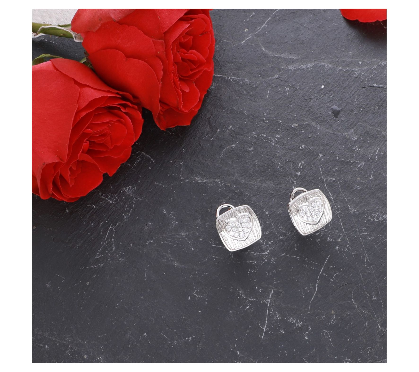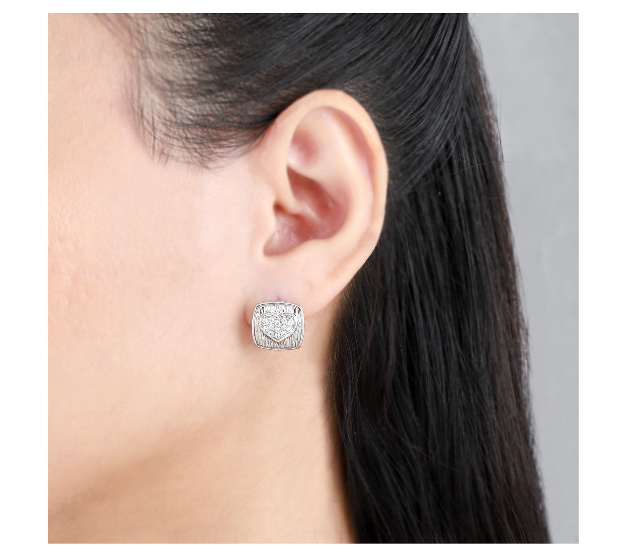 Share whimsical affection with sparkling heart earrings -- crafted from sterling silver and detailed with a silk-textured frame around a pave-set white topaz center, these button-style treasures shine for special celebrations or add a loving accent to everyday outfits. Their petite size and omega backs offer comfort and secure wear. From Ariva.