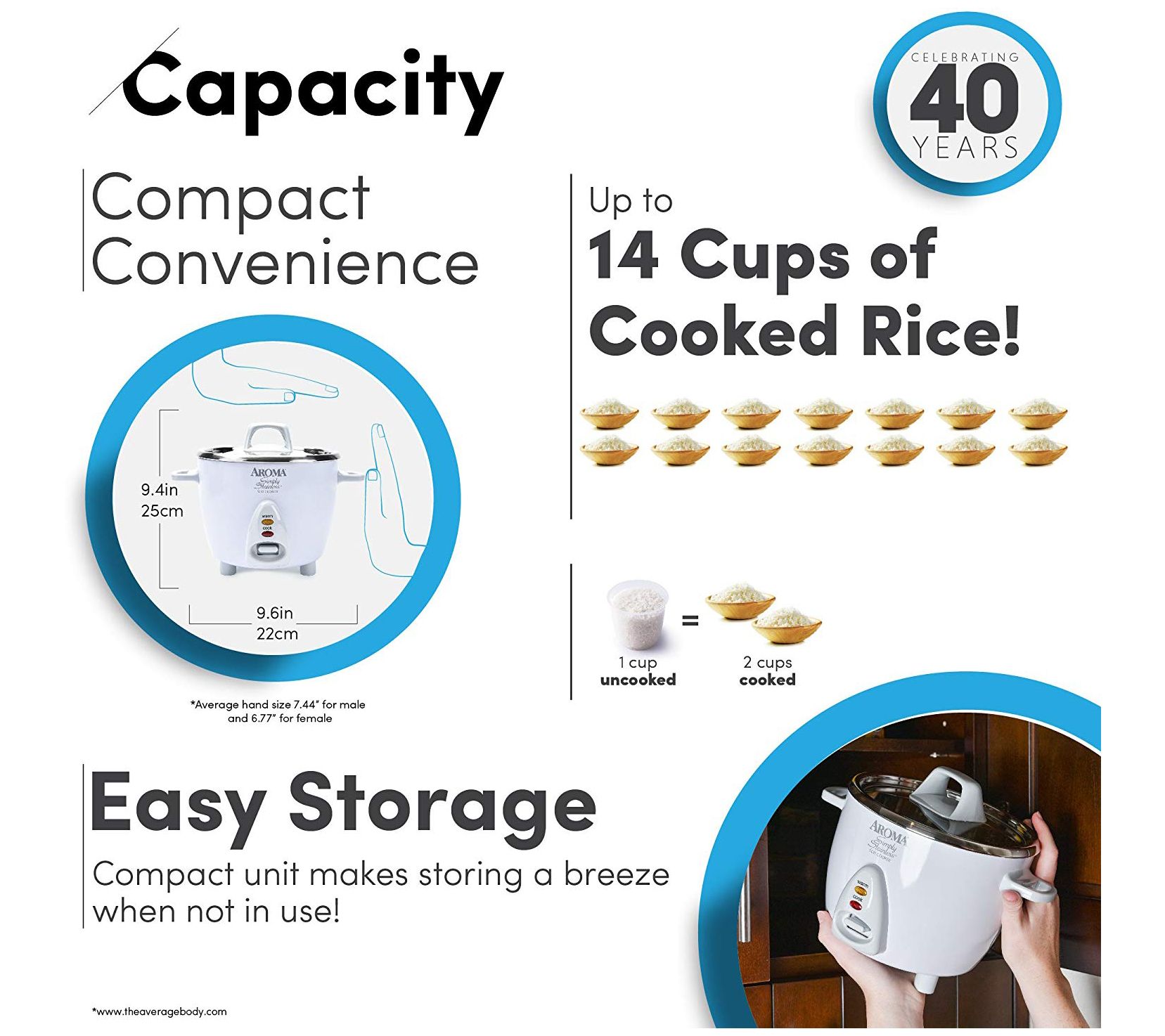 • Approximate measurements: Rice Cooker 12.3"L x 9.6"W x 9.4"H; Cord 3'