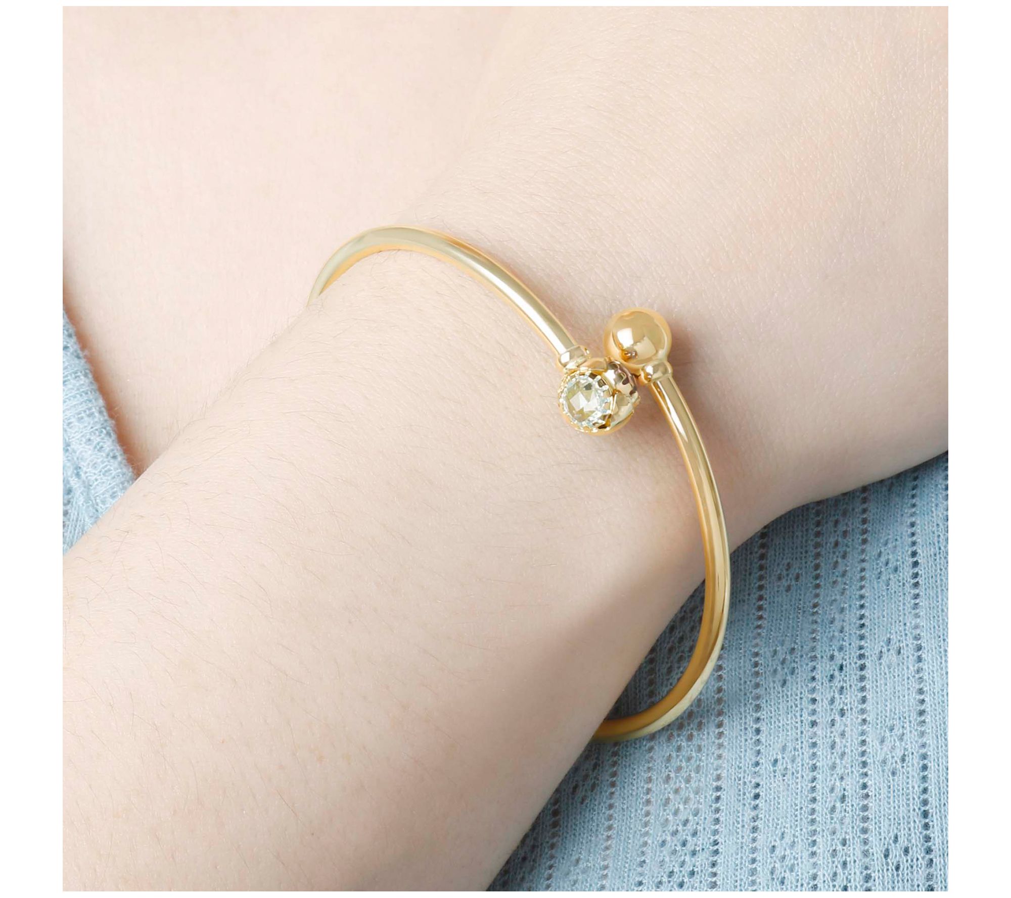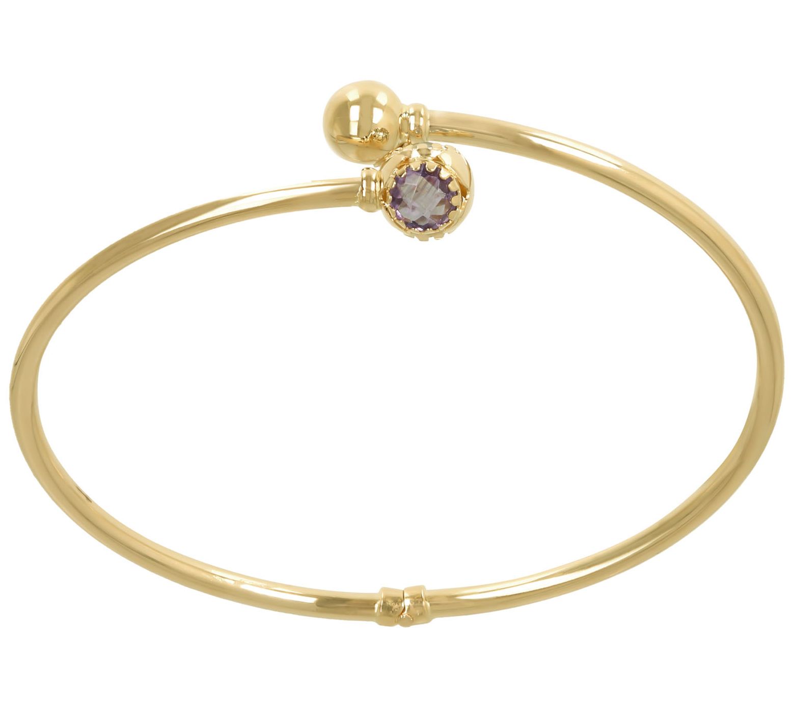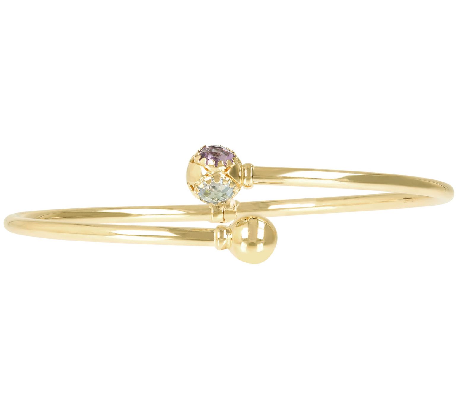 • Bypass bangle bracelet with a polished bead on one end and a bead on the other end with prong-set, round-cut gemstones